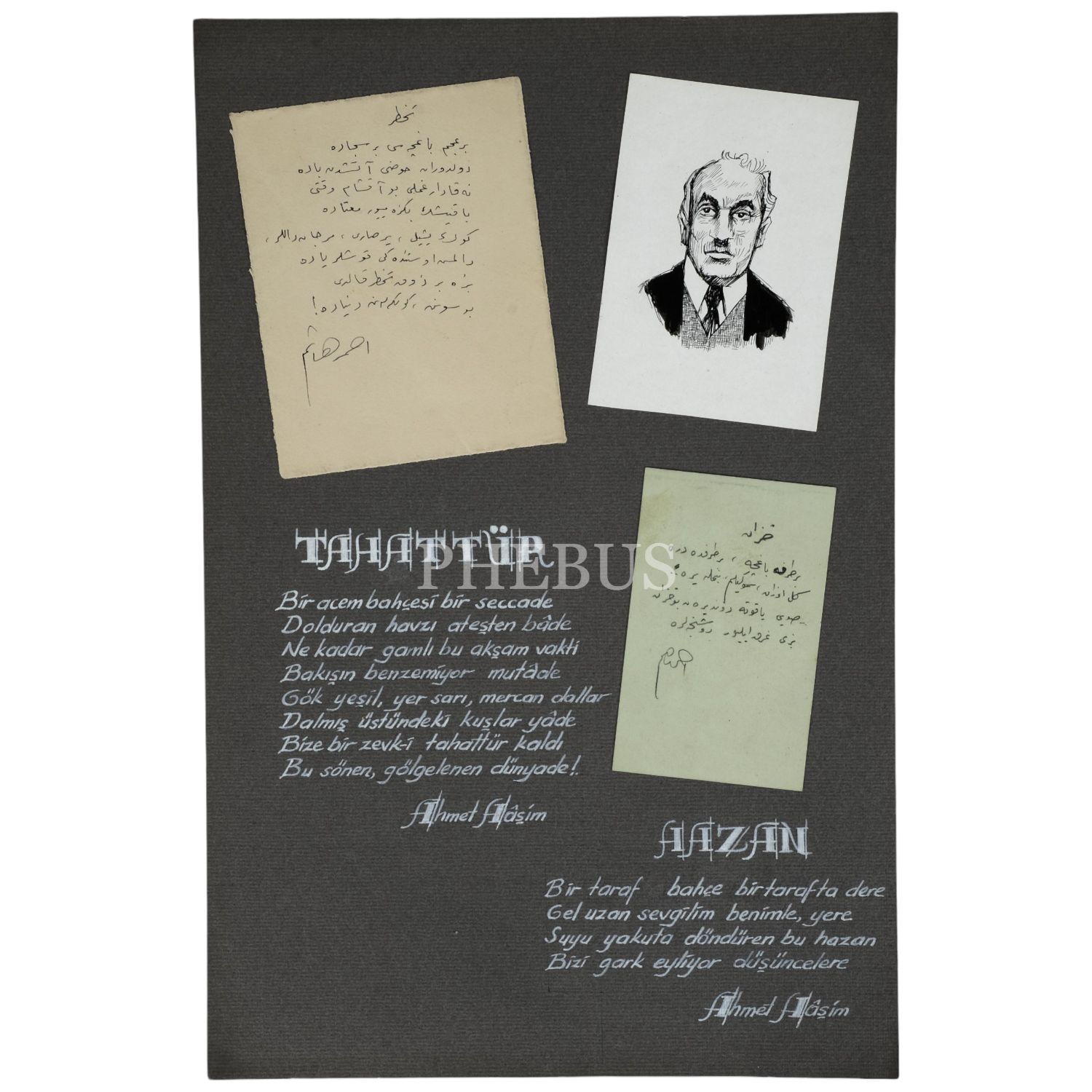 Şairin, Osmanlıca el yazısı şiirlerinin Latin harfli çevirileriyle birlikte yer aldığı kolajda, ayrıca bir de orijinal Ahmet Haşim çizimi mevcuttur.