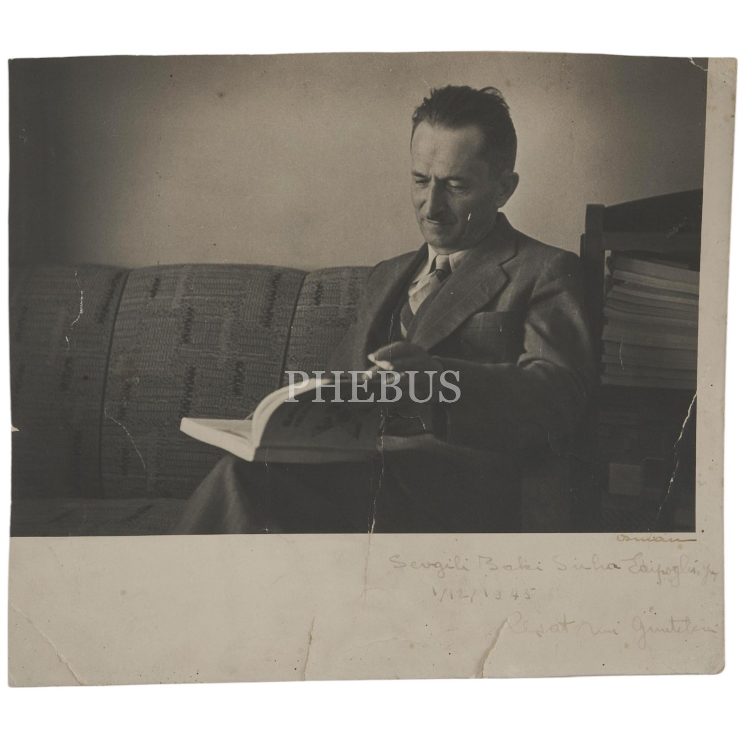 Türk edebiyetının en büyük romancılarından Reşat Nuri Güntekin´in kitap okurken çekilmiş bir fotoğrafı... "Sevgili Baki Süha Edipoğlu´ya" ithafıyla 1 Aralık 1945 tarihinde imzalanmıştır.
