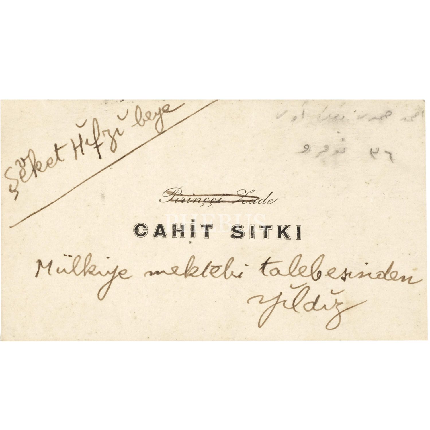 1. Cahit Sıtkı Tarancı´nın Mekteb-i Mülkiye öğrencisiyken yazılarını severek okuduğu Şevket Rado´yla tanışmak için Şevket Rado´nun çalıştığı Akşam gazetesine gidip onu orada bulamayınca durumu anlatır bir not yazarak bıraktığı kartviziti, 9x5 cm...