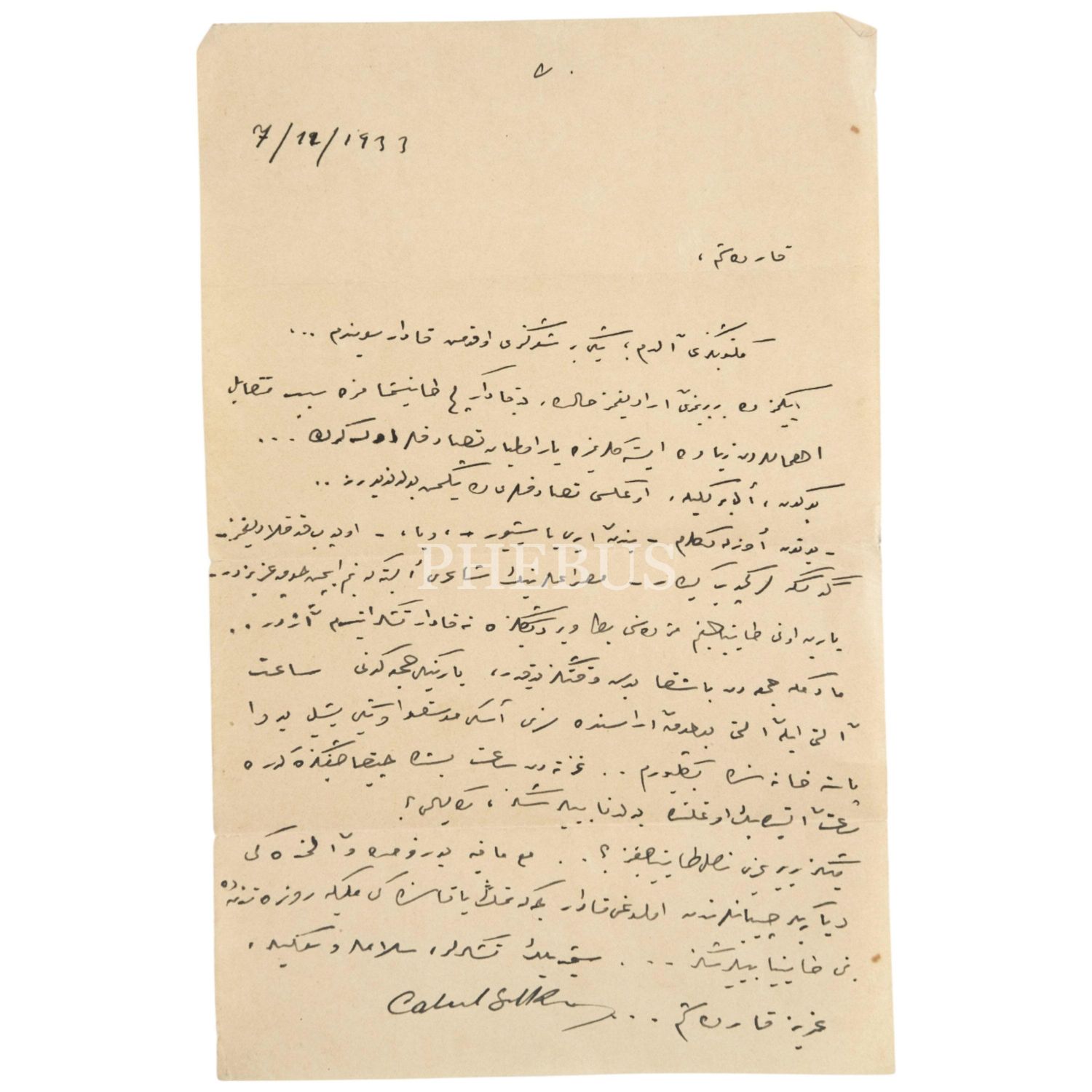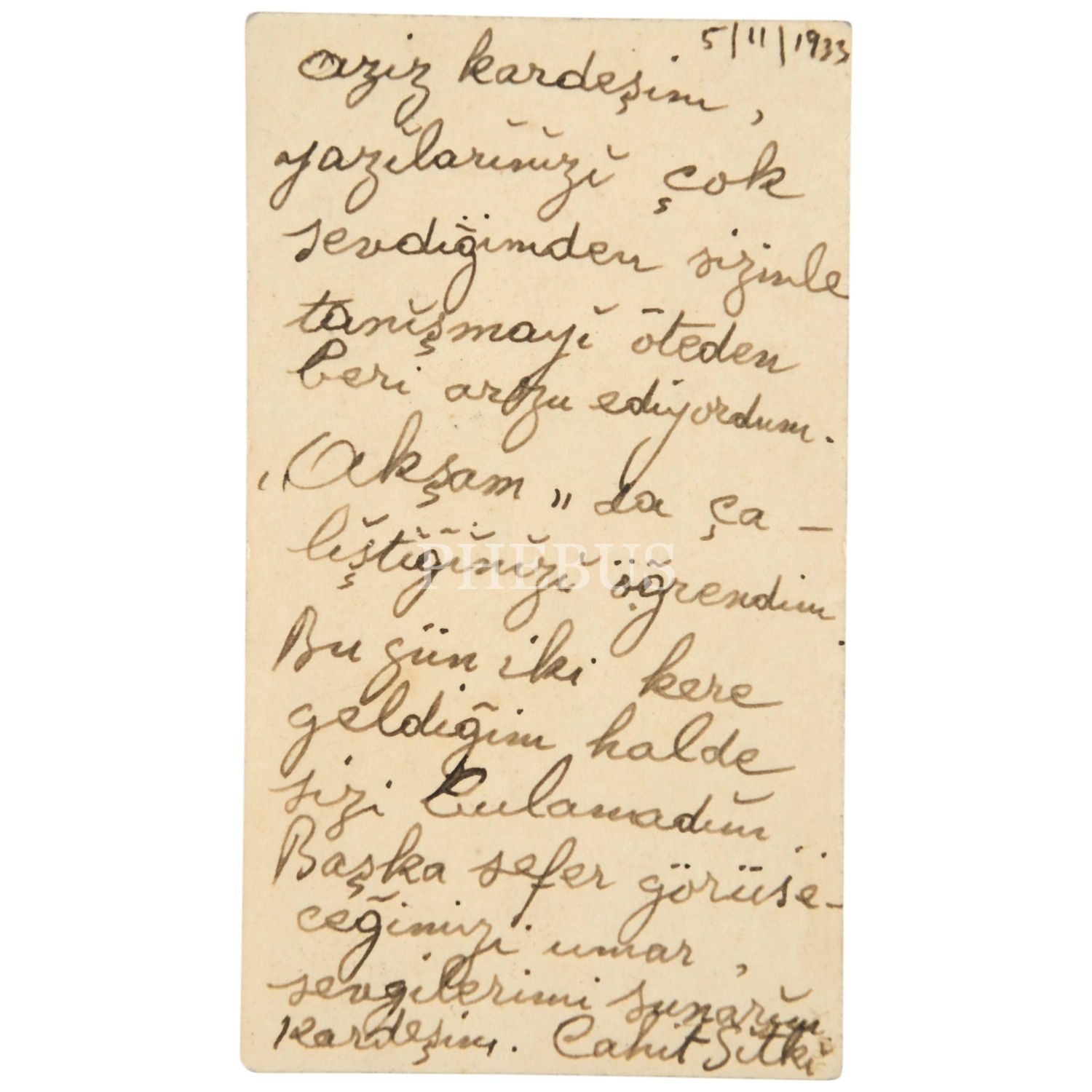 2. Cahit Sıtkı Tarancı´nın, yalnızca şiirlerinden ve yazılarından tanıdığı Şevket Rado´dan yüz yüze tanışma randevusu talep ettiği Osmanlıca mektubu, 1933, 13x21 cm...