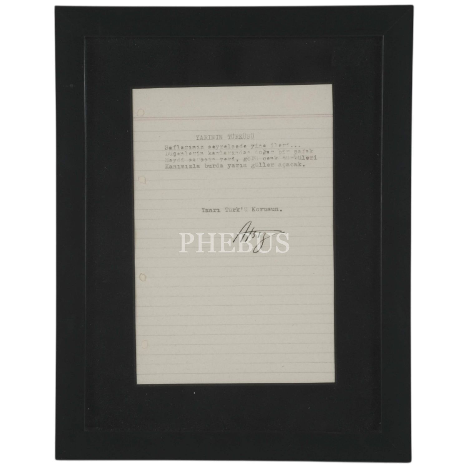 Türkçülük fikriyatının, tartışmasız, en önde gelen kişiliği Nihal Atsız´ın "Yarının Türküsü" isimli şiirinin son dört dizesi ile "Tanrı Türk´ü Korusun" ifadesi daktilo ile kaleme alınmış ve Atsız tarafından imzalanmıştır.