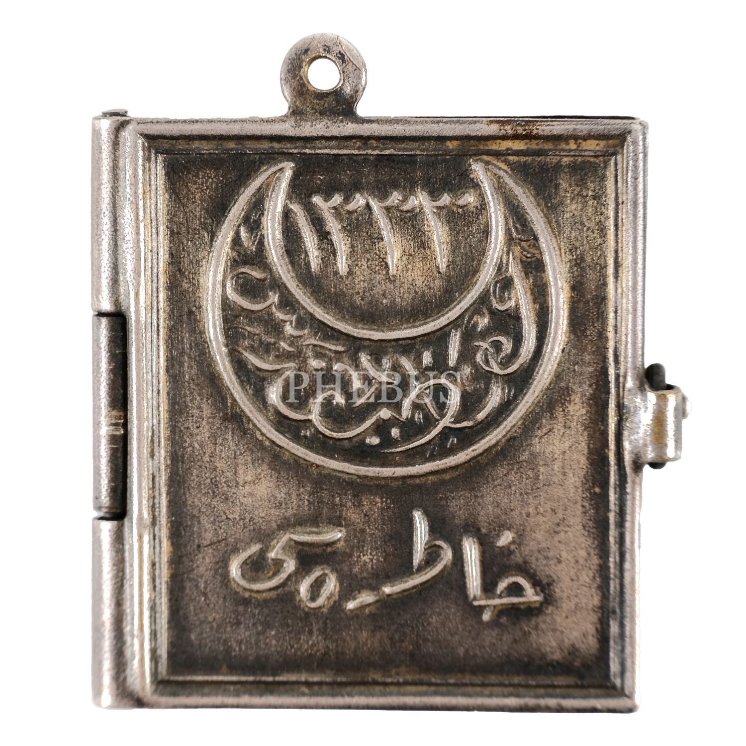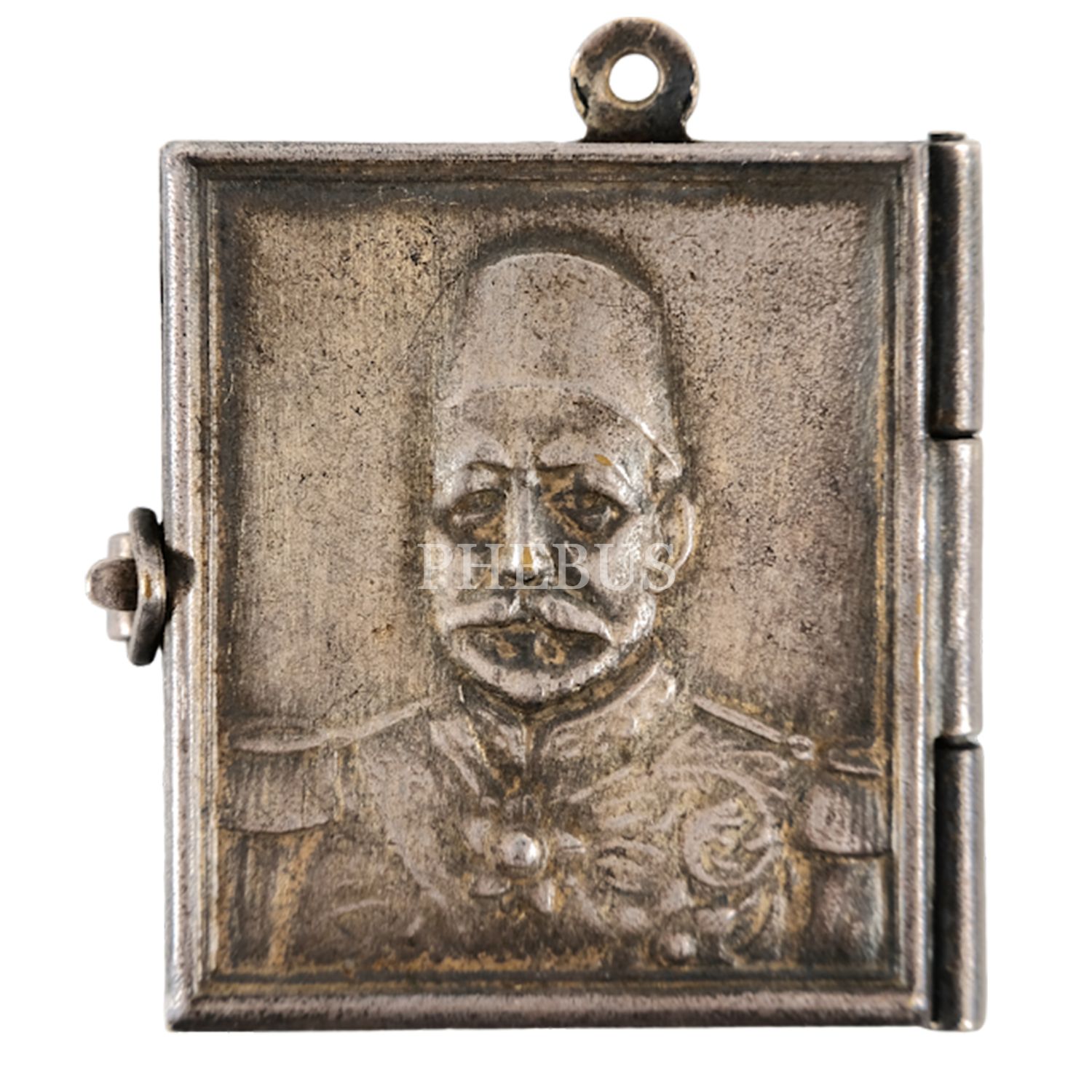 Bir yüzünde kabartma Sultan V. Mehmed Reşat portresi, diğer bir yüzünde "1333 Harb-i Umumi Hatırası" yazılı gümüş kılıfında "Beyanname-i Cihad", sayfaları eksiksiz hali nadirdir, 3x2 cm...
