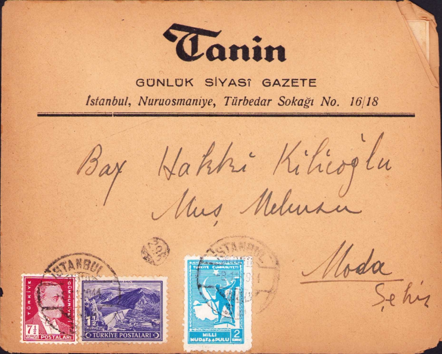 Hüseyin Cahit Yalçın imzalı Türk asker ve siyasetçi İsmail hakkı Kılıçoğlu’na gönderilmiş mektup, Tanin Günlük Siyasi Gazete antetli zarf, 1944 -1945 tarihli, İstanbul - Muş adresli, pullu damgalı