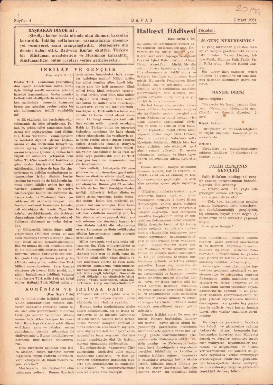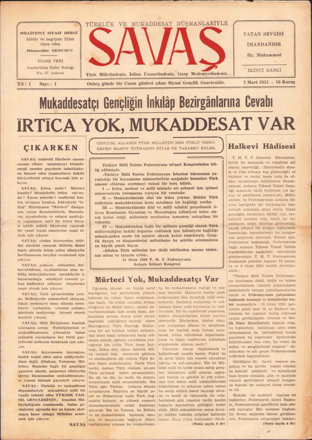 Savaş gazetesi, 1. Sayı 1951, Ankara, 4 sayfa, 24x35 cm