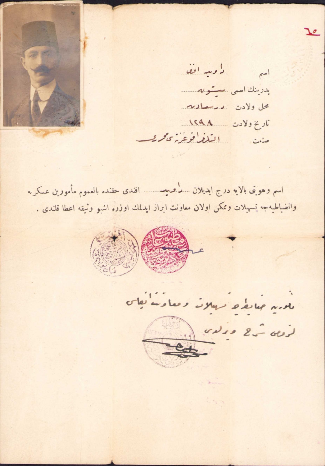 Osmanlı Yahudi gazeteci David Bey'in asker ve zabıtadan yardım istemesine dair gazeteci kimliği, Matbuat-ı Umumiye Müdürü damgalı, 1298, 15x21 cm