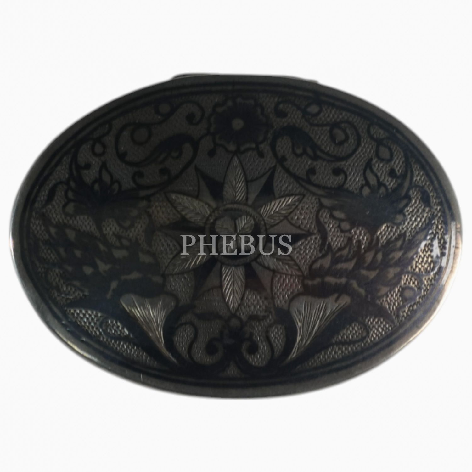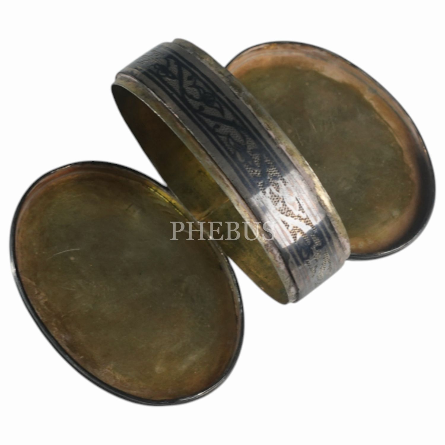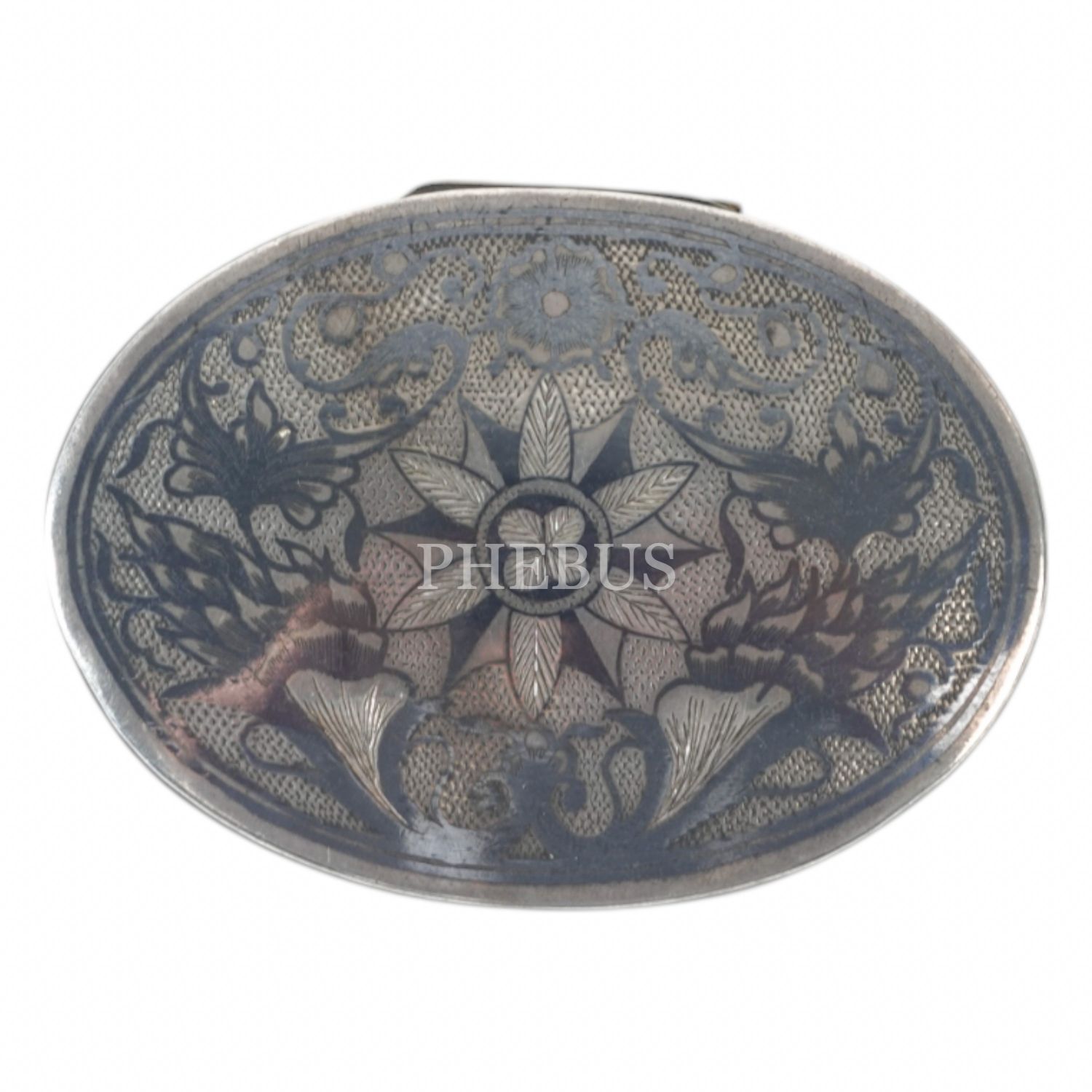 Osmanlı döneminden, savat işçiliğiyle bezeli çift kapaklı gümüş tabaka, 6x2x5 cm, ağırlık 74 gr...