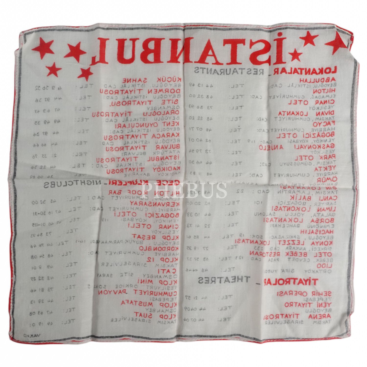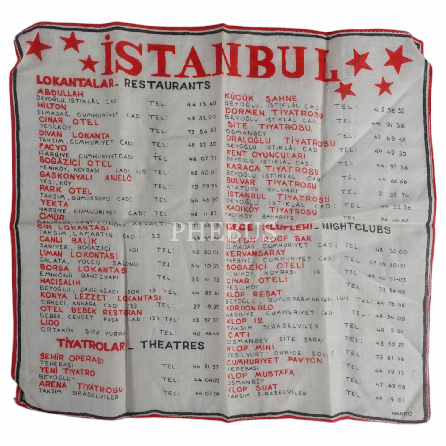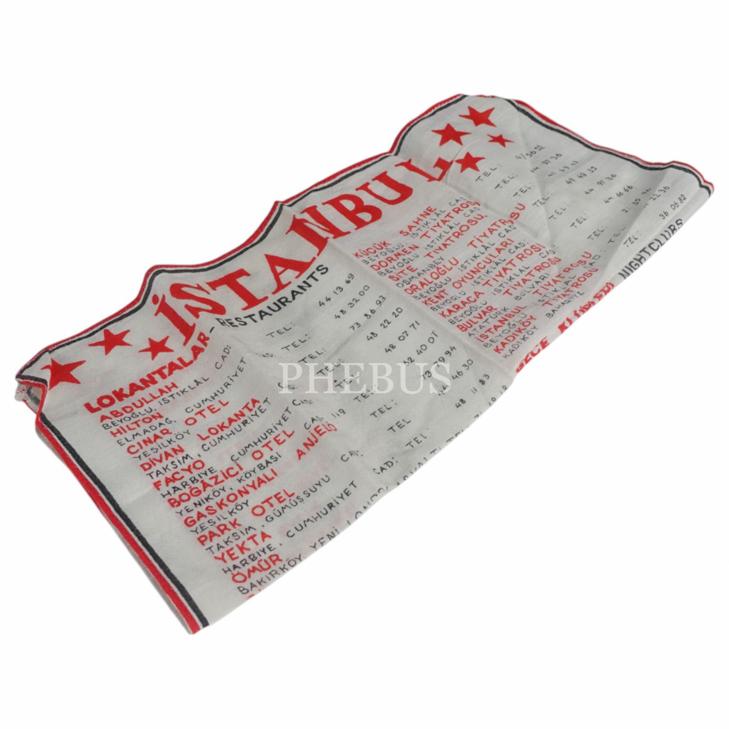 İstanbul´daki lokanta ve tiyatroların adres ve telefon numaralarının yazılı olduğu mendil, 29x28 cm...
