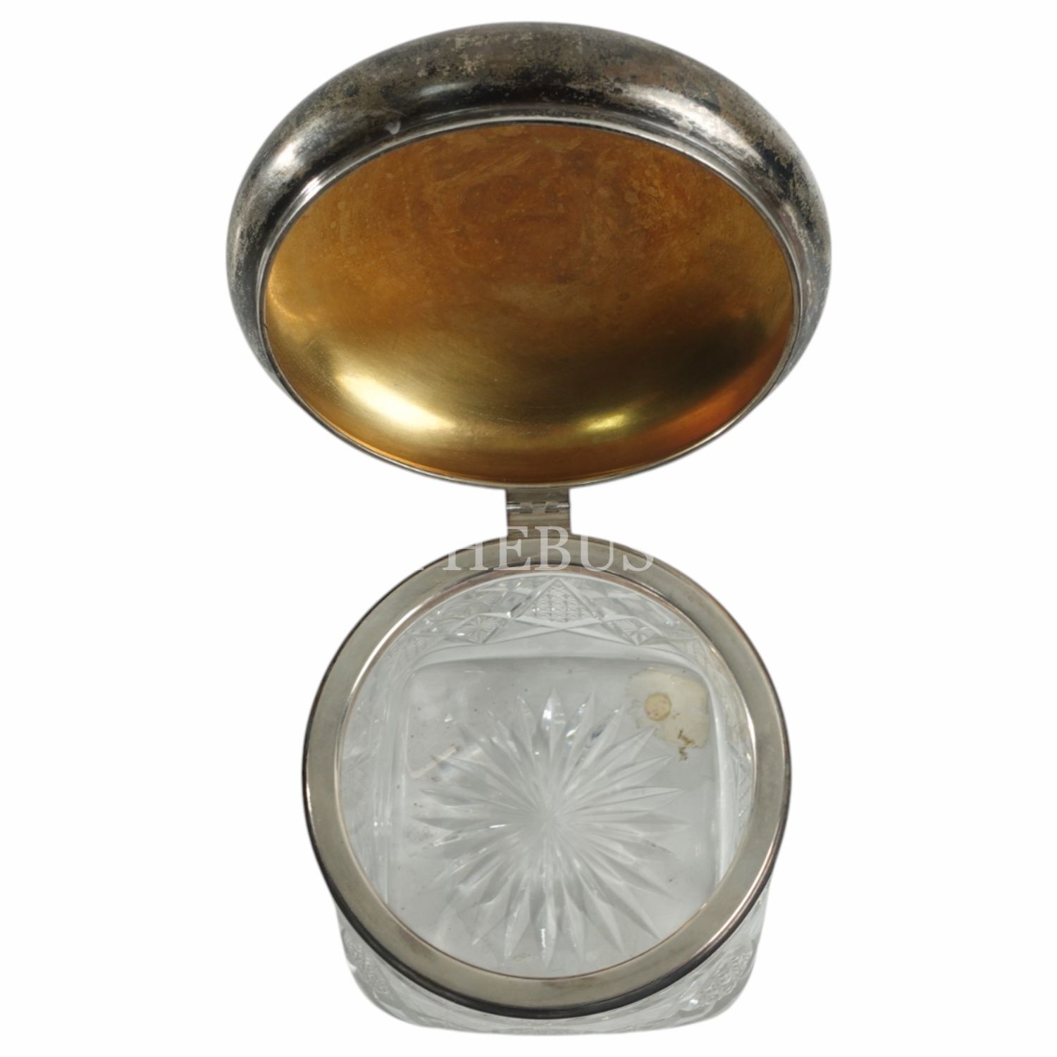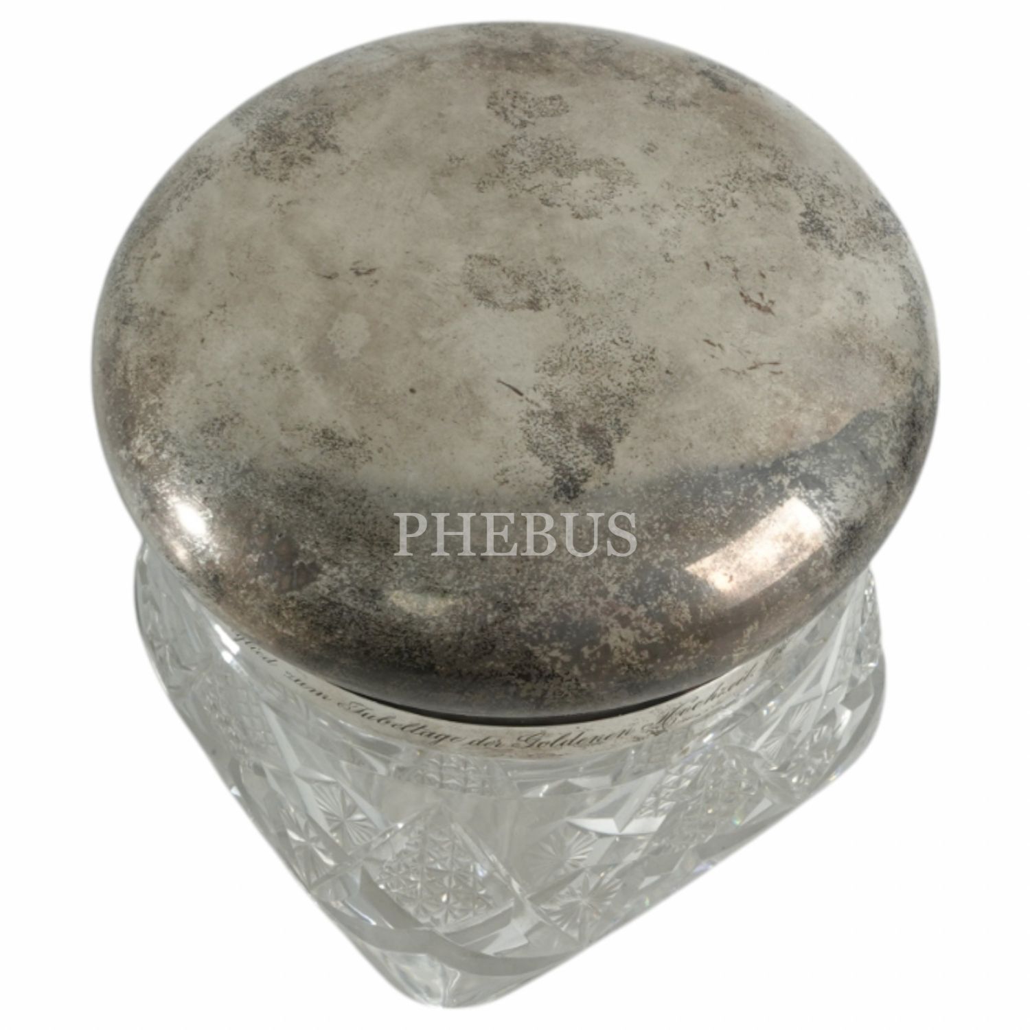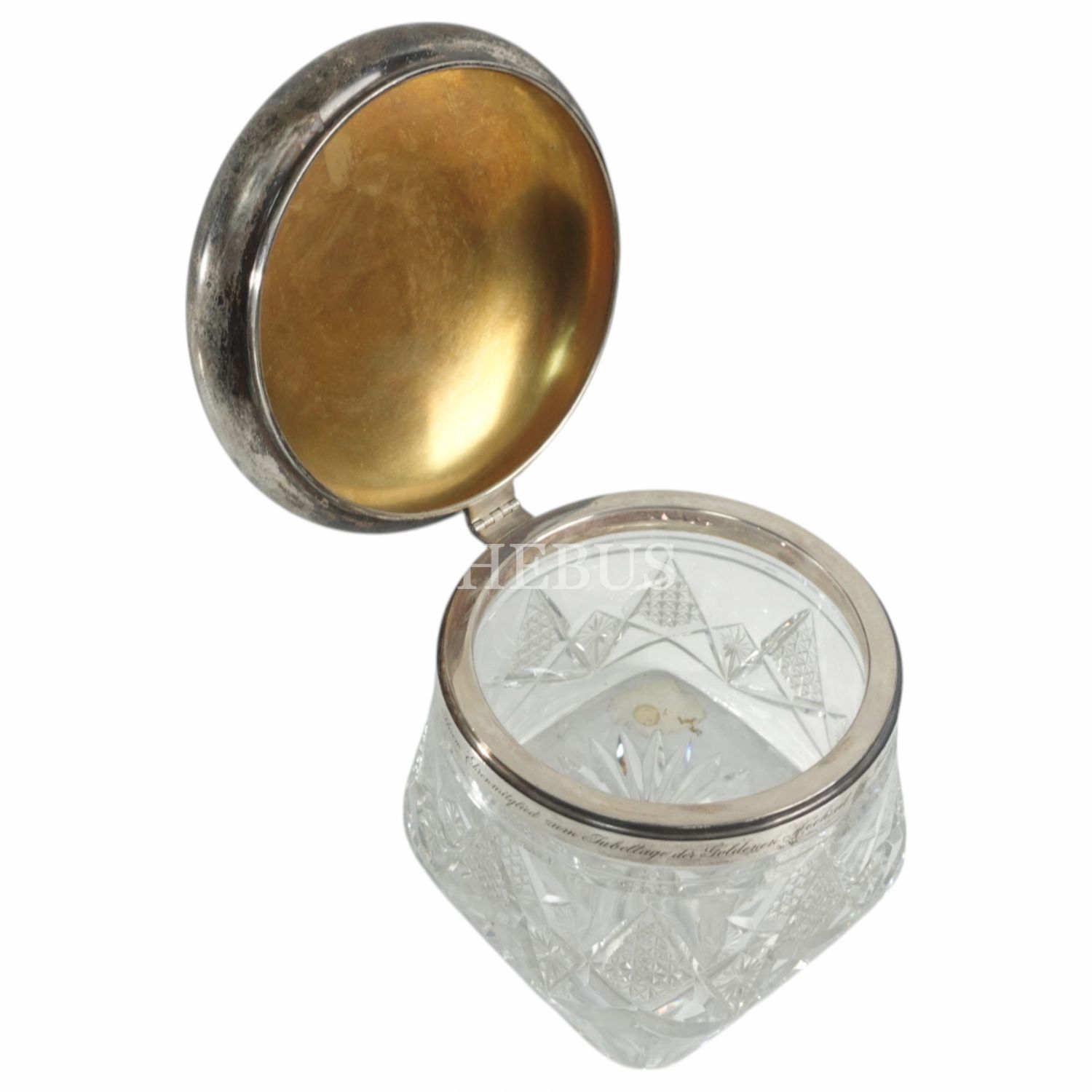 İstanbul Alman Lisesi tarafından takdim edilen; gümüş kapağı etrafında Almanca (Ihrem Ehrenmitglied zum Jubeltage der Goldenen Hochzeit. Die Deutsche Schulgemeinde zu Konstantinopel 11. Mai 1918) "Okulumuzun onursal üyesine jübile armağanıdır" yazılı, Art Nouveau tarzı kristal şekerlik,çap 12 cm, yüksekli 12 cm...