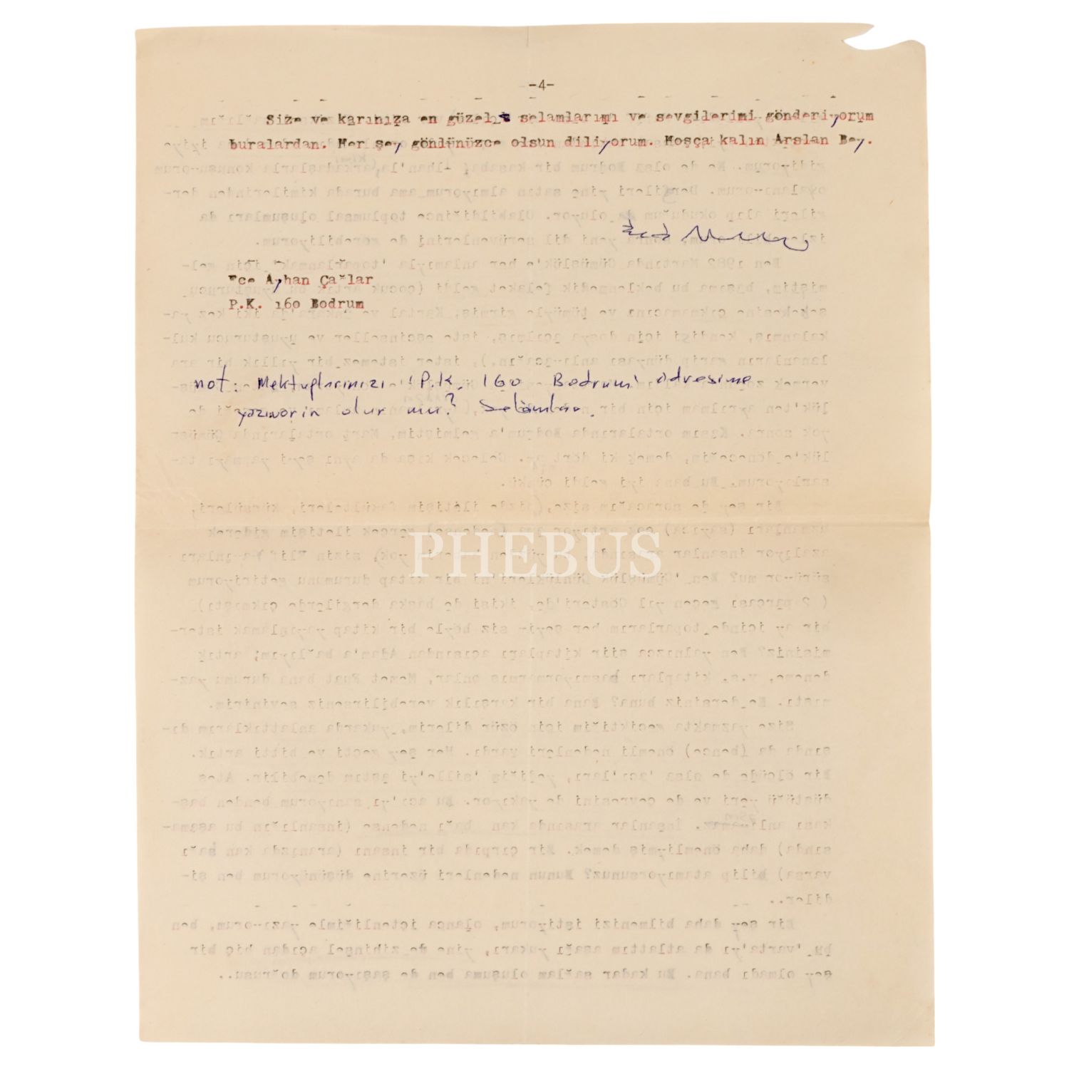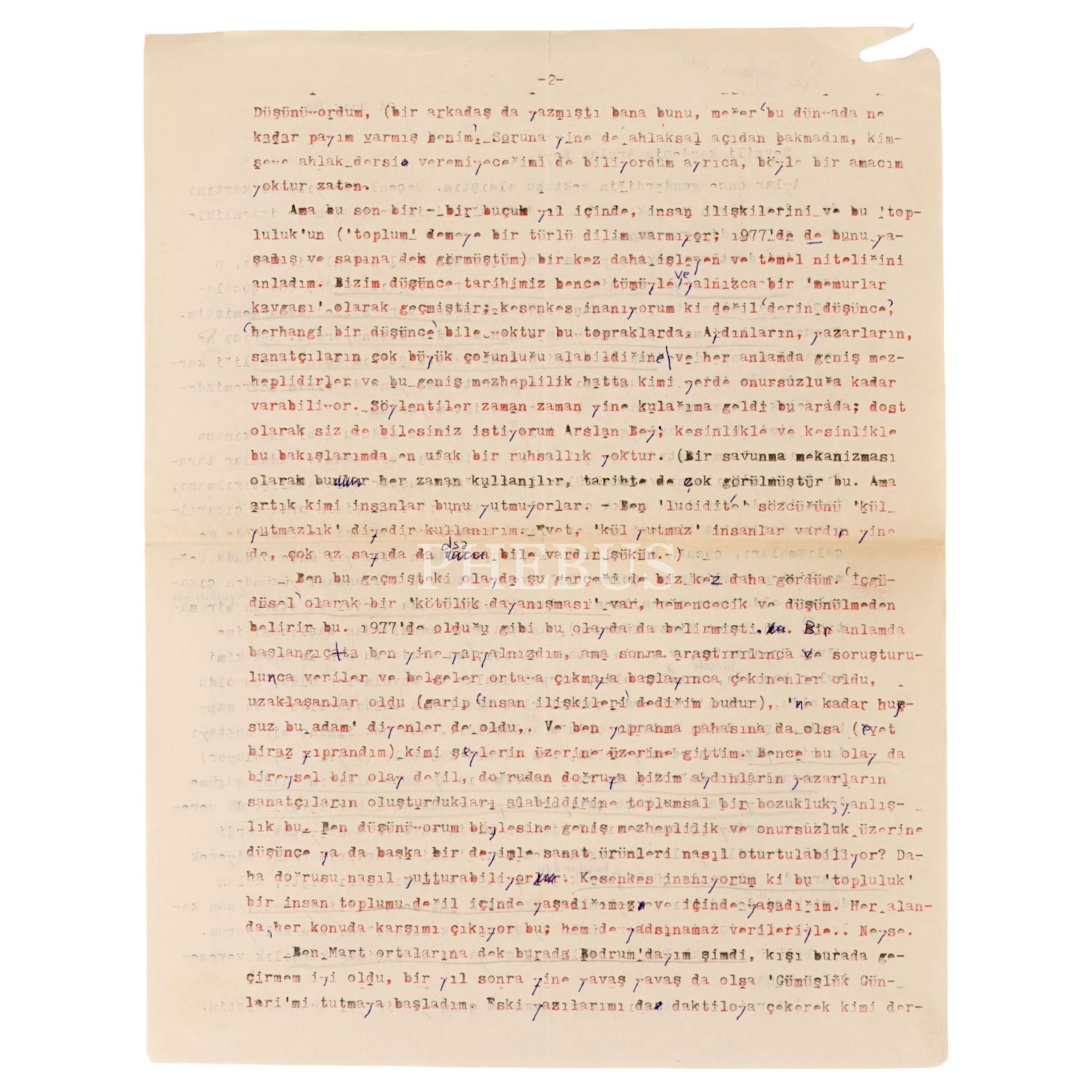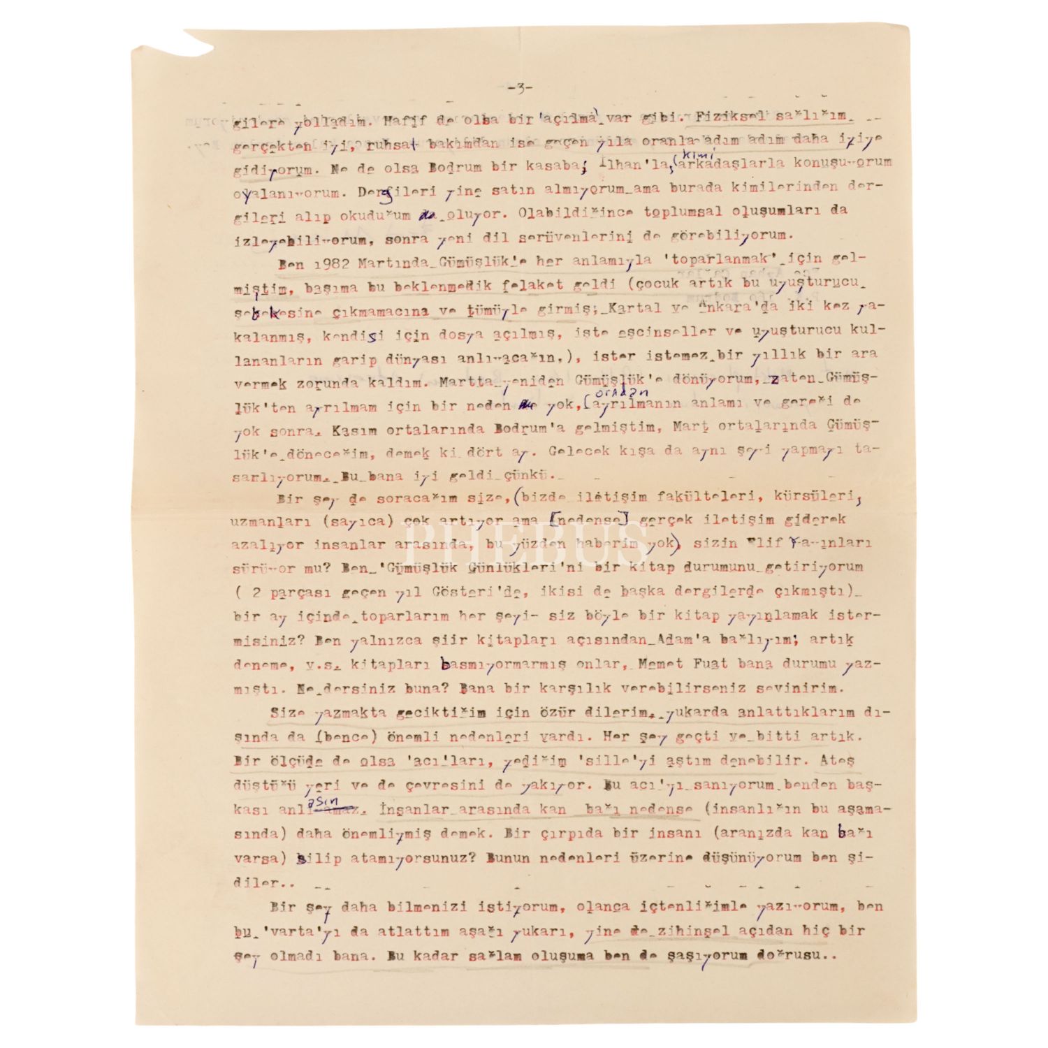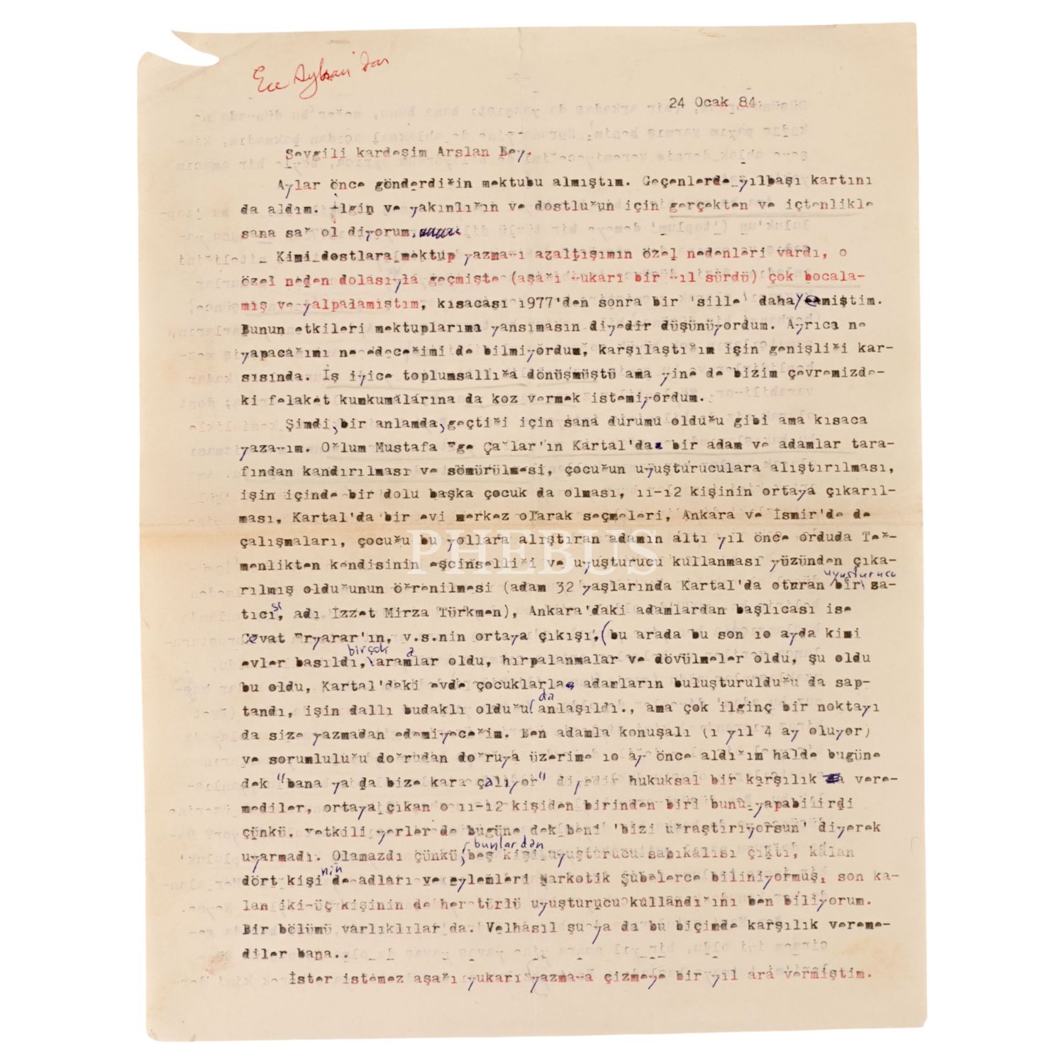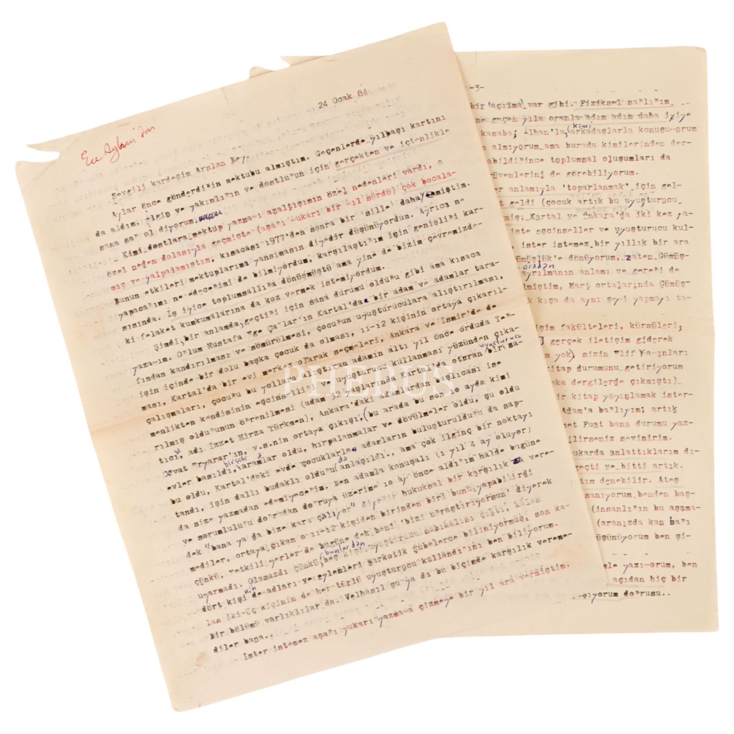 Ece Ayhan tarafında daktilo ile yazılmış 24 Ocak 1984 tarihli mektup, 22x28 cm...