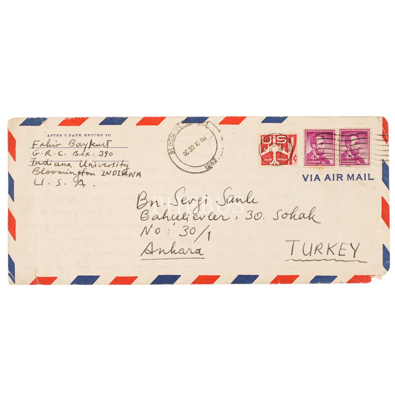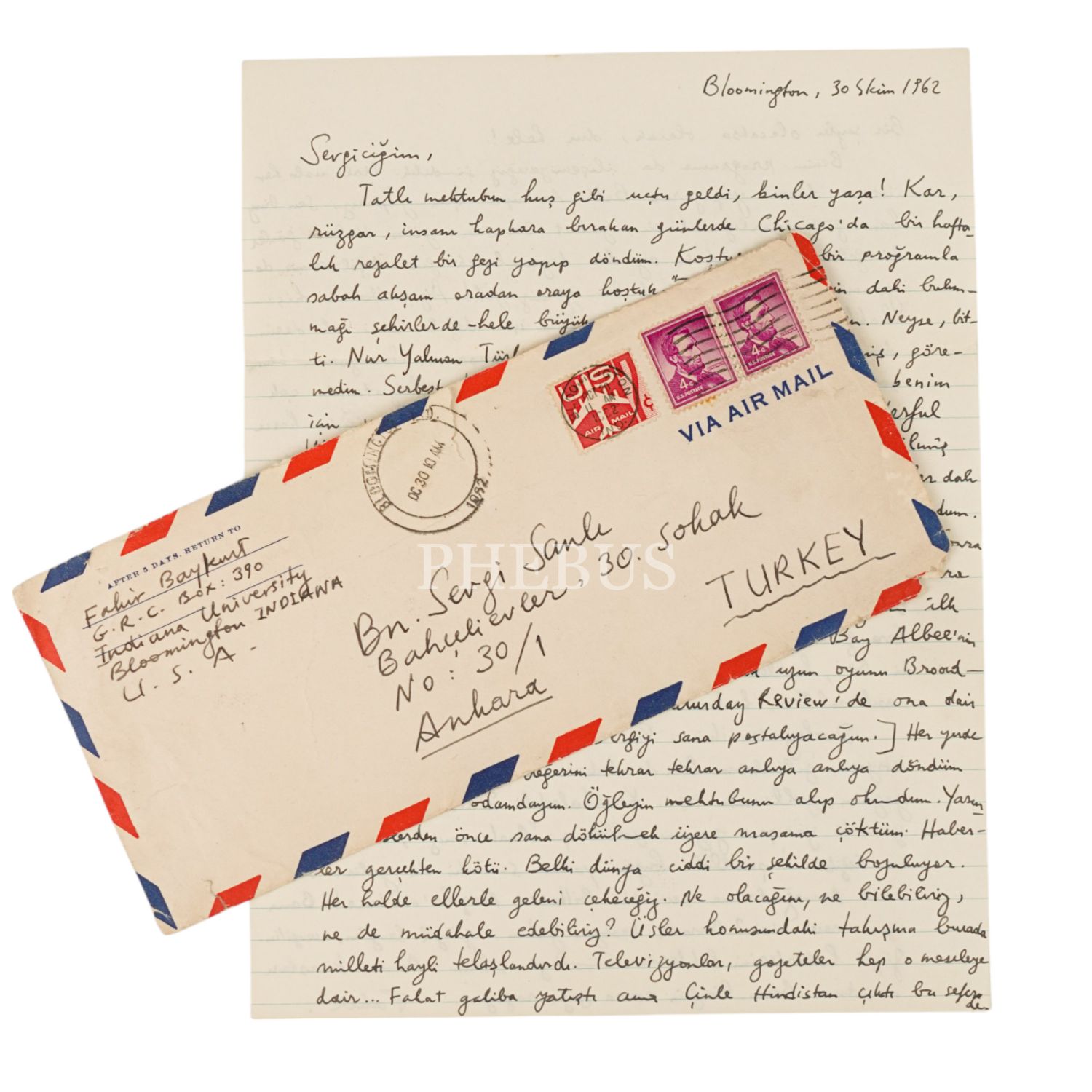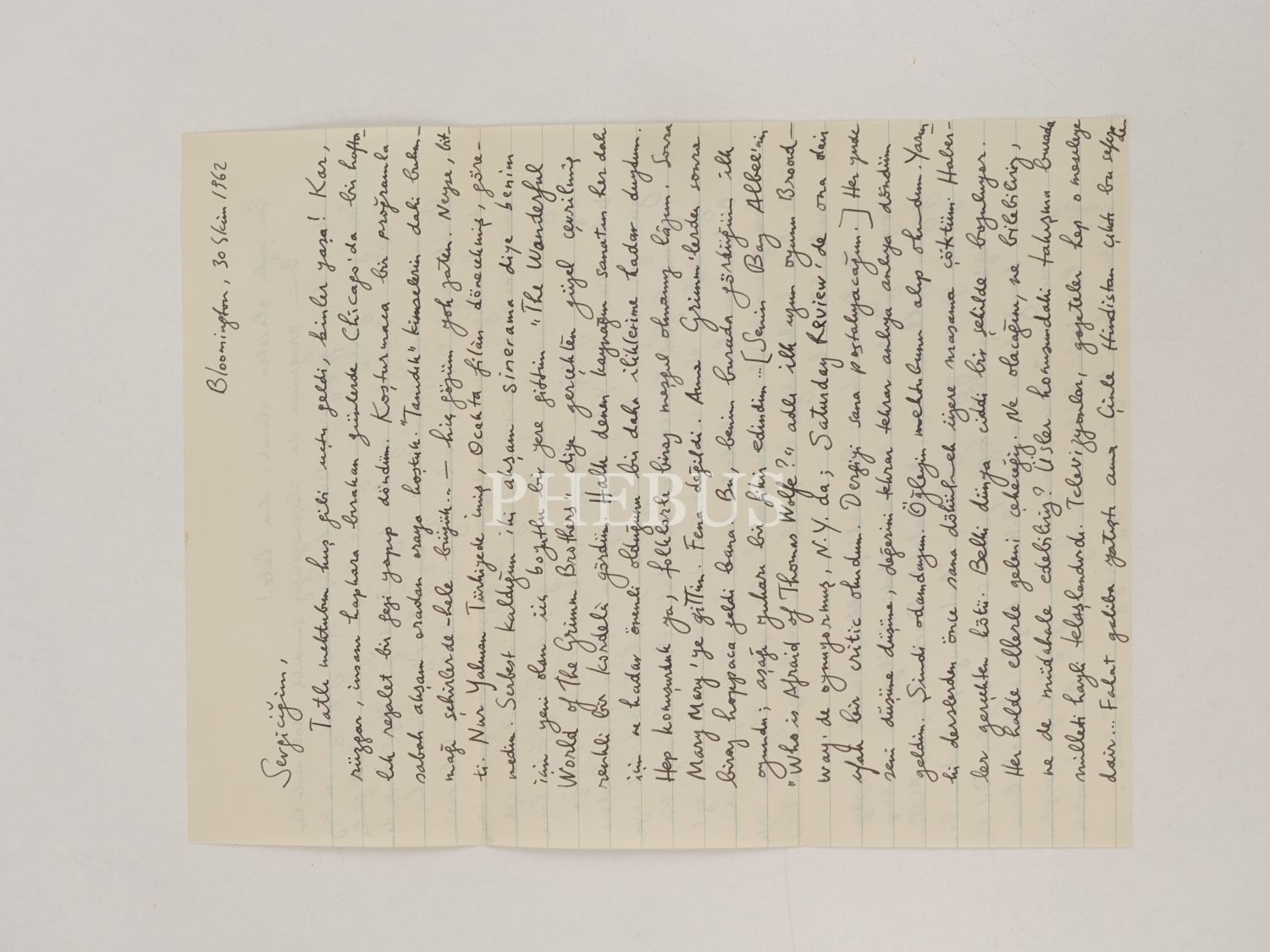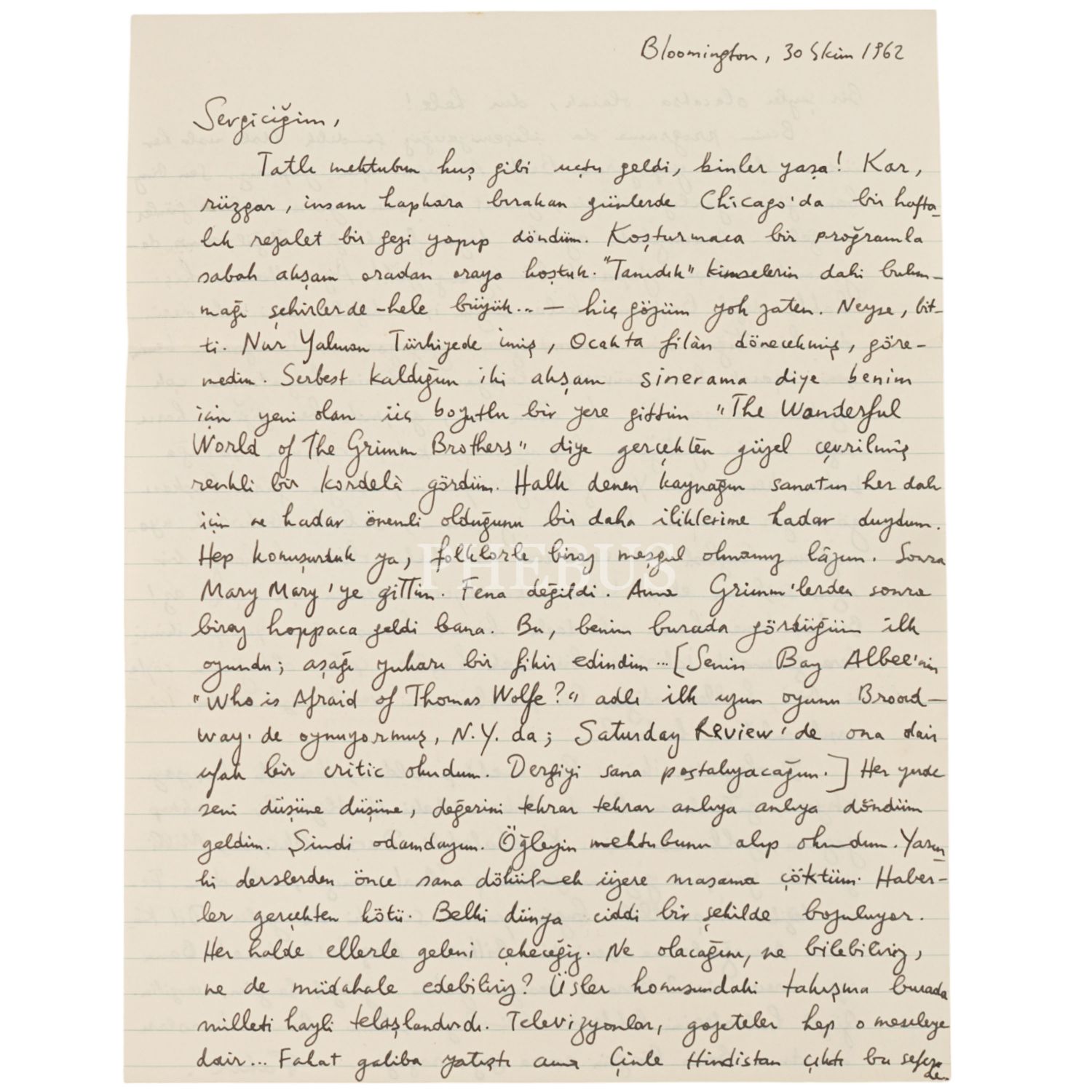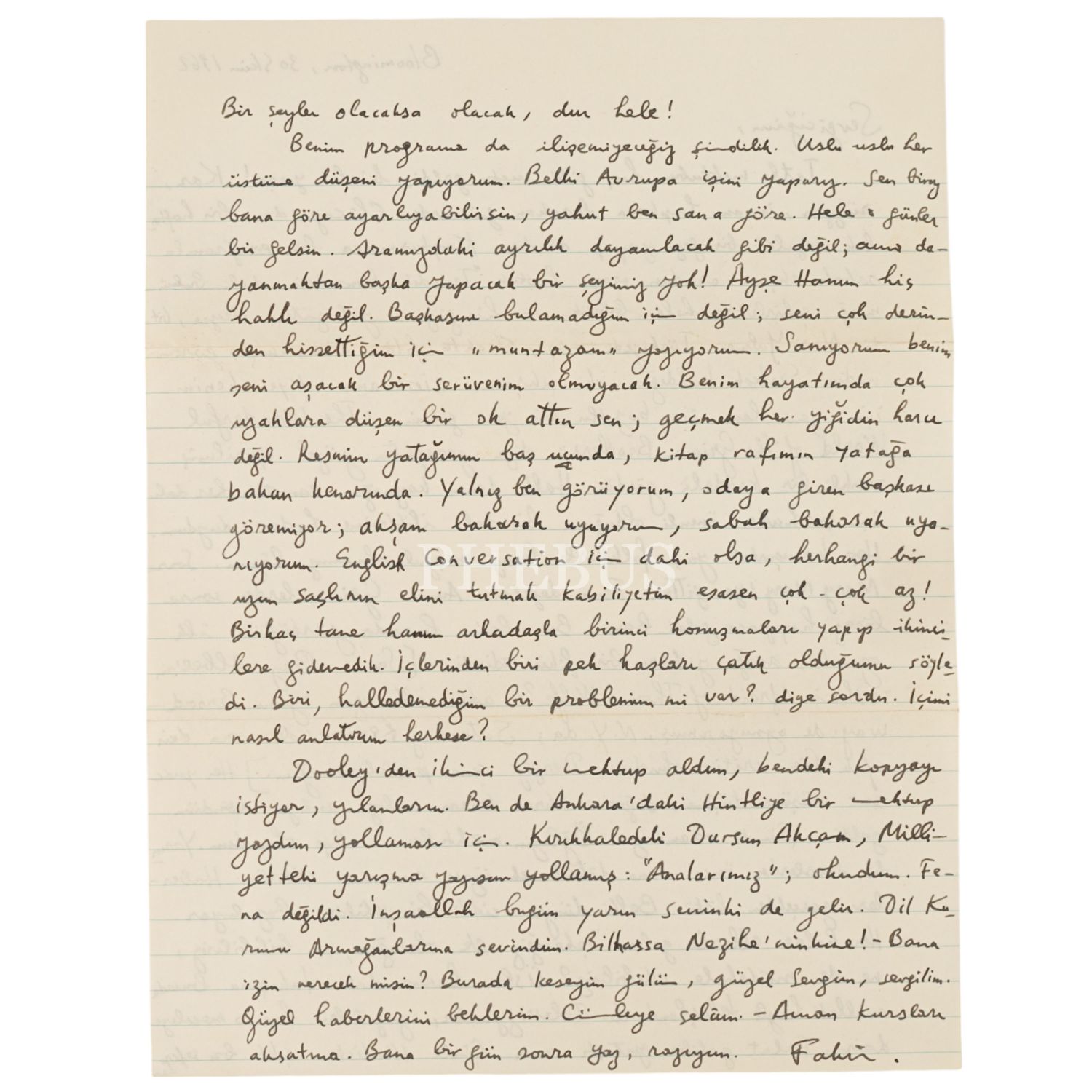 Fakir Baykurt´un, oyun yazarı Sevgi Sanlı´ya hitaben kaleme aldığı 30 Ekim 1962 tarihli mektubu, 21x27 cm...