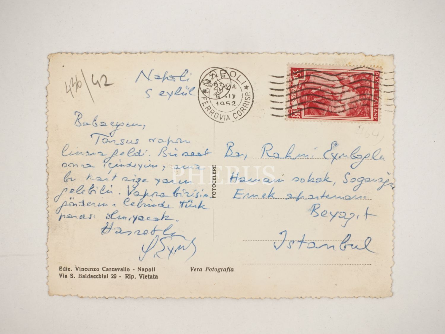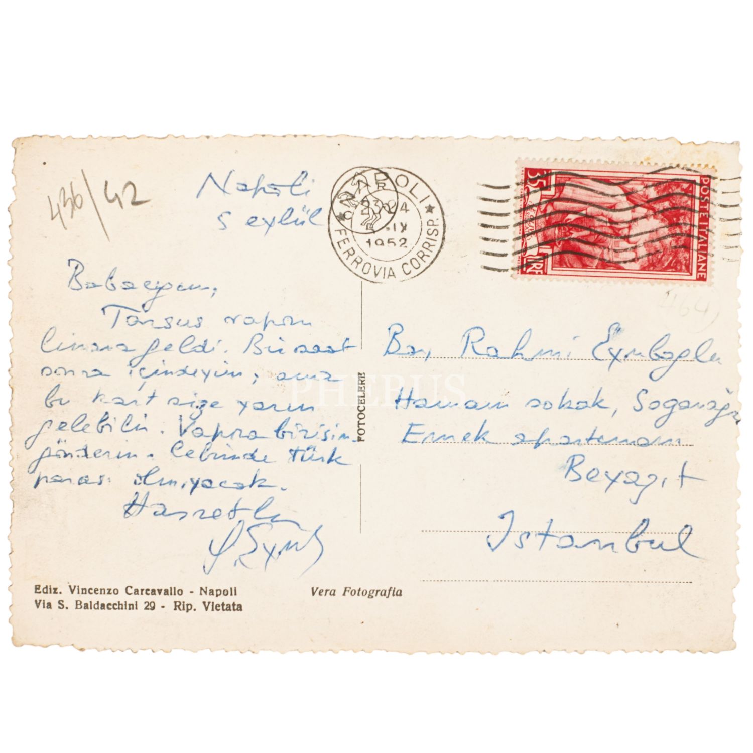 Sabahattin Eyüboğlu´nun babası Mehmet Rahmi Eyüboğlu´na Napoli´den gönderdiği kartpostal, 14x10 cm...