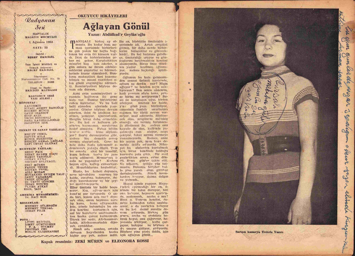 Radyonun Sesi dergisi, 1953, kapak Zeki Müren - Eleonora Rossi, sırtı haliyle, 50 sayfa, 16x24 cm
