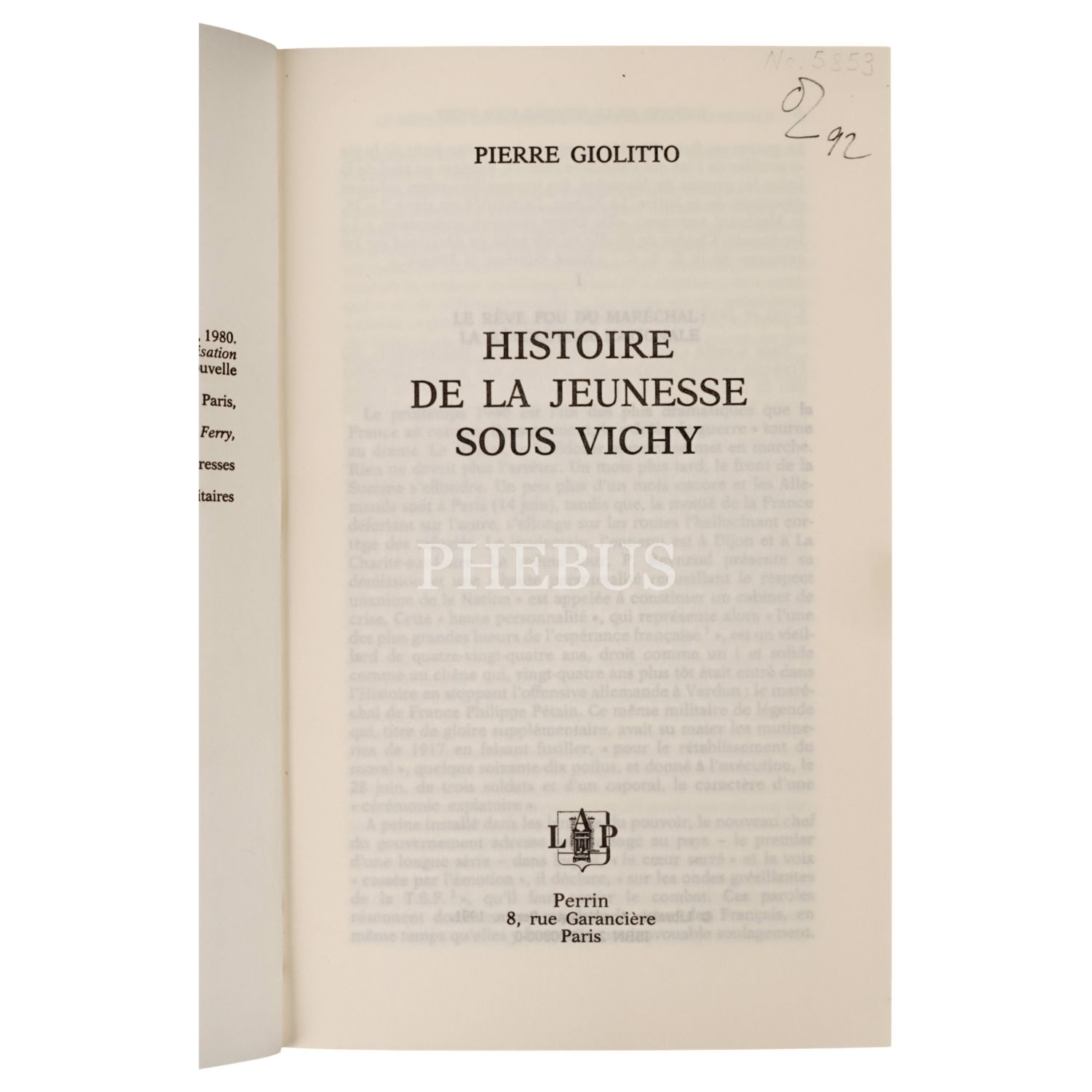 HISTOIRE DE LA JEUNESSE SOUS VICHY, Pierre Giolitto, 1991, Perrin (Paris), 698 sayfa, 16x24 cm...