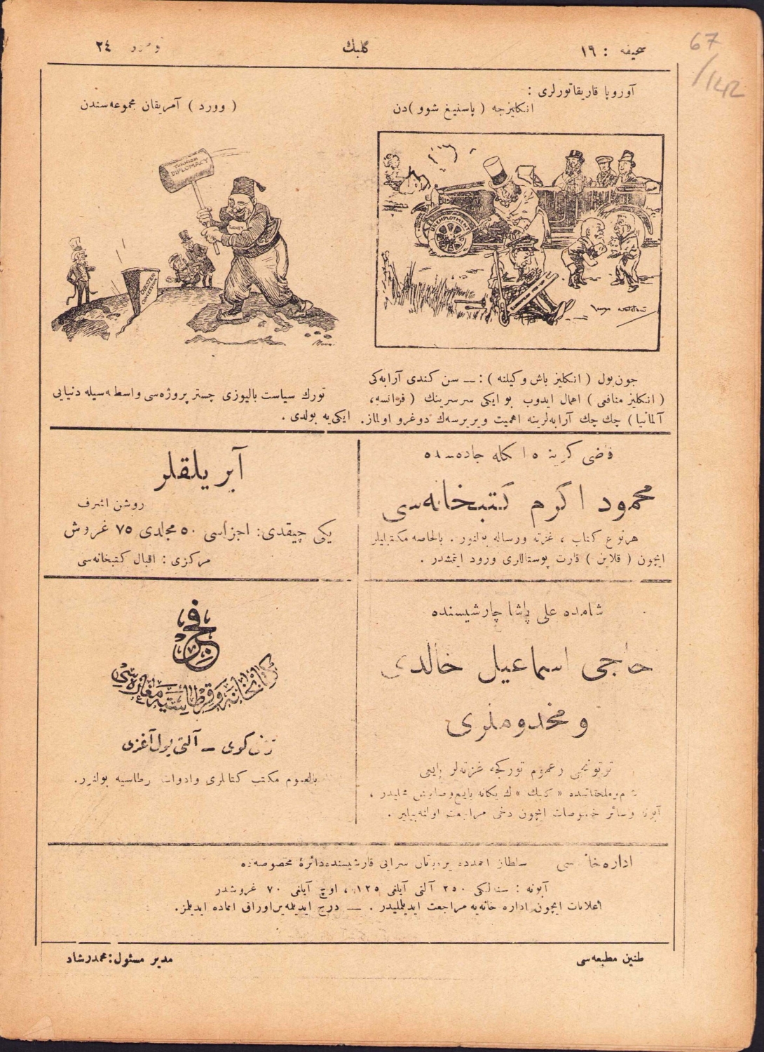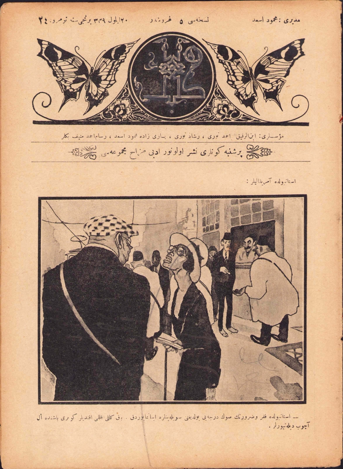 Osmanlıca Kelebek mecmuası, müdürü Mahmut Esat, kapak "İstanbul'da fakr-u zaruretin son dereceyi bulduğunu söyleyenlere inanmıyorduk. Bak kelli felli efendiler köprü başında el açıp dinliyorlar." 16 sayfa, 20x26 cm