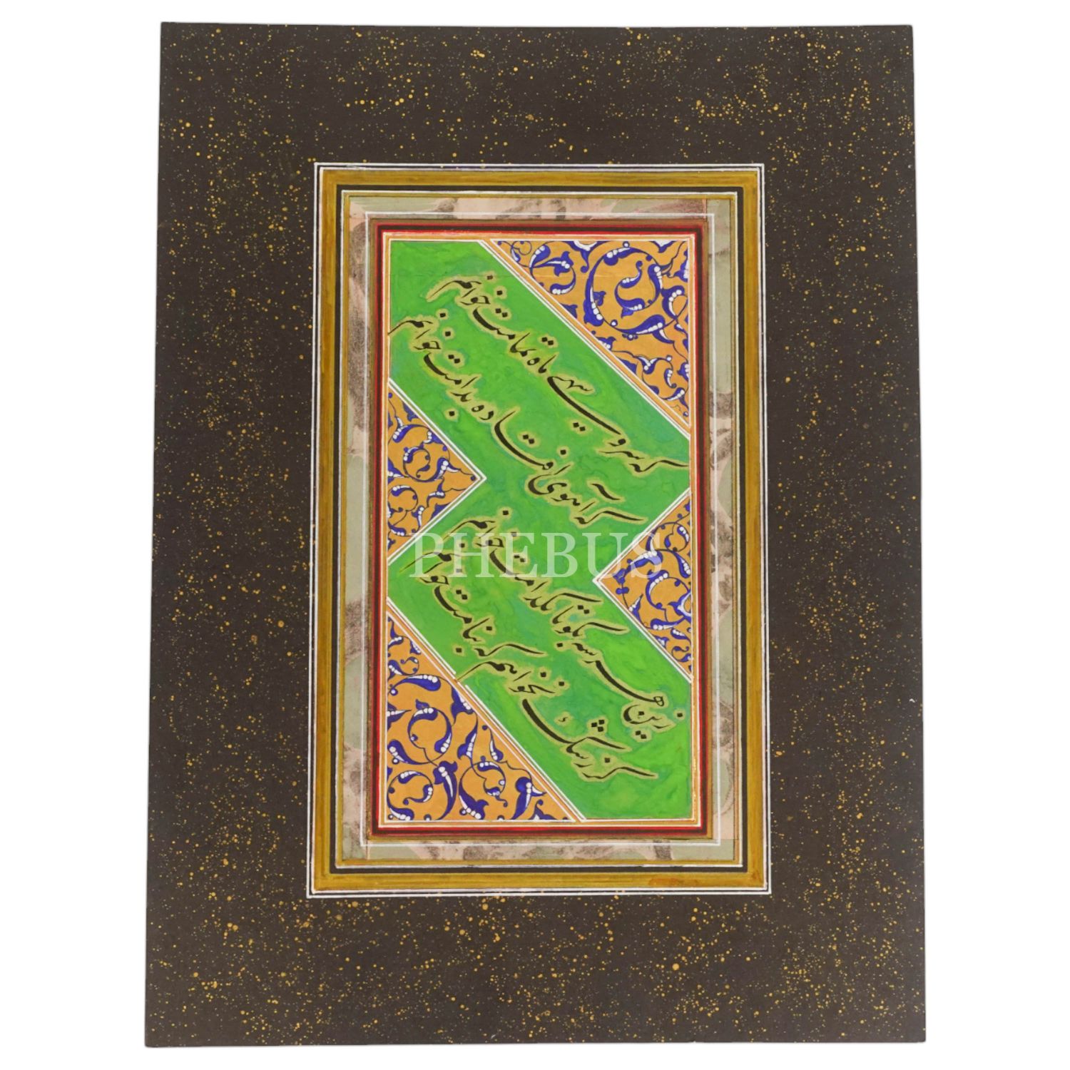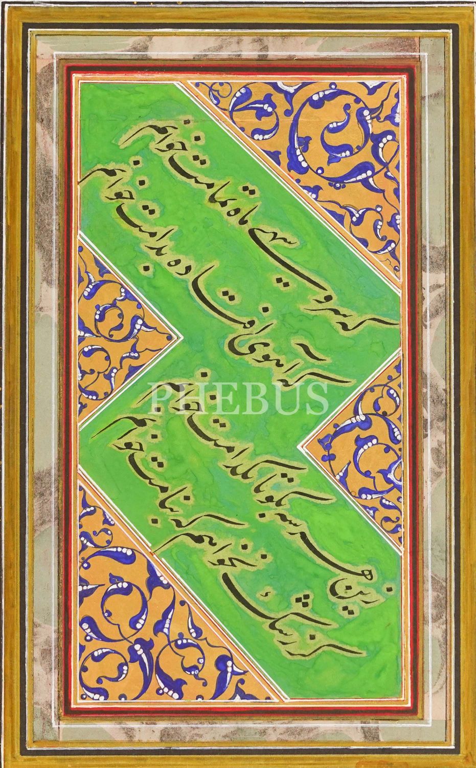 Farsça talik mail kıta, tezhipli ve pervazı ebrulu, yazı ölçü: 12x23 cm, mukavva ölçü: 31x41 cm...