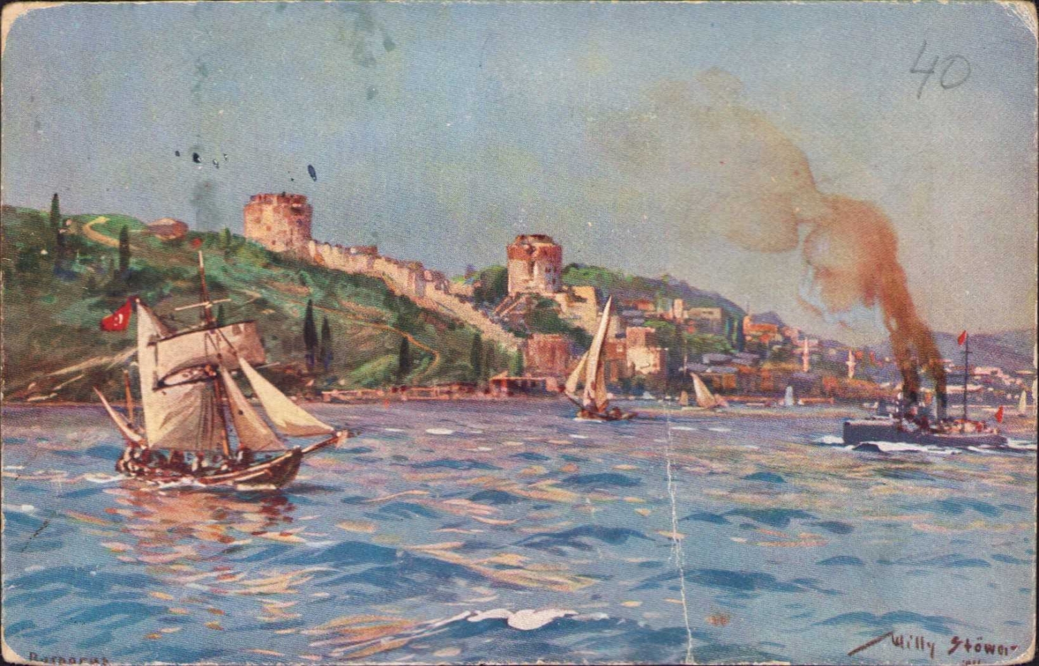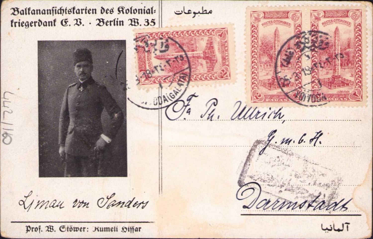 Osmanlı dönemi Rumeli Hisarı, arkasından Alman general ve Osmanlı mareşali olan Otto Liman von Sanders fotoğrafı vardır, Osmanlıca – Fransızca Voyvoda Galata damgalı, postadan geçmiş