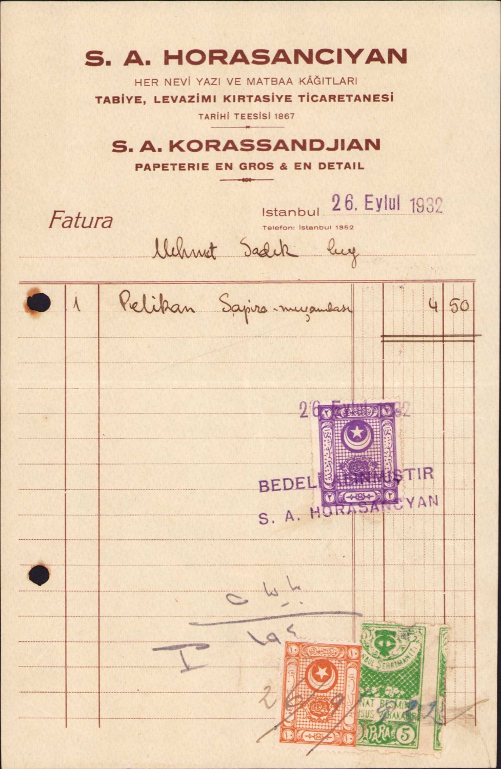 Fransızca – Türkçe S. A. Horasancıyan her nervi yazı ve matbaa kağıtları antetli fatura, 1932