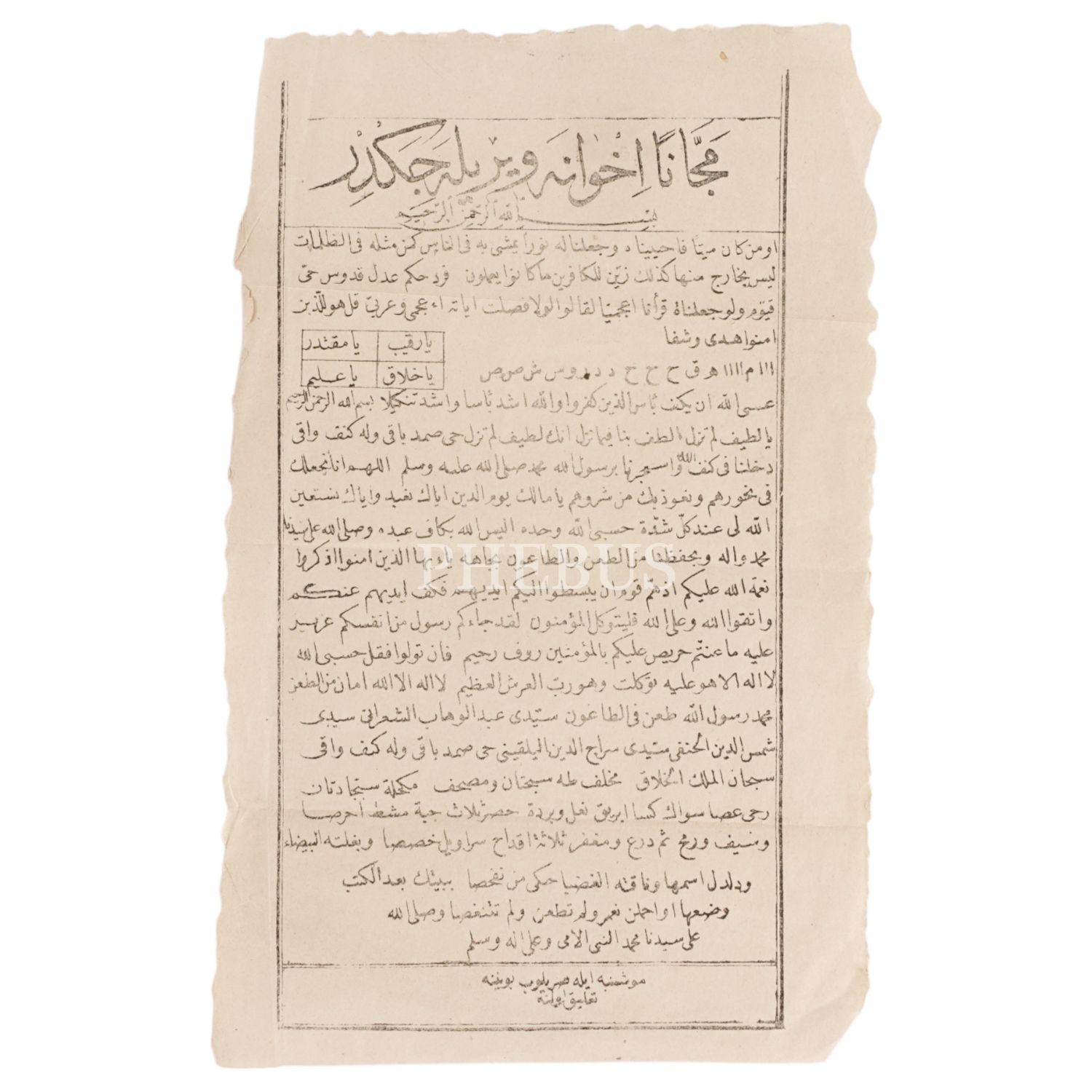"Meccânen ihvâna verilecekdir" başlıklı ve "Muşanbaya sarılıp boynuna talik oluna" dipnotlu; tılsımlı, vefkli ve dualı muska.