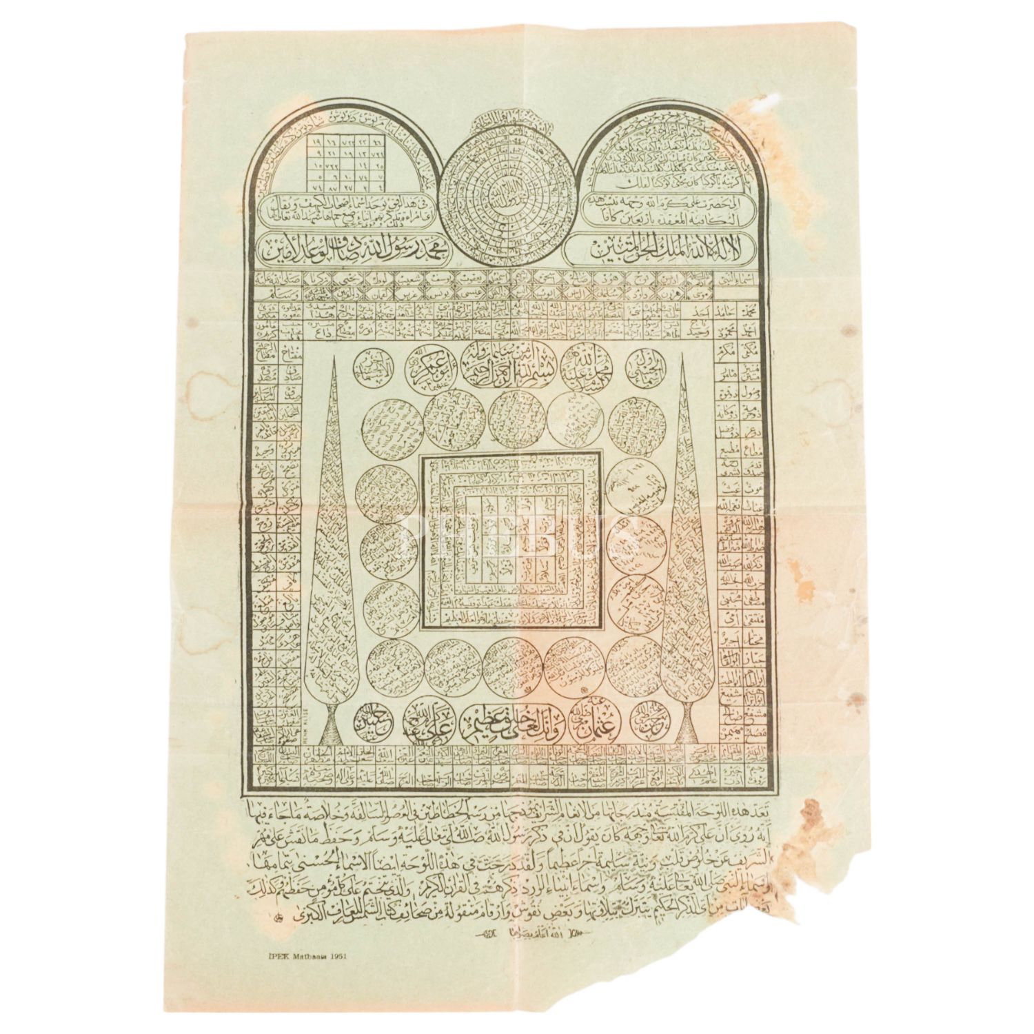 Esma-i hüsna, esma-i nebi, Çâr-ı Yâr-ı Güzin, âyet, vefk ve dualar içeren levha, 1951 tarihli, yazı ölçü: 21x34 cm, kağıt ölçü: 29x41 cm...