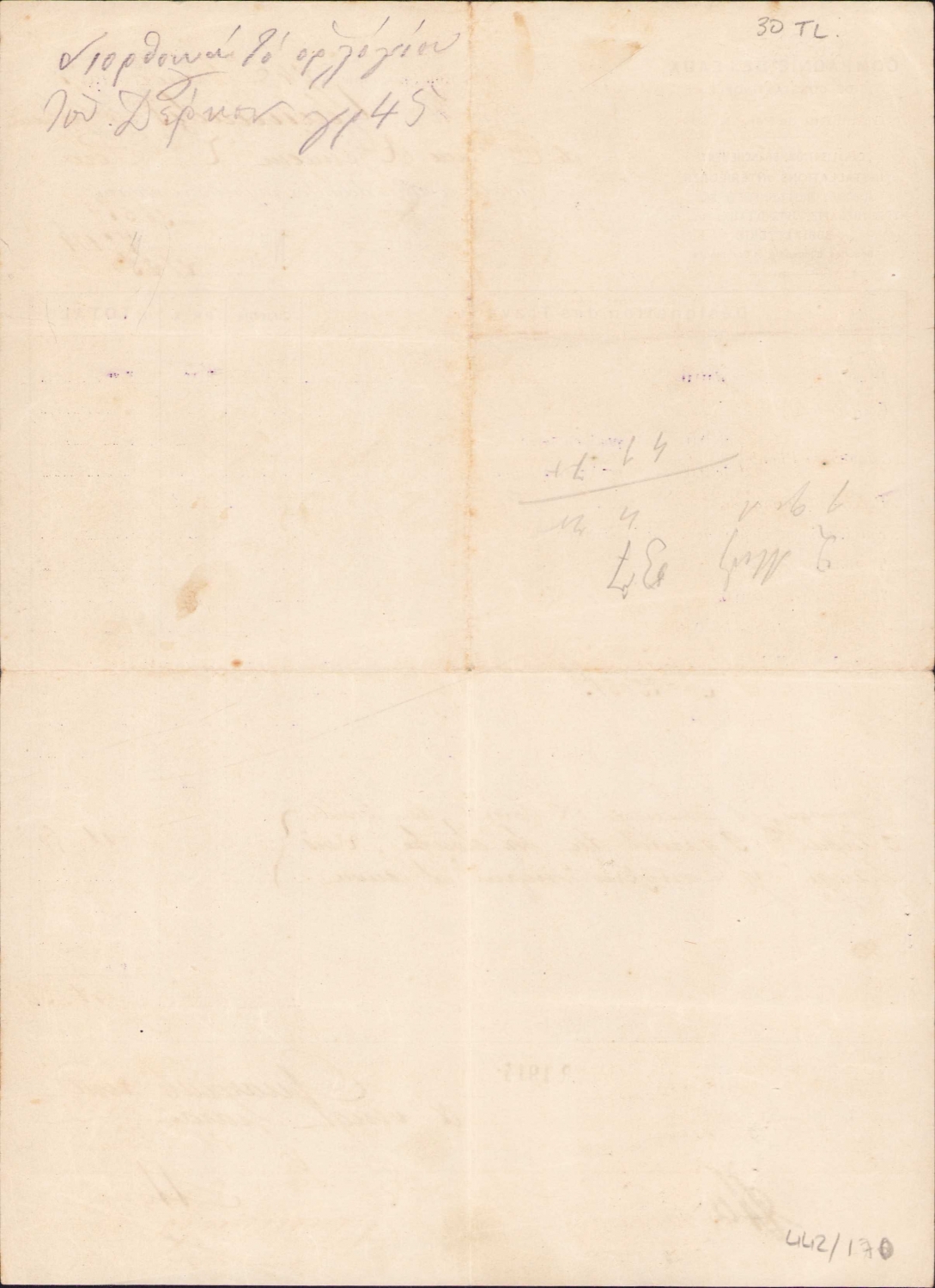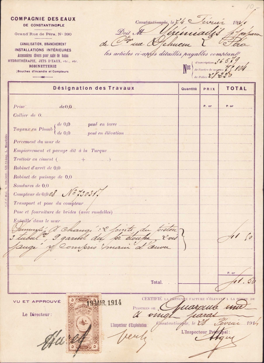 Fransızca Compagnie Des Eaux De Constantinople antetli 1914 tarihli fatura, Osmanlıca pullu, 19x27 cm