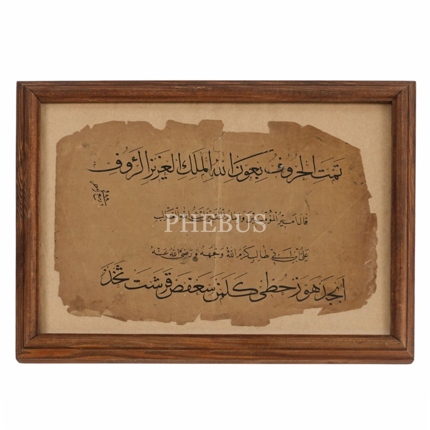 Sol tarafına 99 (1299) tarihi düşülmüştür. Sülüs kısımda hurufat meşkinin bittiği ve ebced harfleri yazılıdır. Nesih kısımda Hz. Ali'nin "Allah'ın aslanı" olduğunu söyleyen hadis-i şerif vardır.