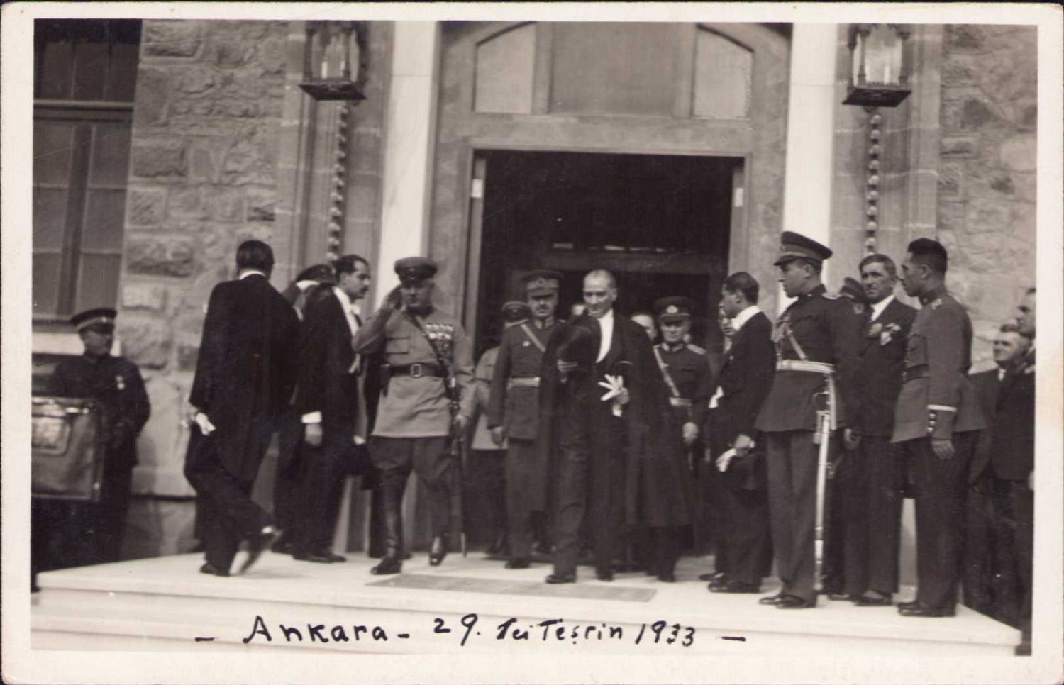 Mustafa Kemal Atatürk Cumhuriyet'in 10. yılında meclisten çıkarken, Ankara 1933, arkası Osmanlıca mektup