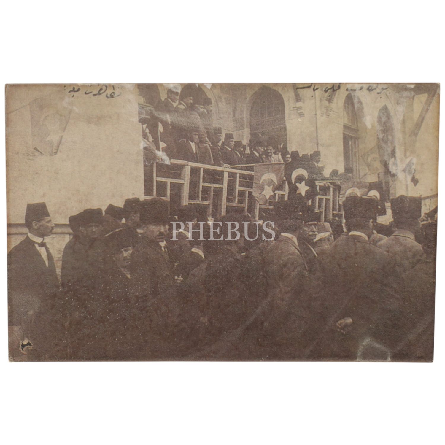 Mustafa Kemal Atatürk´ün Türkiye Büyük Millet Meclis binası balkonundan nutuk irad ederken çekilmiş fotoğrafı, 14x10 cm...