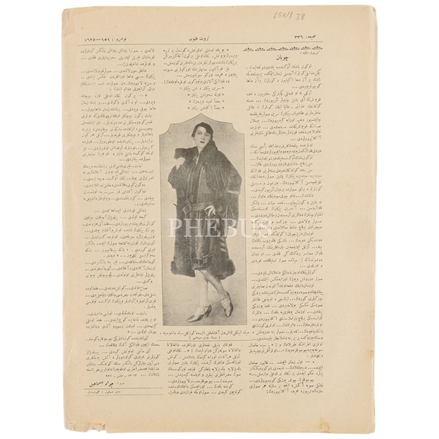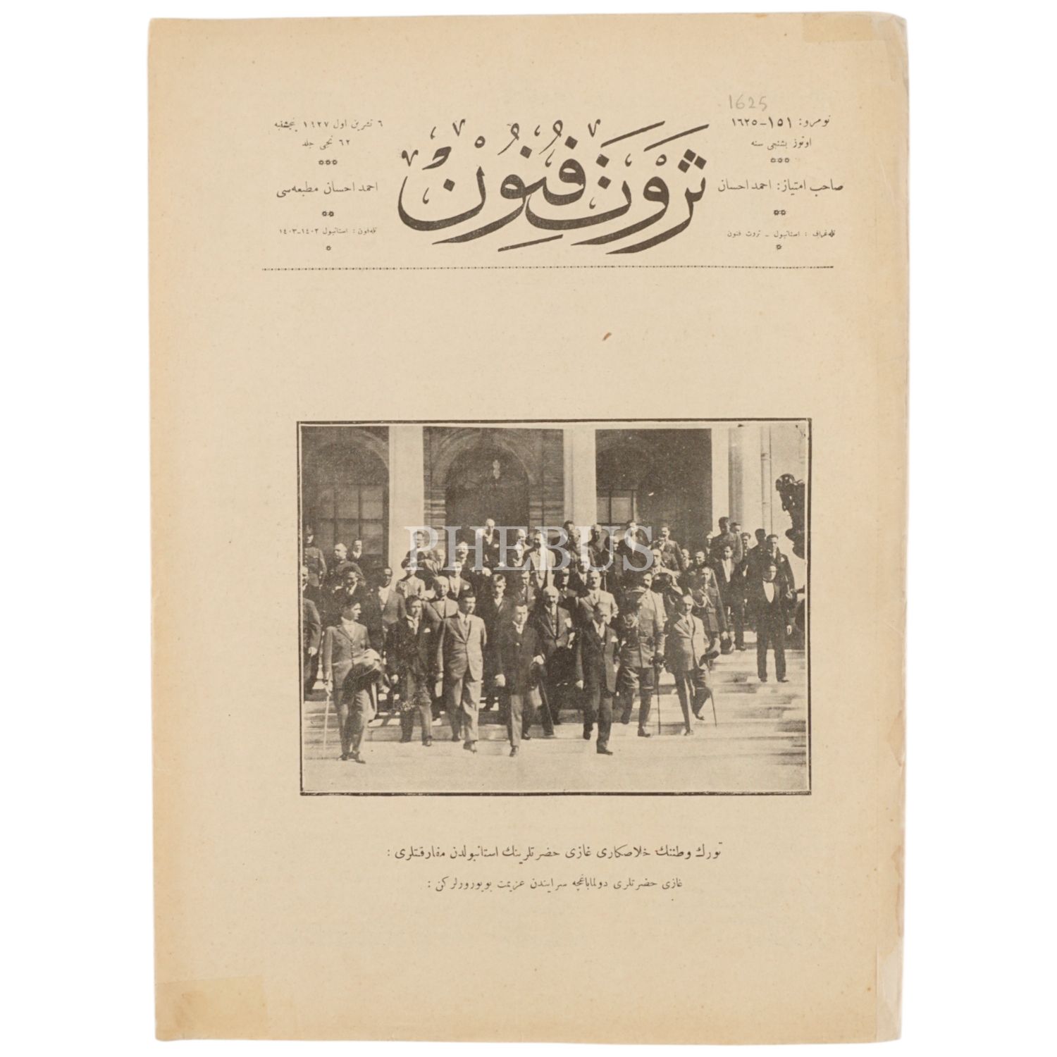 "Türk ve vatanın halaskârı Gazi Hazretleri´nin İstanbul´dan müfarakatleri: Gazi Hazretleri Dolmabahçe Sarayı´ndan azimet buyururlarken" manşetli, Mustafa Kemal Atatürk´ün Dolmabahçe Sarayı´ndan çıkarken çekilmiş bir fotoğrafını kapağında kullanan SERVET-İ FÜNUN dergisinin 6 Teşrinievvel 1927 tarihli nüshası, 26x34 cm...