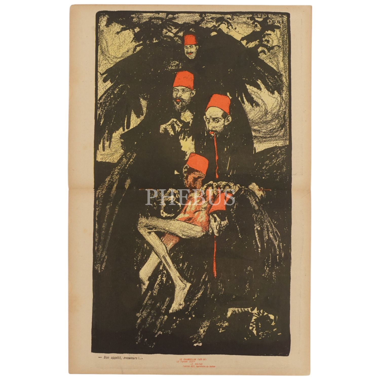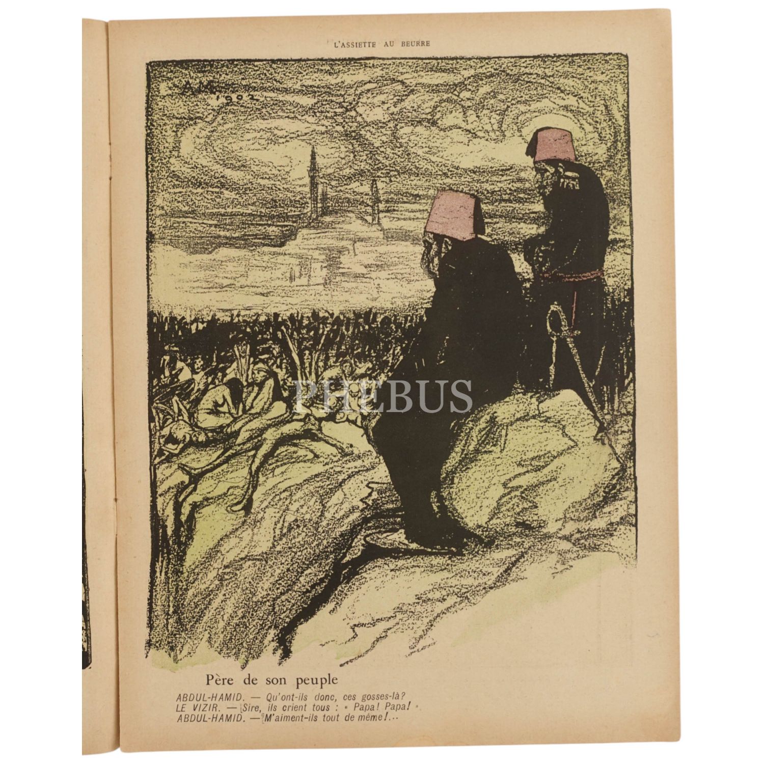 Kapağında, Sultan İkinci Abdülhamid´in devrinde gerçekleşen suikastlerden sorumlu tutularak, anti-propagandacı bir anlayışla eli kanlı bir katil olarak resmedildiği L´ASSIETTE AU BEURRE dergisinin 16 Ağustos 1902 tarihli sayısı, 26x31 cm...