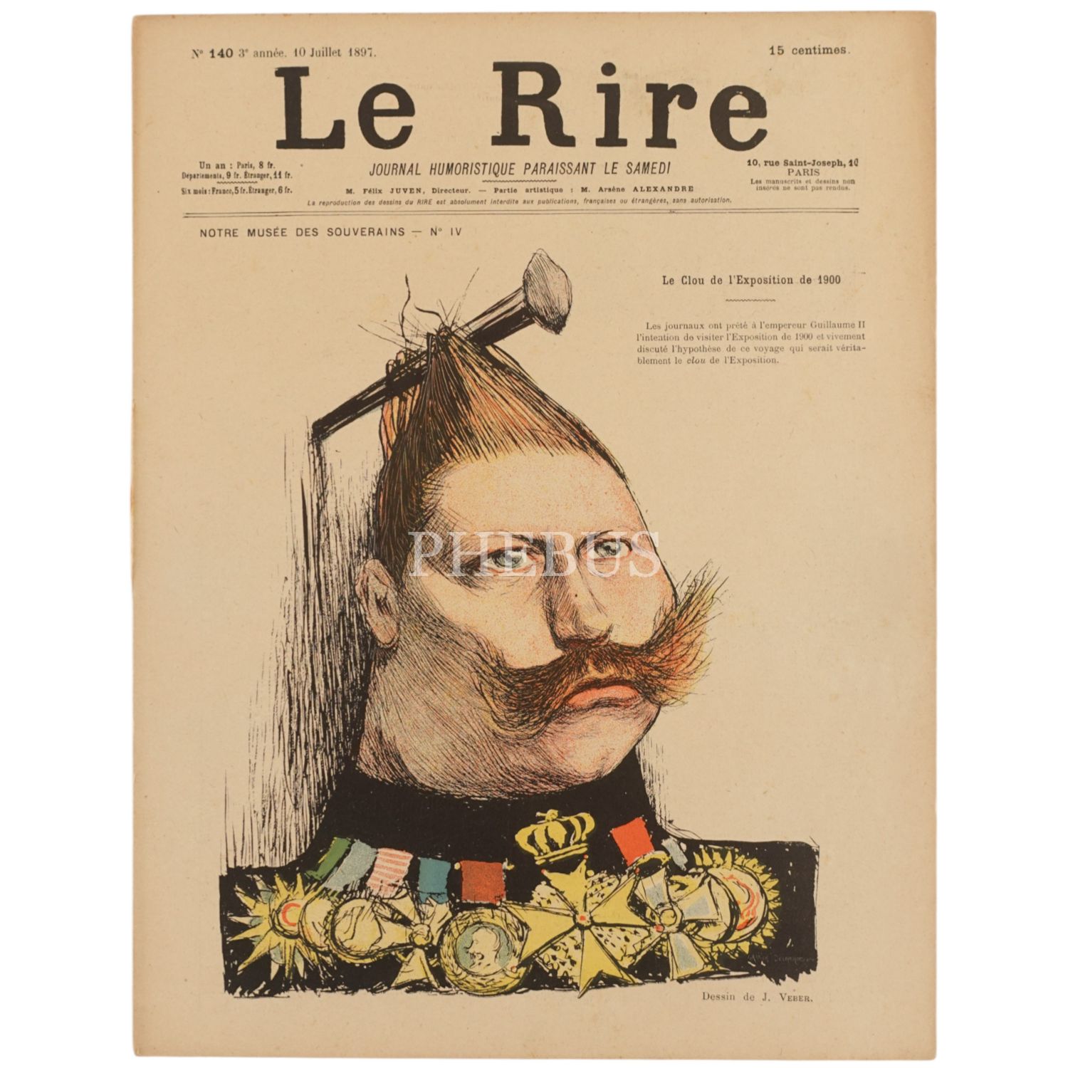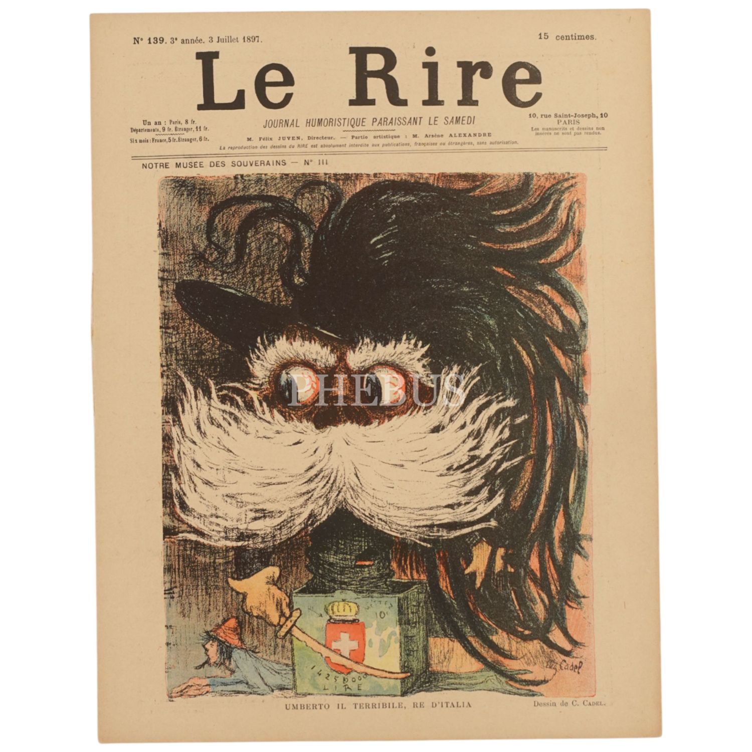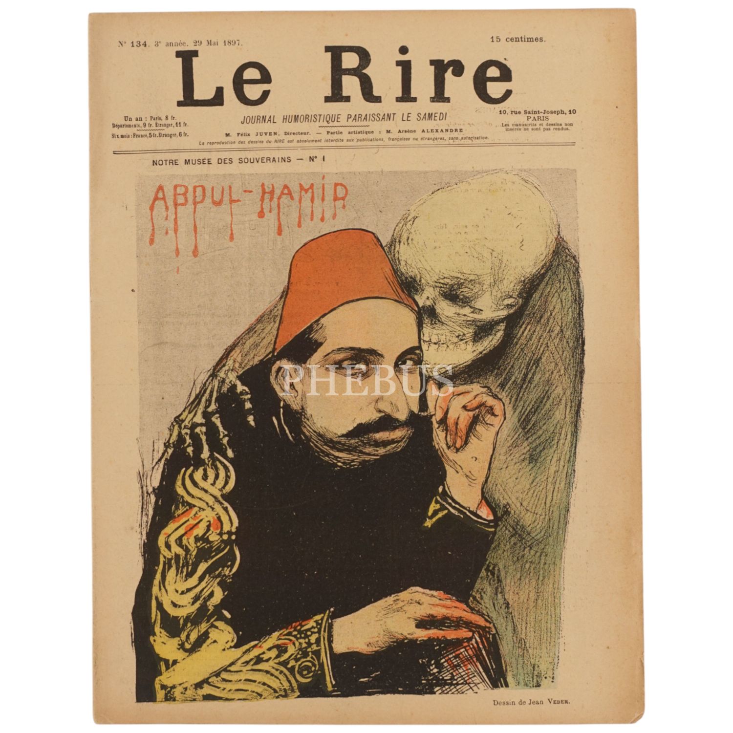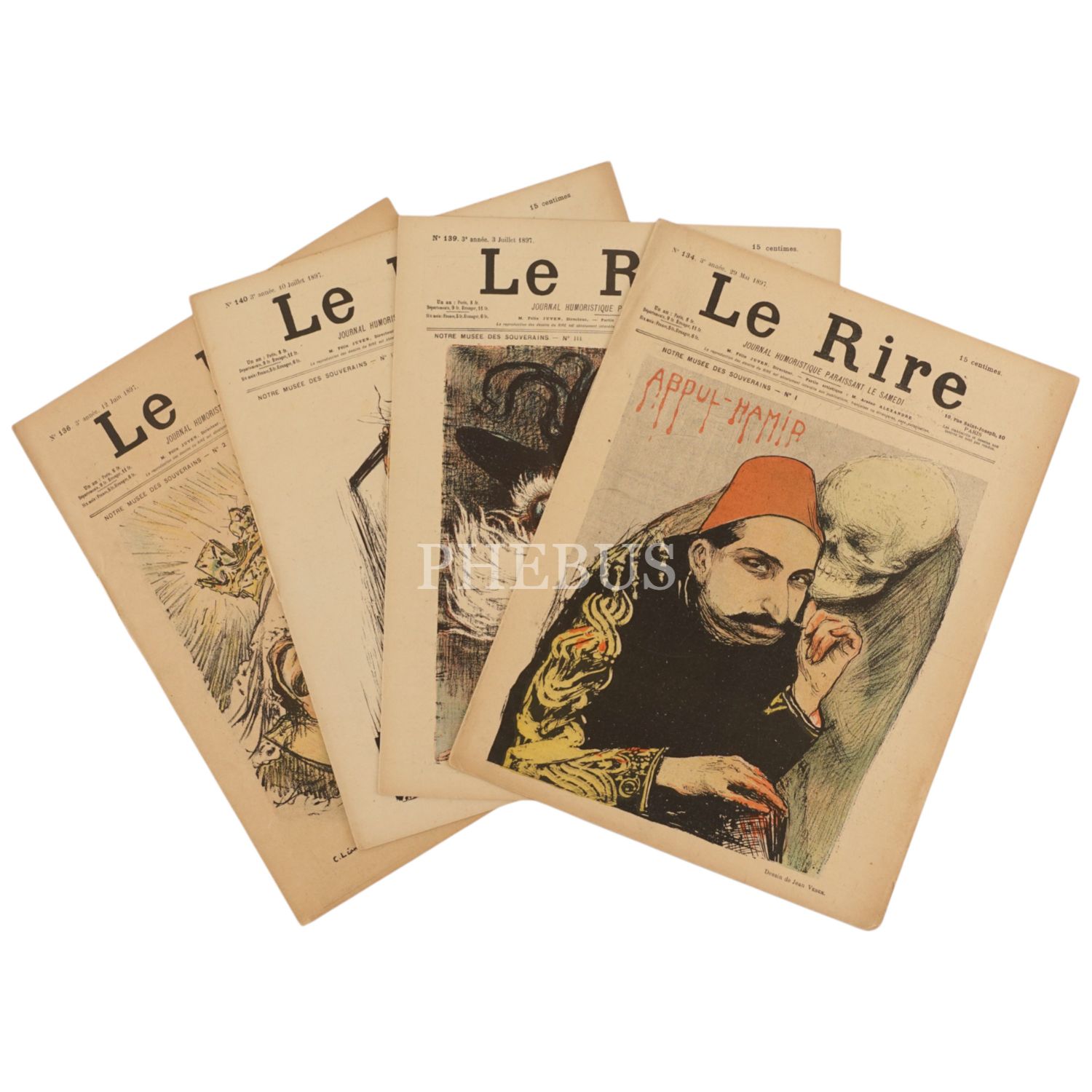 Kapağında, Sultan İkinci Abdülhamid´in devrinde gerçekleşen suikastlerden sorumlu tutularak, anti-propagandacı bir anlayışla ölümle yan yana resmedildiği LE RIRE dergisinin 29 Mayıs 1897 tarihli sayısı ve LE RIRE dergisinin kapağında İtalyan, Alman ve İngiliz hükümdarlarını resmettikleri 3 sayısı, 24x32 cm...