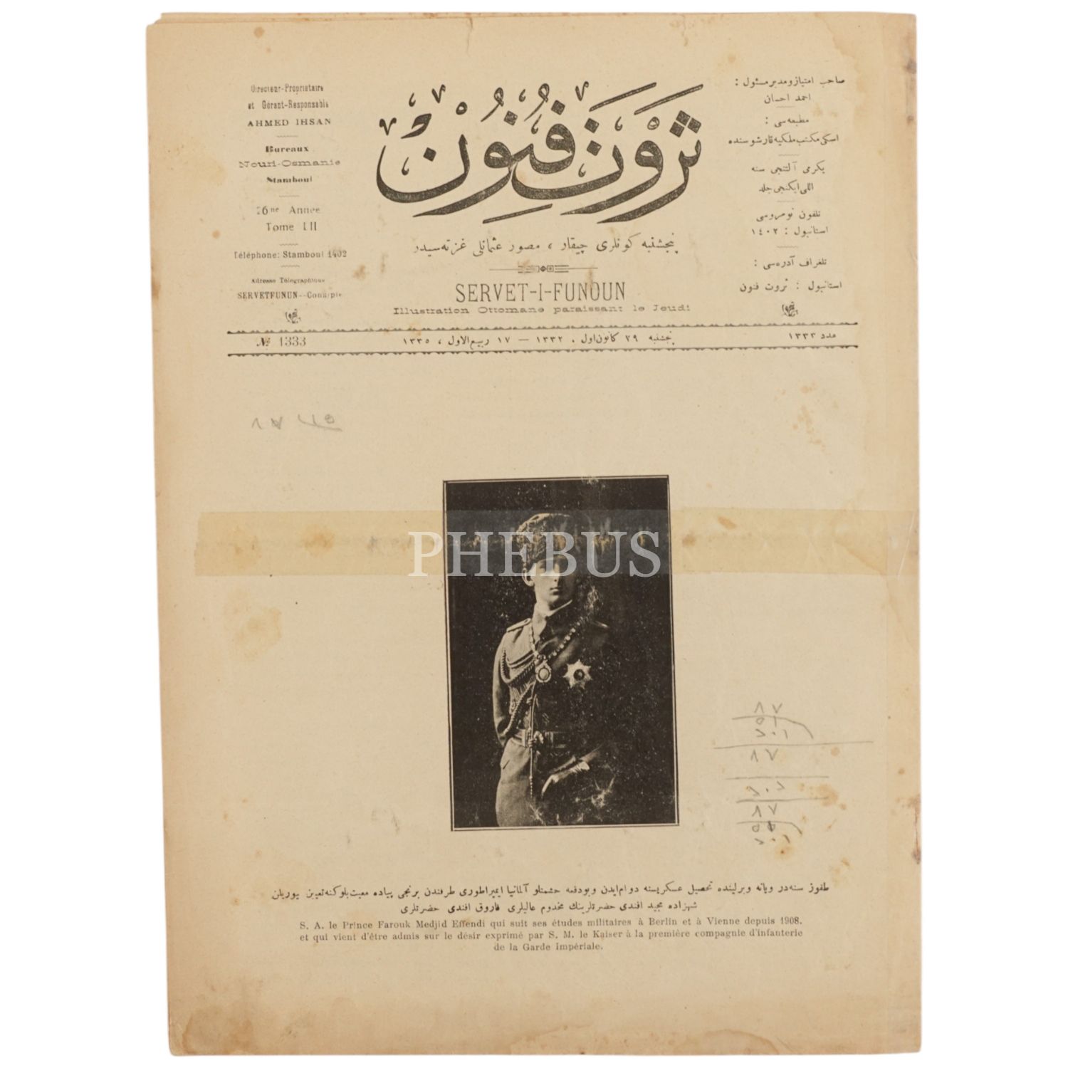 Şehzade Ömer Faruk Efendi´nin fotoğrafına kapağında yer veren SERVET-İ FÜNUN dergisinin 29 Kânunuevvel 1332 tarihli nüshası, 24x33 cm...