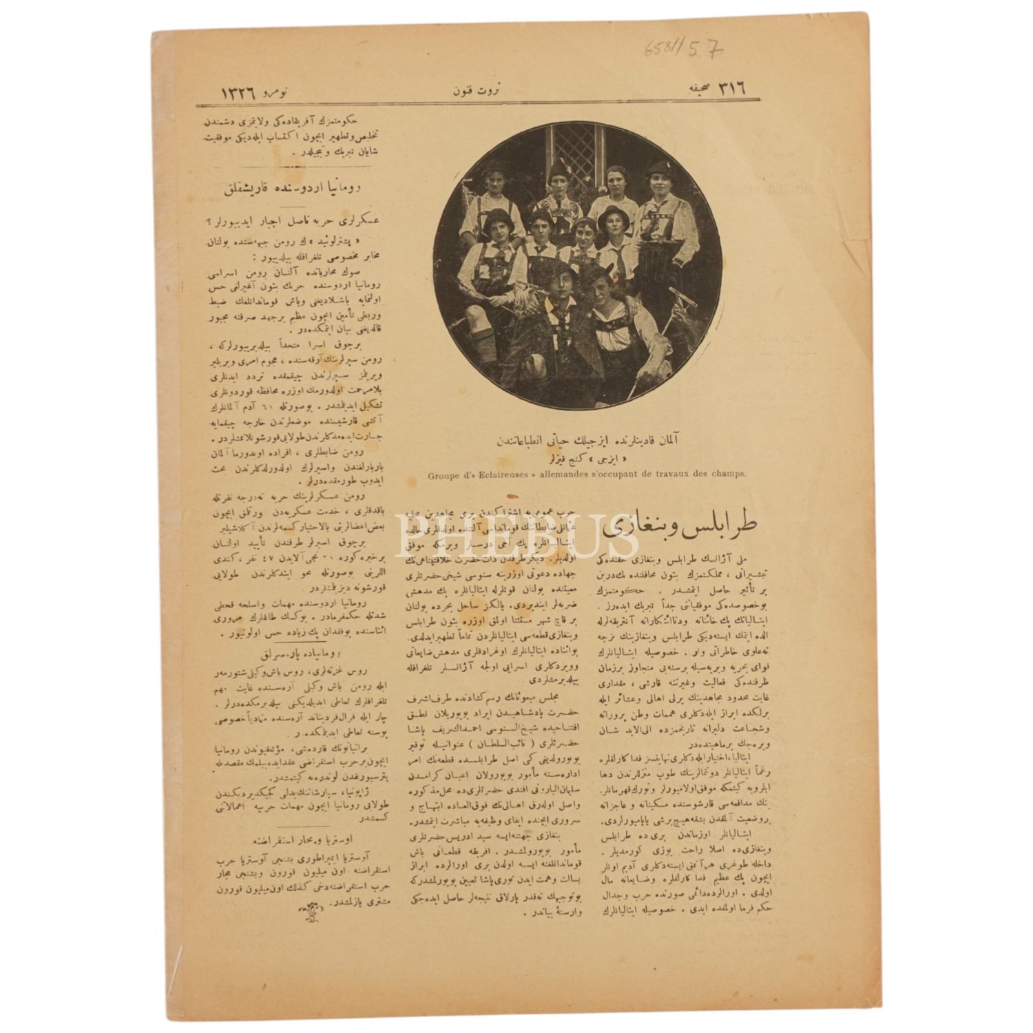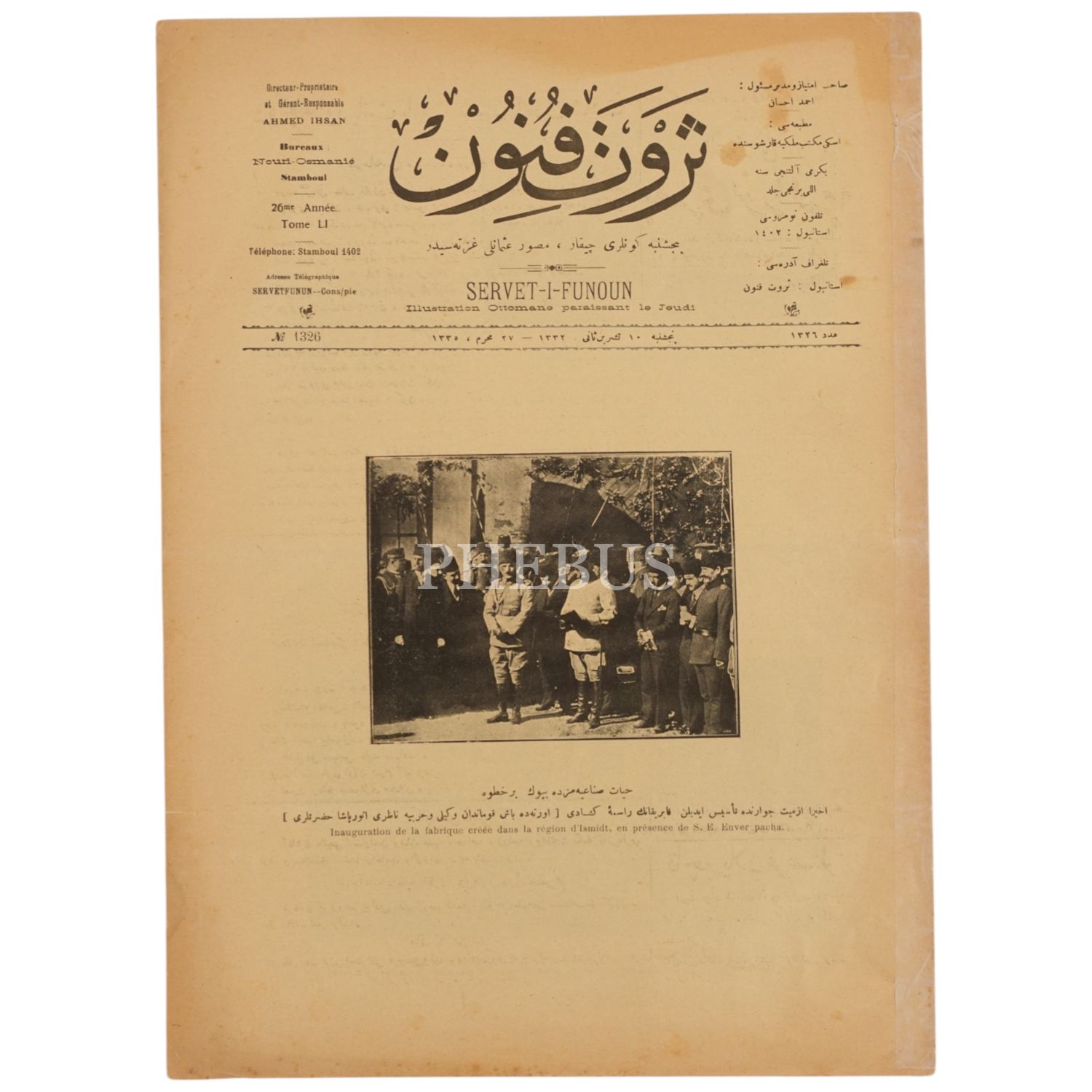Başkumandan vekili ve Harbiye Nazırı Enver Paşa´nın iştirakiyle gerçekleşen İzmit Silah Fabrikası´nın açılışından bir fotoğrafa kapağında yer veren SERVET-İ FÜNUN dergisinin 10 Teşrinisani 1332 tarihli nüshası, 25x34 cm...