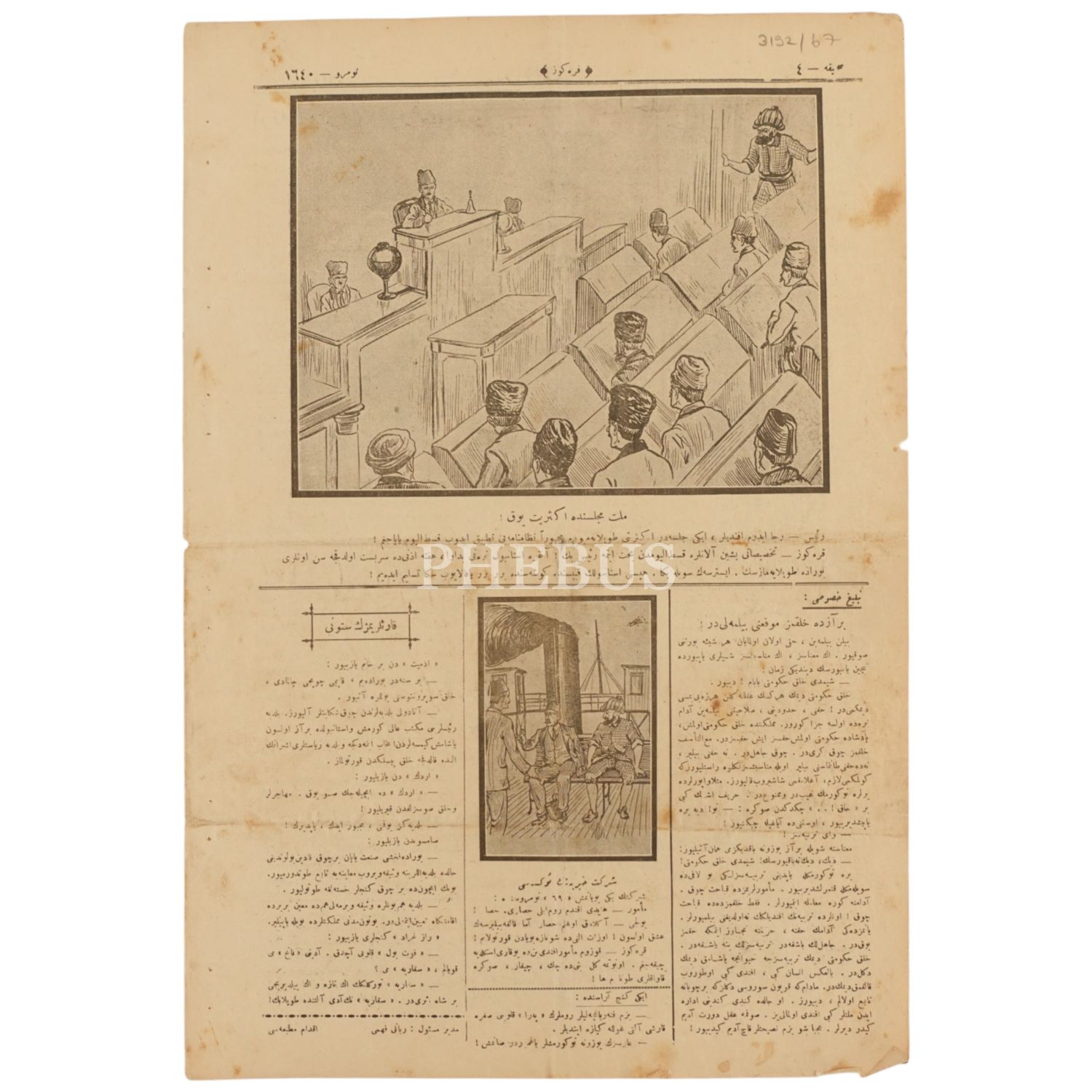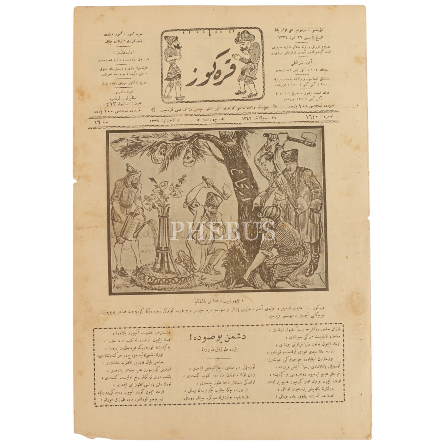 Kapağında Mustafa Kemal Atatürk´ün irtica ağacının kesilmesini emrederken tasvir edildiği bir karikatüre yer verilen KARAGÖZ dergisinin 5 Kânunuevvel 1339 tarihli nüshası, 28x40 cm...