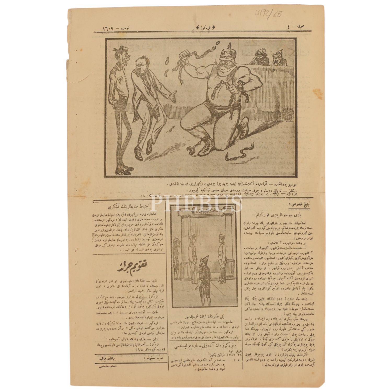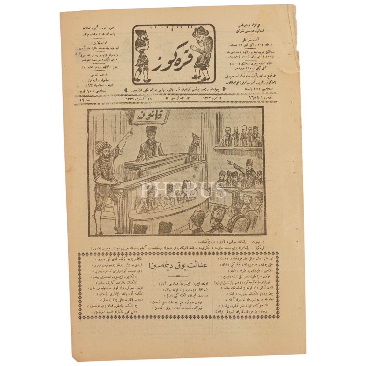 Mustafa Kemal Atatürk´ün meclis başkanlığı koltuğunda tasvir edildiği bir karikatüre kapağında yer veren KARAGÖZ dergisinin 18 Ağustos 1339 tarihli nüshası, 28x40 cm...