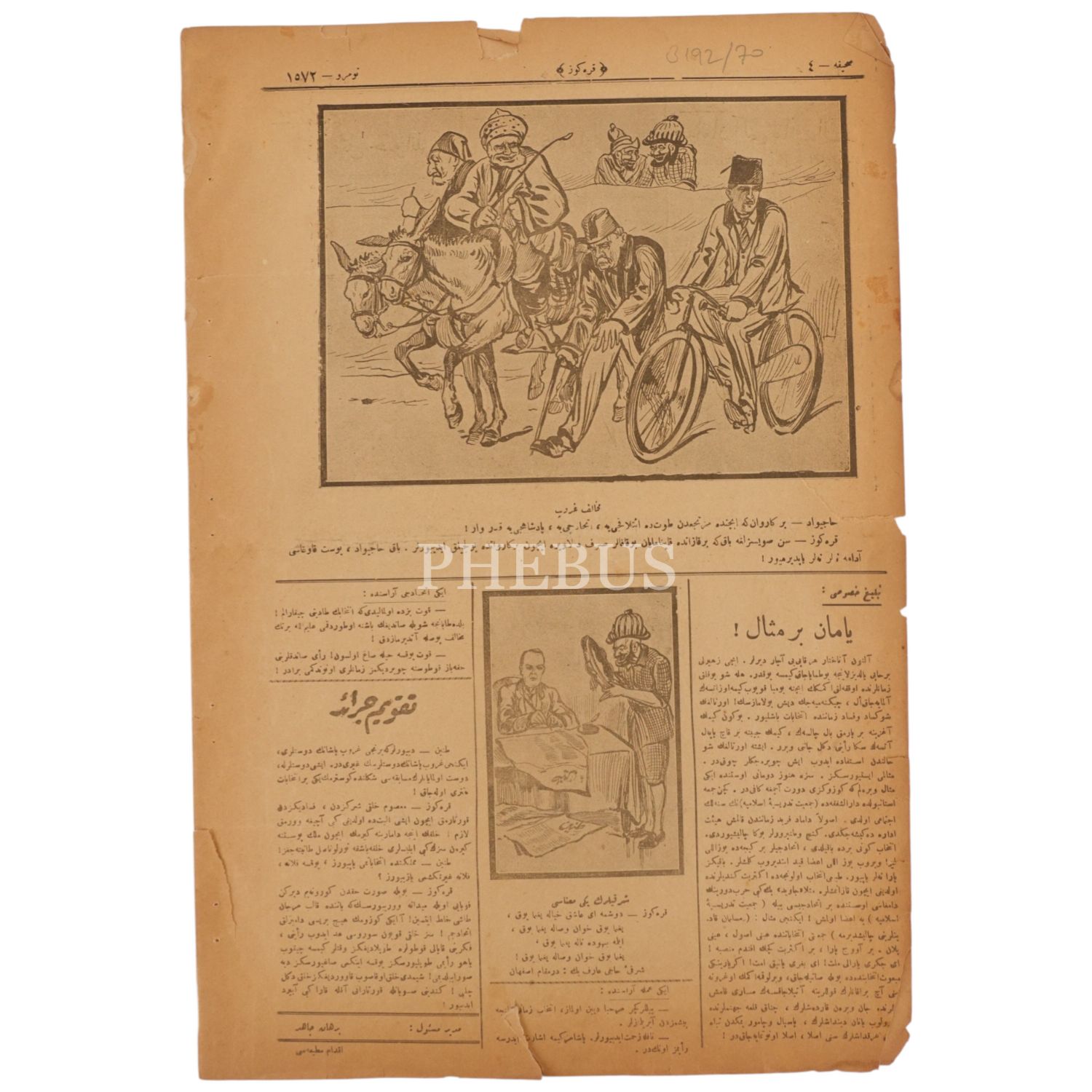 Kapağında Mustafa Kemal Atatürk´ün omuzlarda taşınırken tasvir edildiği KARAGÖZ dergisinin 11 Nisan 1339 tarihli nüshası, 28x40 cm...