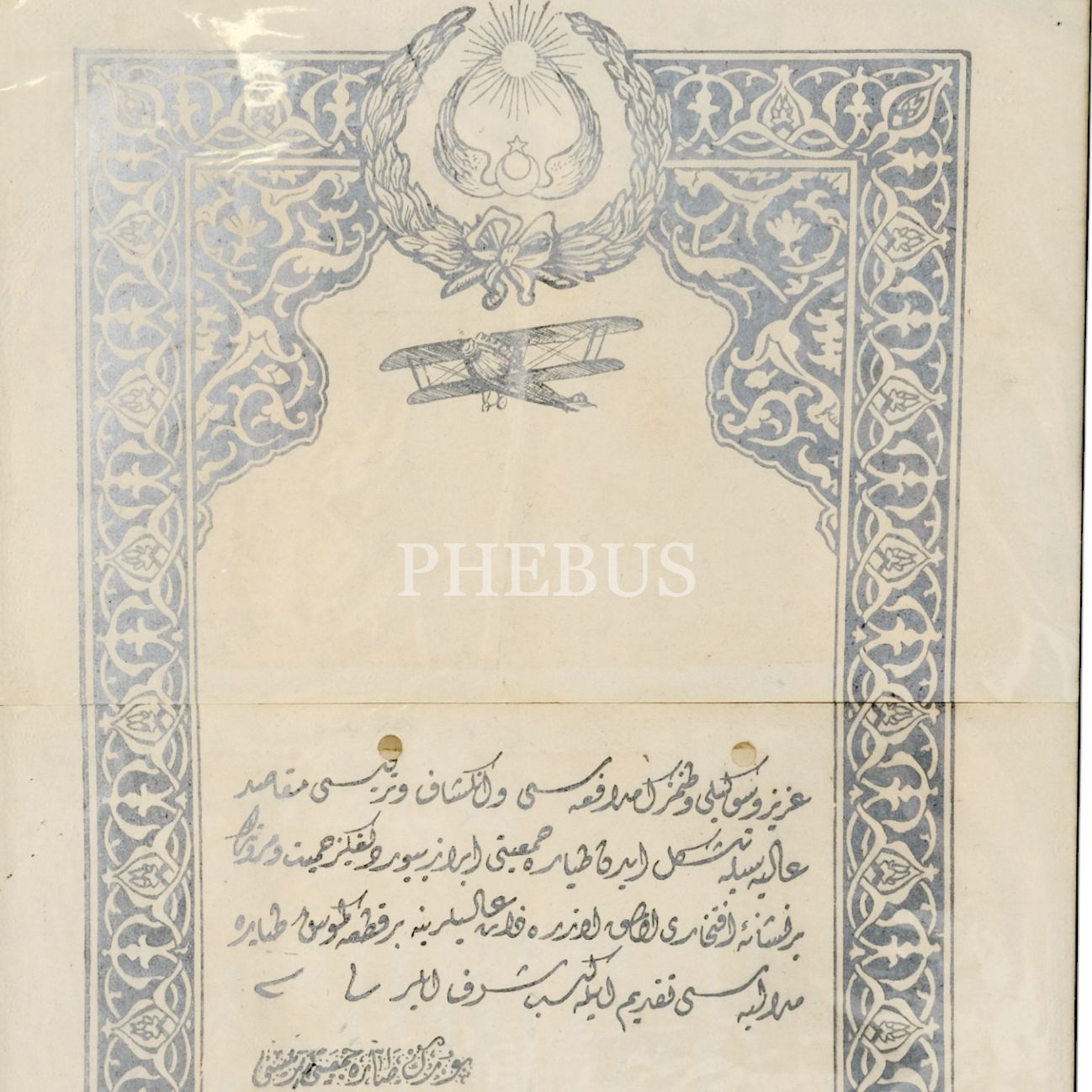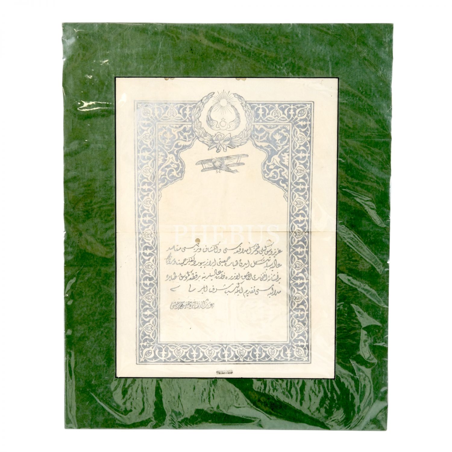 Türk Tayyare Cemiyeti tarafından verilen Gümüş Tayyare Madalyası´nın beratı, 37x46 cm...