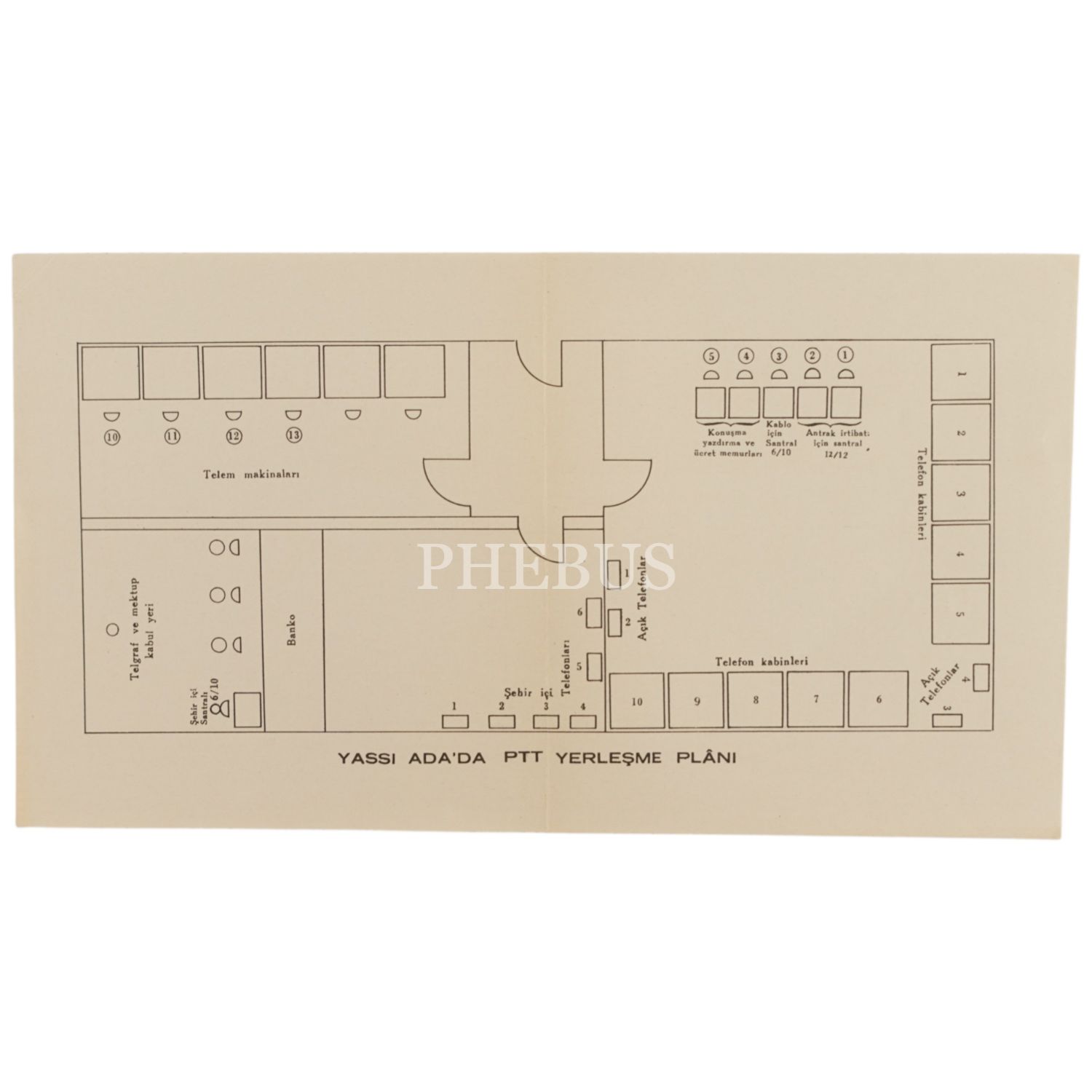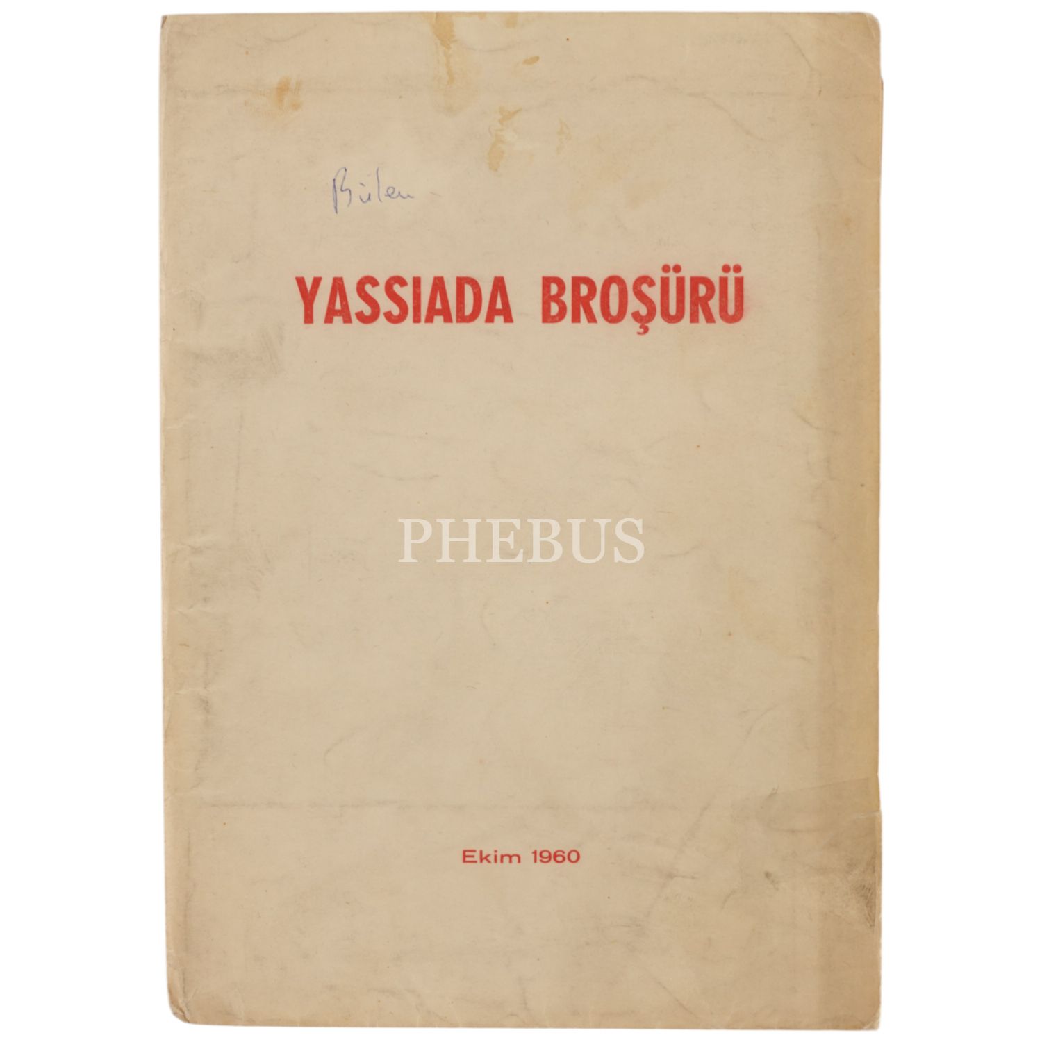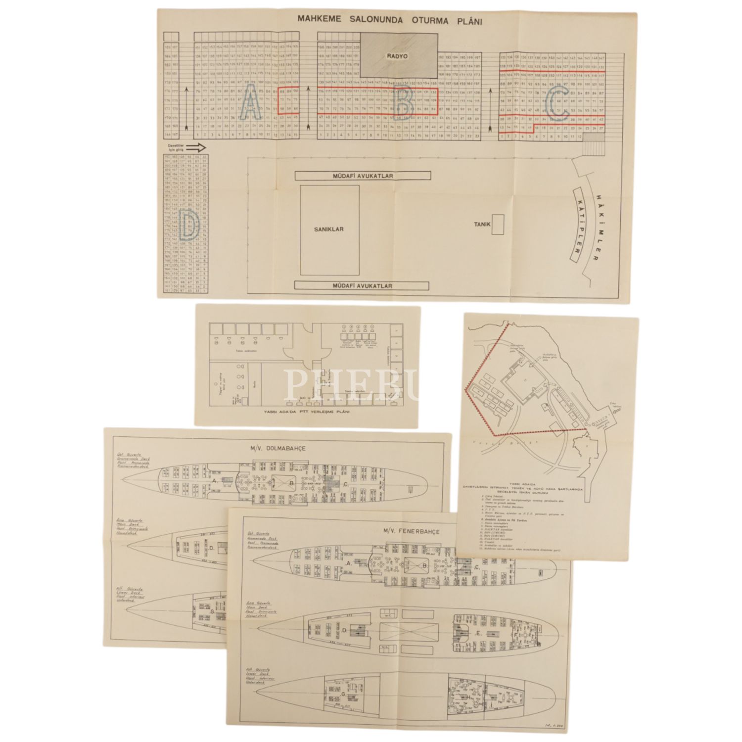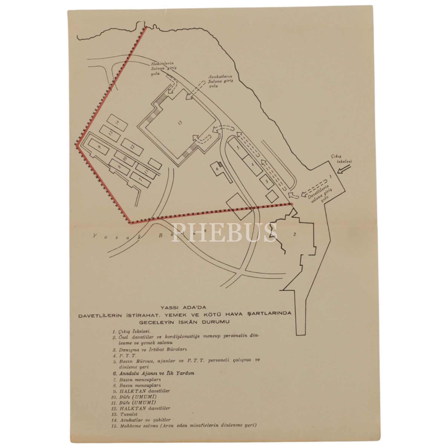 27 Mayıs 1960 darbesinden sonra Demokrat Parti yönetiminin yargılandığı Yassıada Yargılamaları´na ait Ekim 1960´da yayınlanmış YASSIADA BROŞÜRÜ, Ayrıca M/V Fenerbahçe ve M/V Dolmabahçe gemilerinde oturma planı, Yassıada PTT yerleşkesi, Mahkeme Salonu´nda oturma planı ve kötü hava şartlarında iskan durumunun planı mevcuttur.