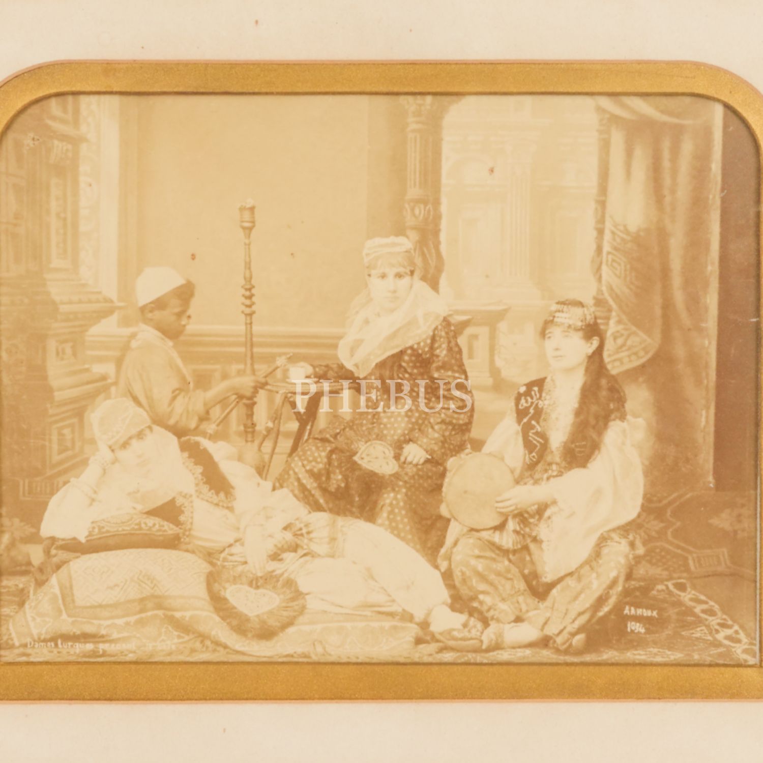 Mısır´da yerleşik Fransız fotoğrafçı Arnoux Hippolyte tarafından çekilen, kahve içen Türk kadınları temalı stüdyo fotoğrafı, albümin baskı, floral desenlerle bezeli göz alıcı dönem çerçevesinde, "Dames turques prenant le Cafe", fotoğraf 28x20 cm, çerçeve 67x64 cm...