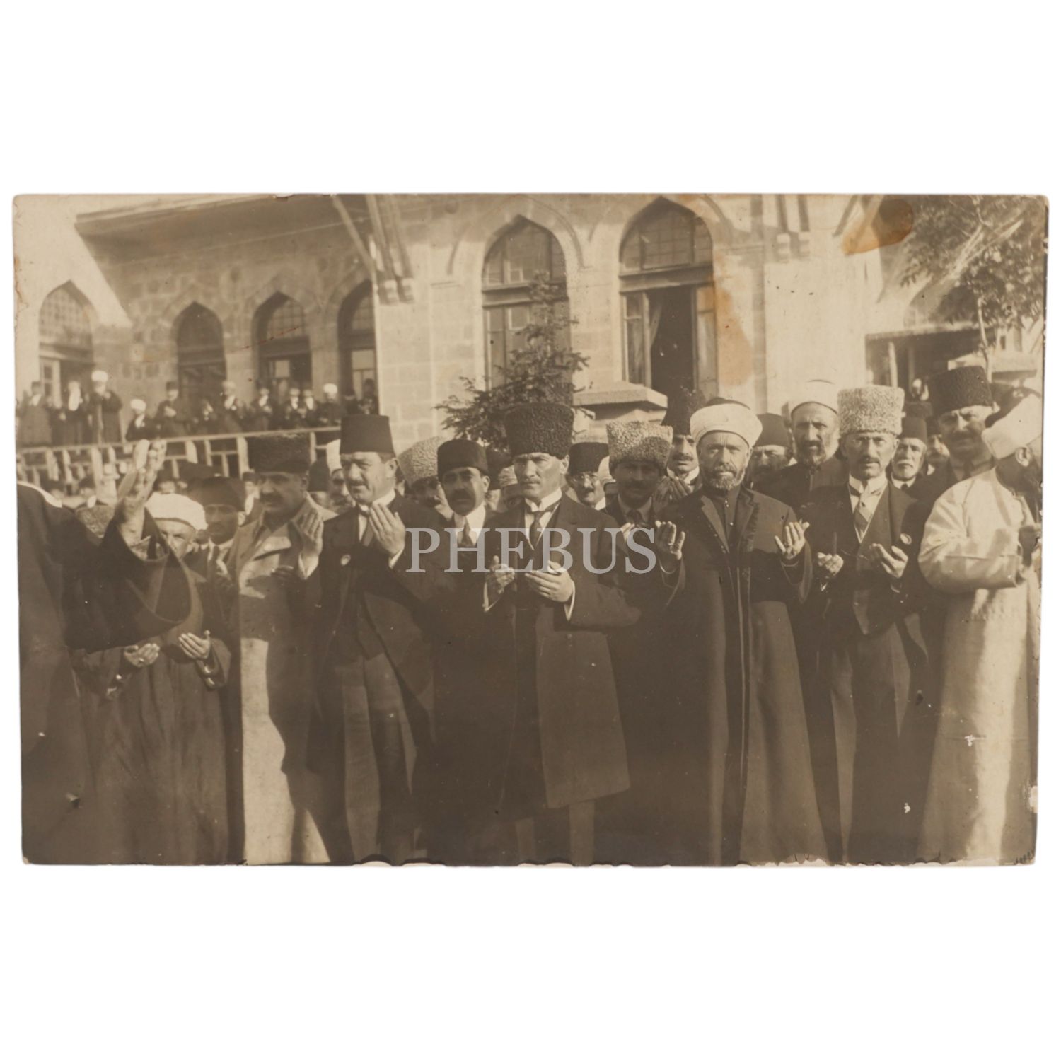 Mustafa Kemal Atatürk, Mareşal Fevzi Çakmak ve Rauf Orbay I. Meclis binası önünde Ramazan bayramı sebebiyle Türk ordularının muzafferiyeti için dua ederken, 14x9 cm...