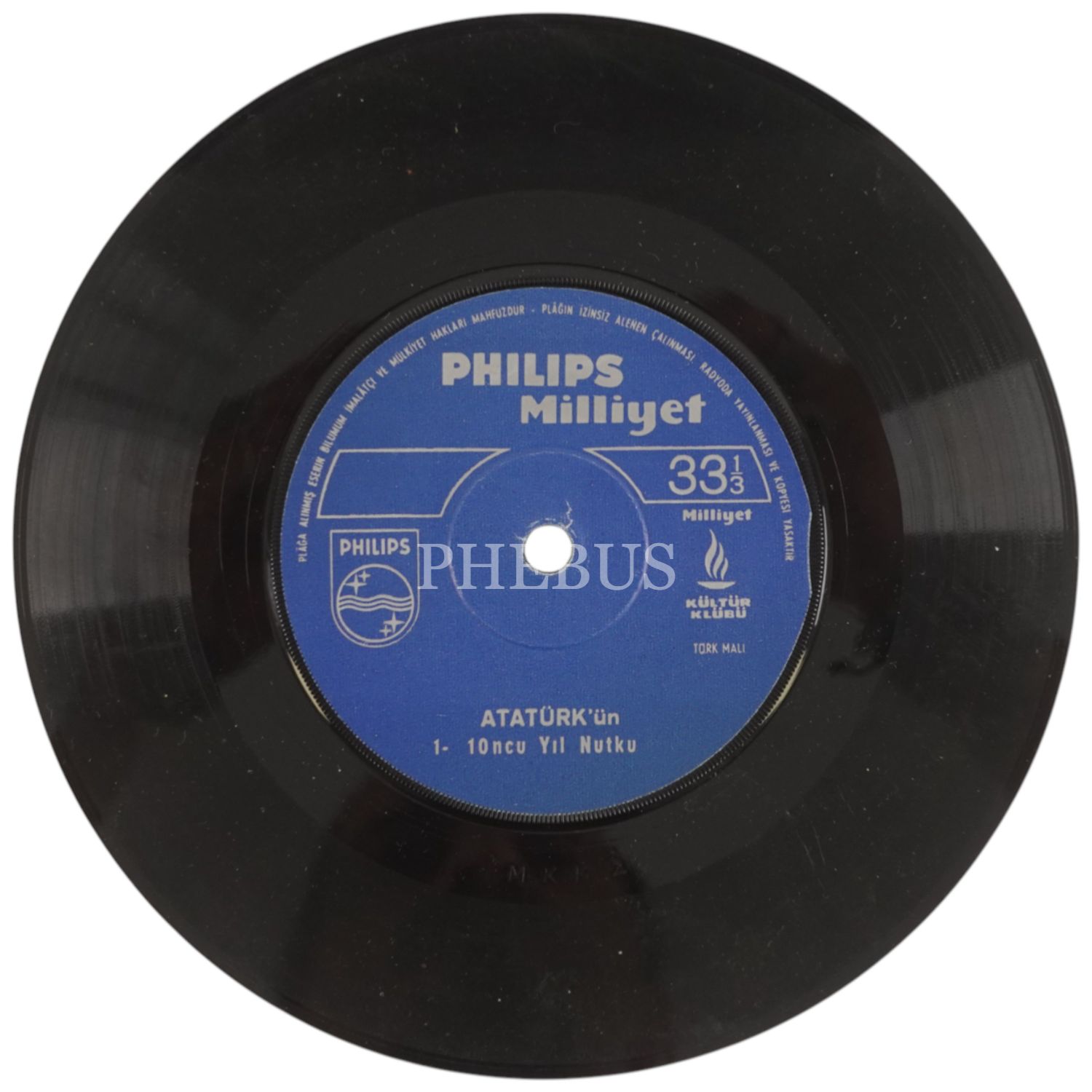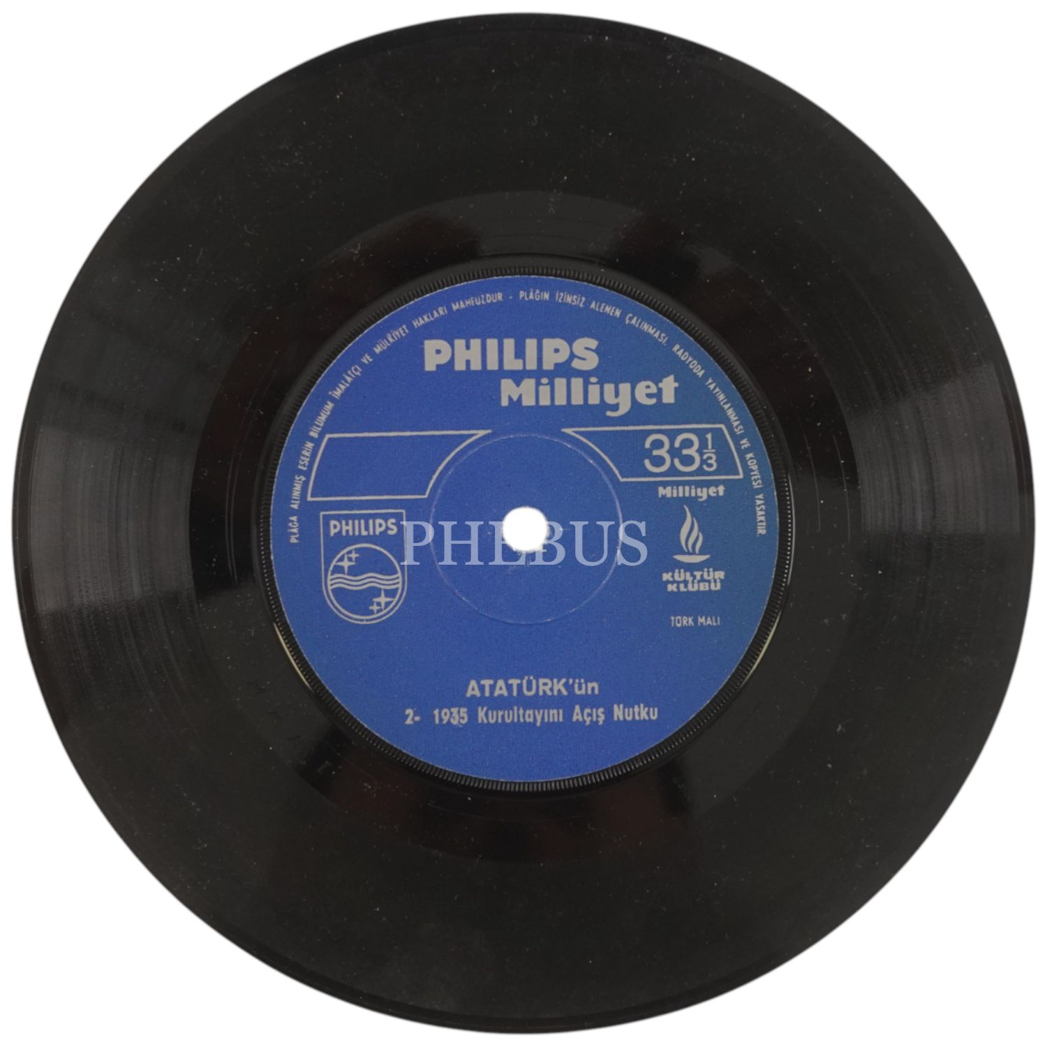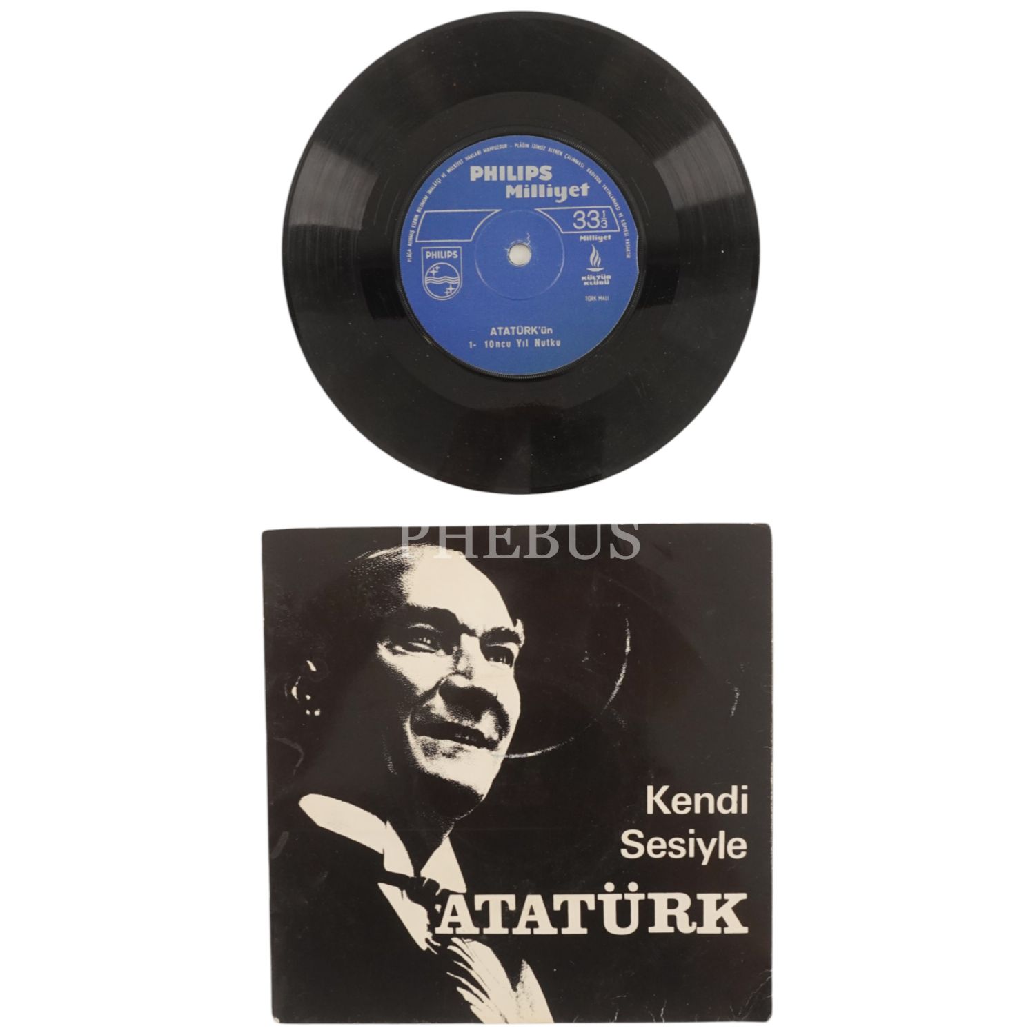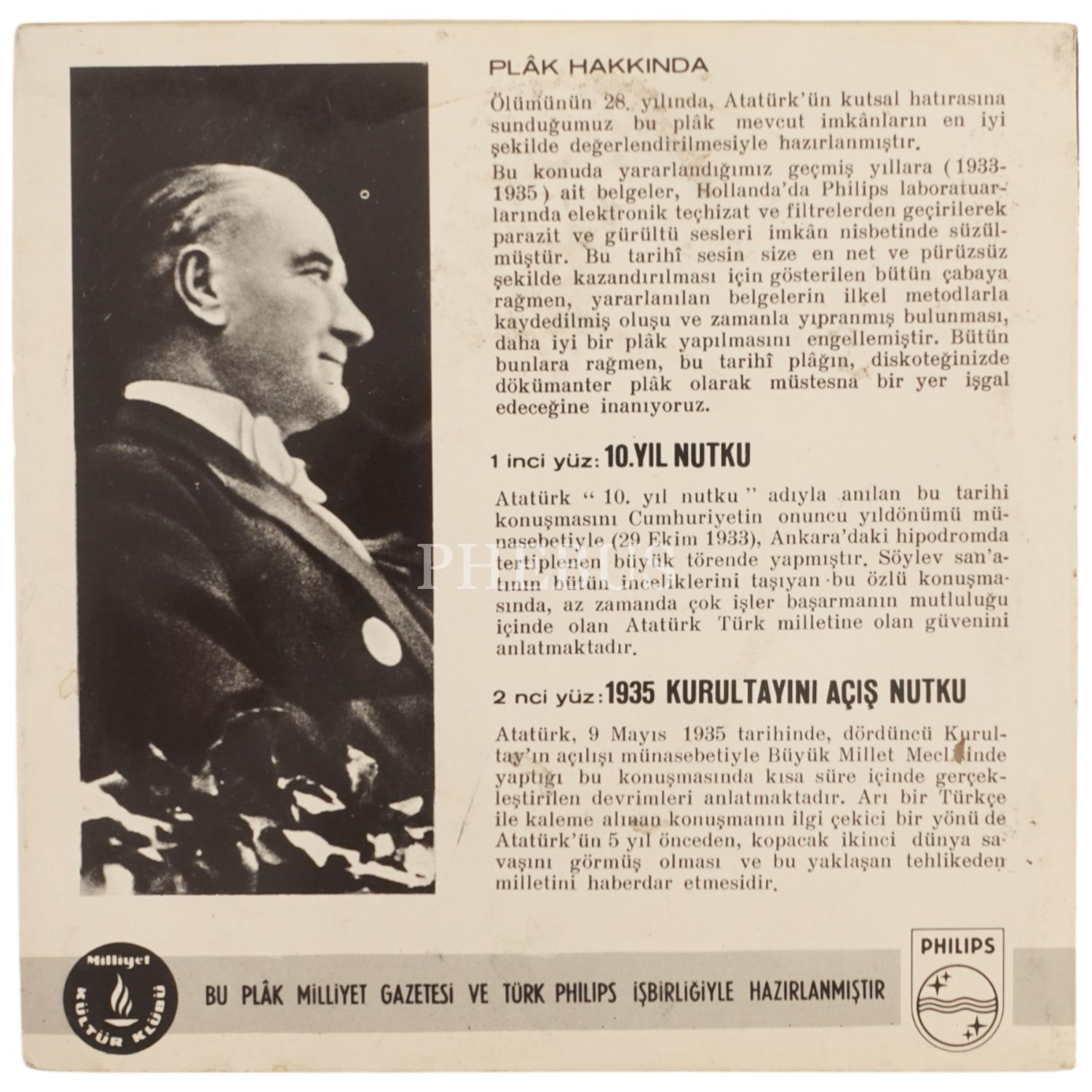 Kendi Sesiyle Atatürk plağı [10. Yıl Nutku ve 1935 Kurultayı´nın Açılışı], 33´lük, Milliyet Gazetesi ve Türk Philips işbirliği ile hazırlanmış, 19x19 cm...
