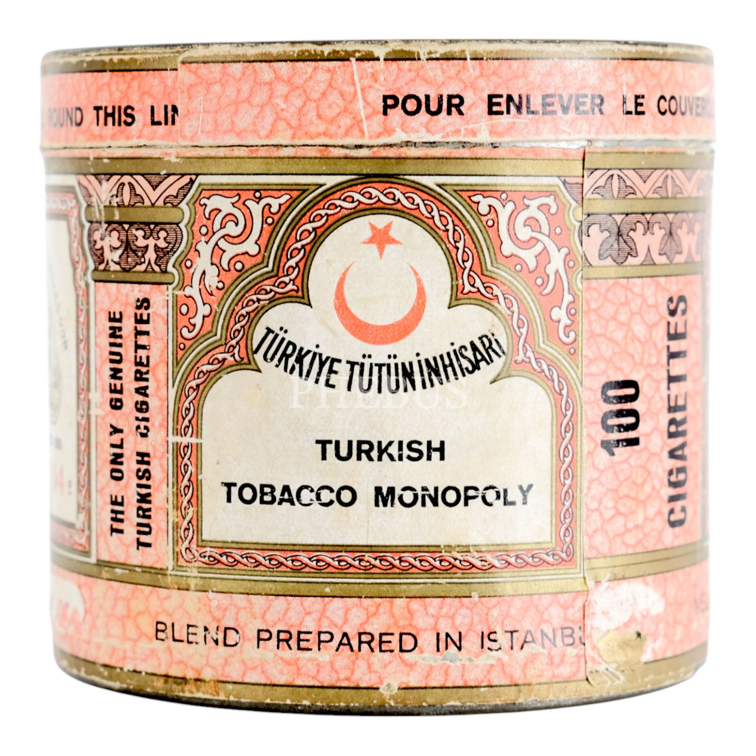 Türkiye Tütün İnhisarı sigaralarının İngilizce ve Türkçe etiketli teneke kutusu, 10x8 cm...