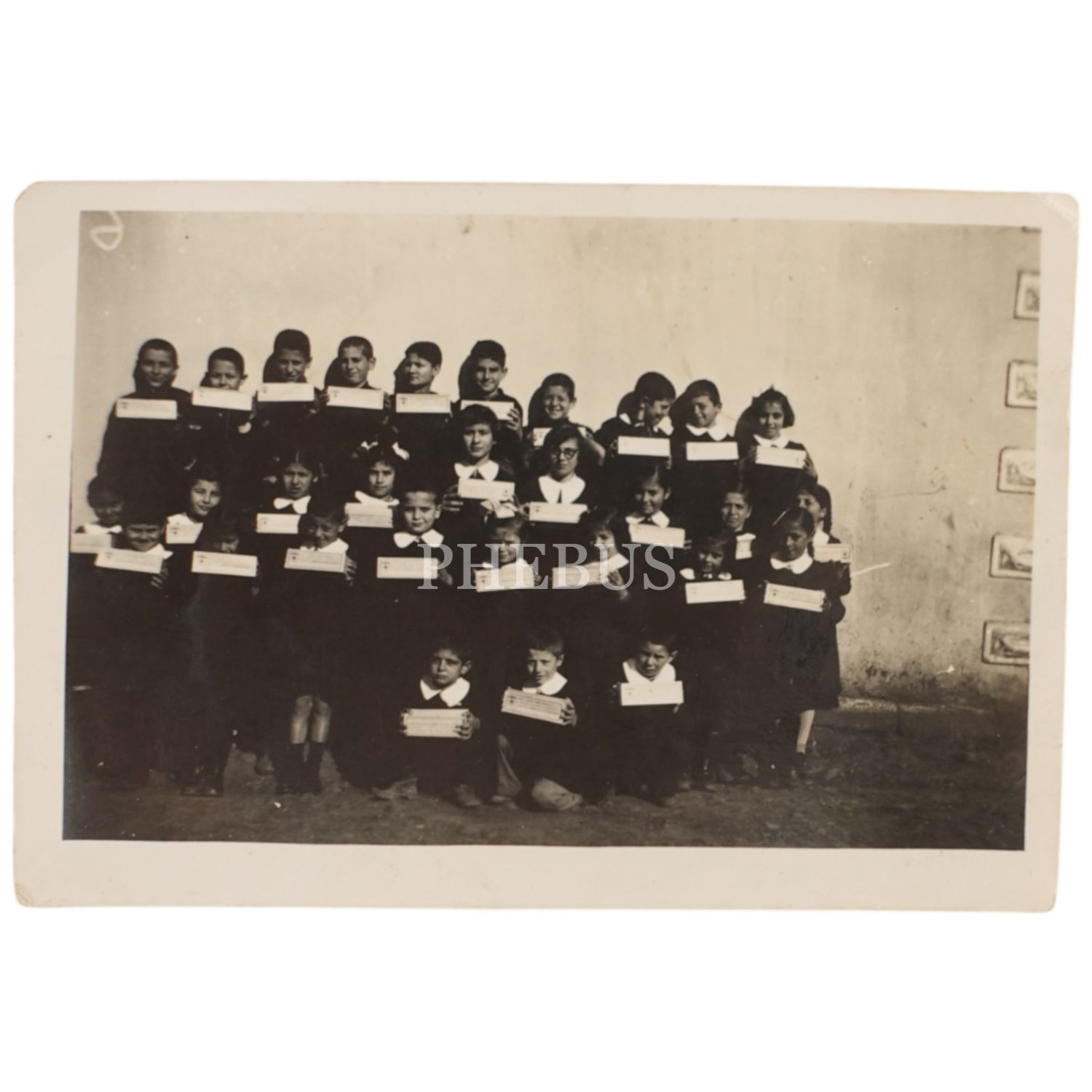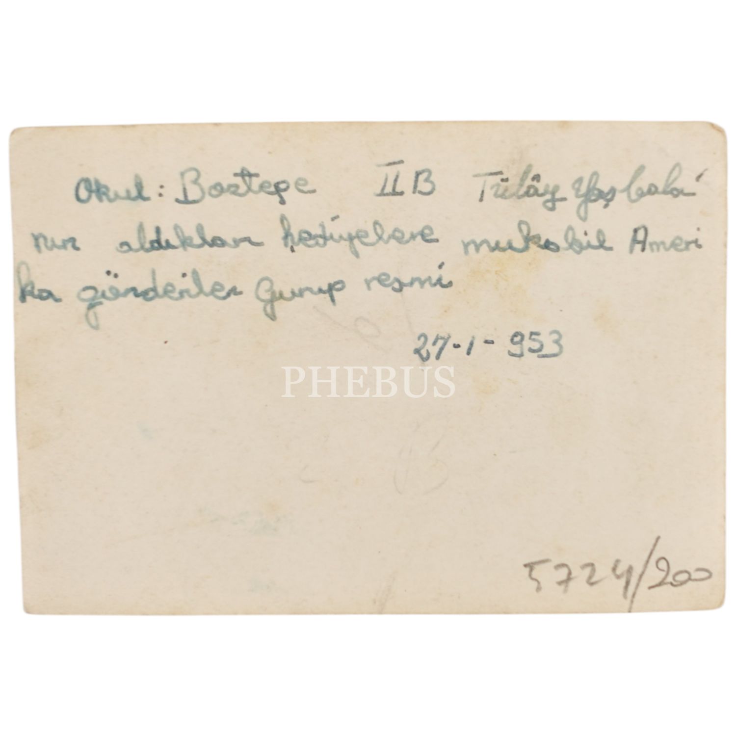 1953 yılında Amerika´dan gelen yardımlara teşekkür etmek amacıyla kamera karşısına geçen Boztepe İlkokulu öğrencileri, 9x6 cm...