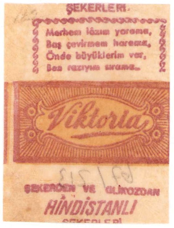 Victoria Şekerleri etiketi, "Merhaba lazım yarama, Ben çevirmem harama, Önde büyüklerim var, Ben razıyım sırama", 4x6 cm