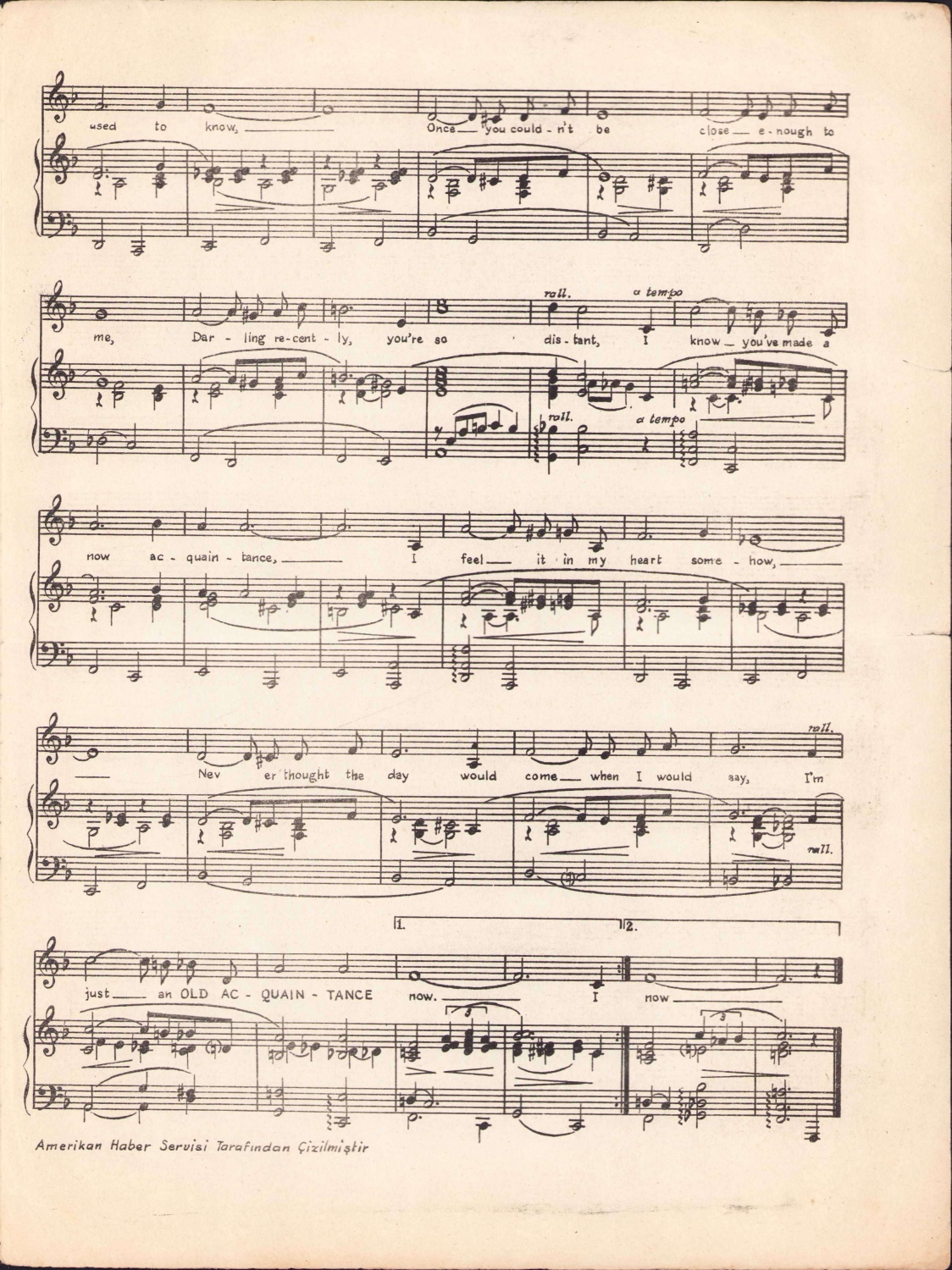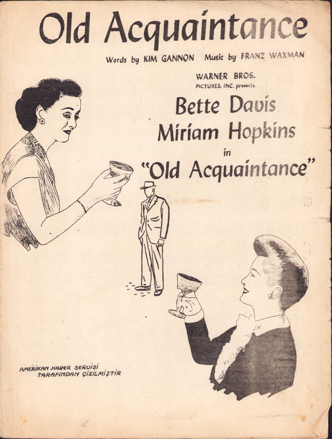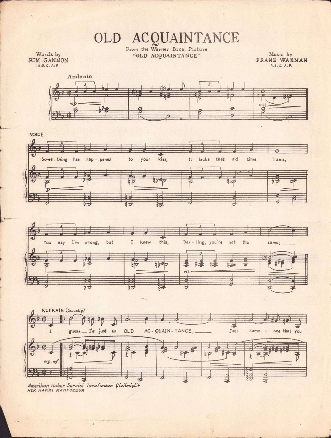 Müzik, Old Acquaintance şarkı notası, söz Kim Gannon, müzik Franz Waxman, Amerikan haber servisi tarafından çizilmiştir. 4 sayfa, 22x31 cm