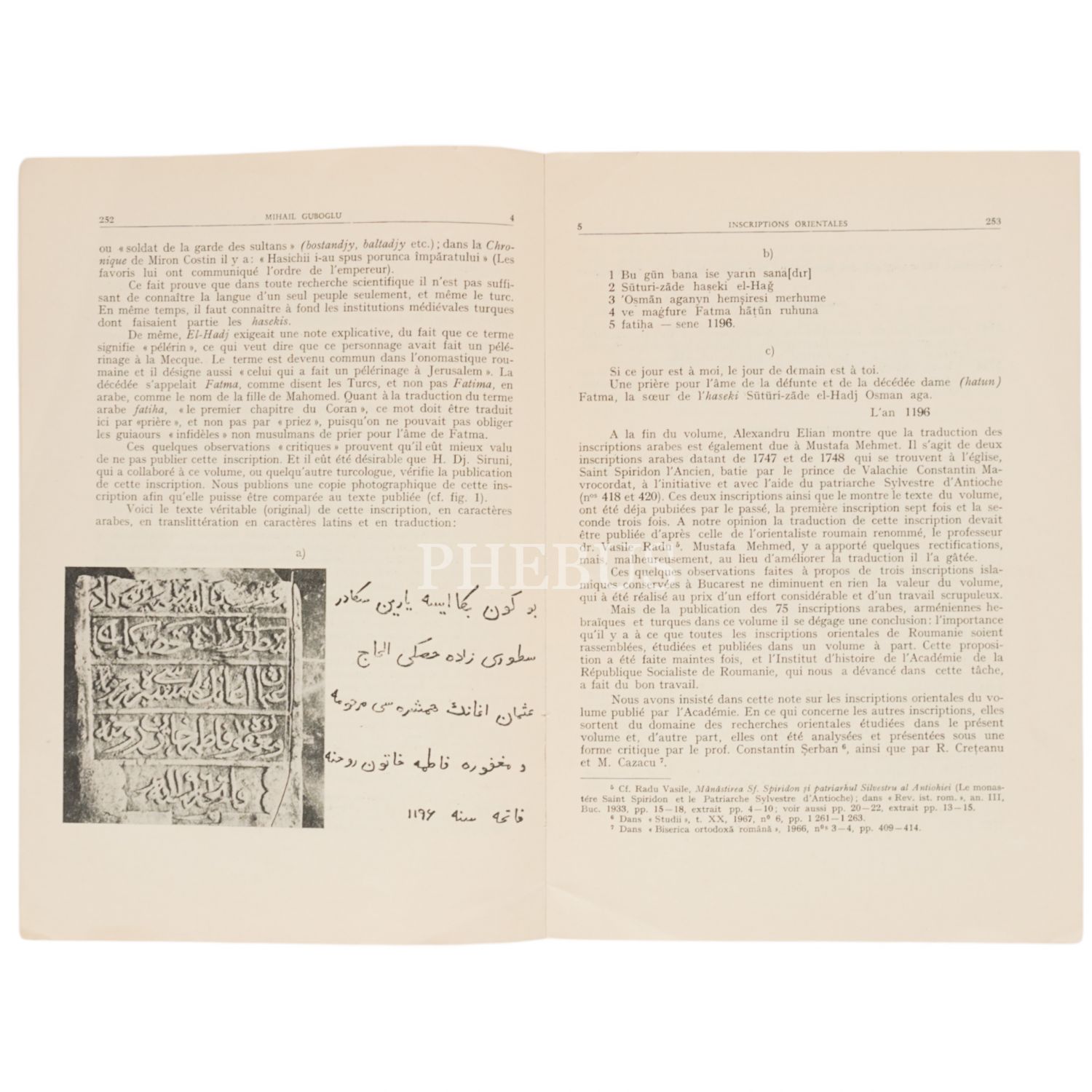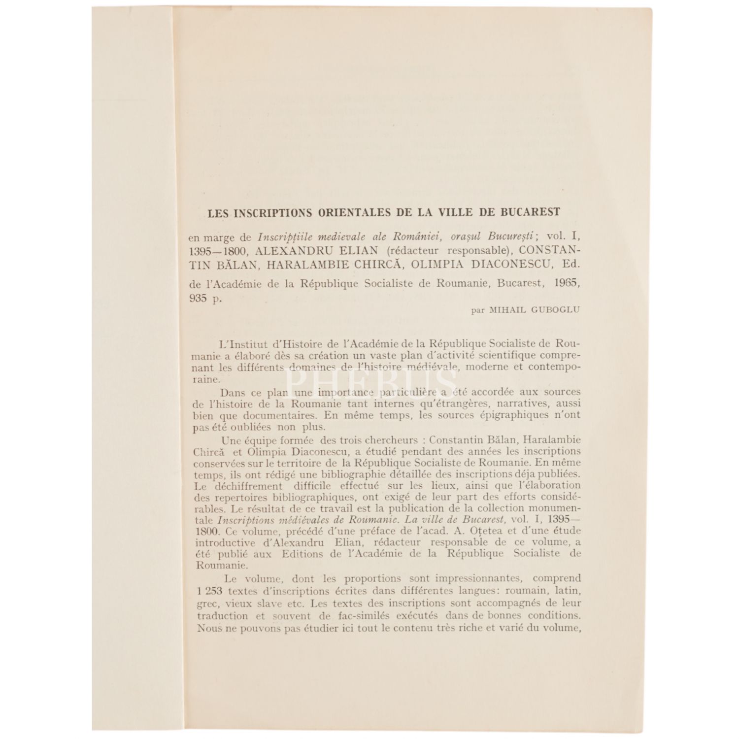 LES INSCRIPTIONS ORIENTALES DE LA VILLE DE BUCAREST, Mihail Guboğlu, 1968, Studia Et Acta Orientalia (Bükreş), 8 sayfa, 17x24 cm...
