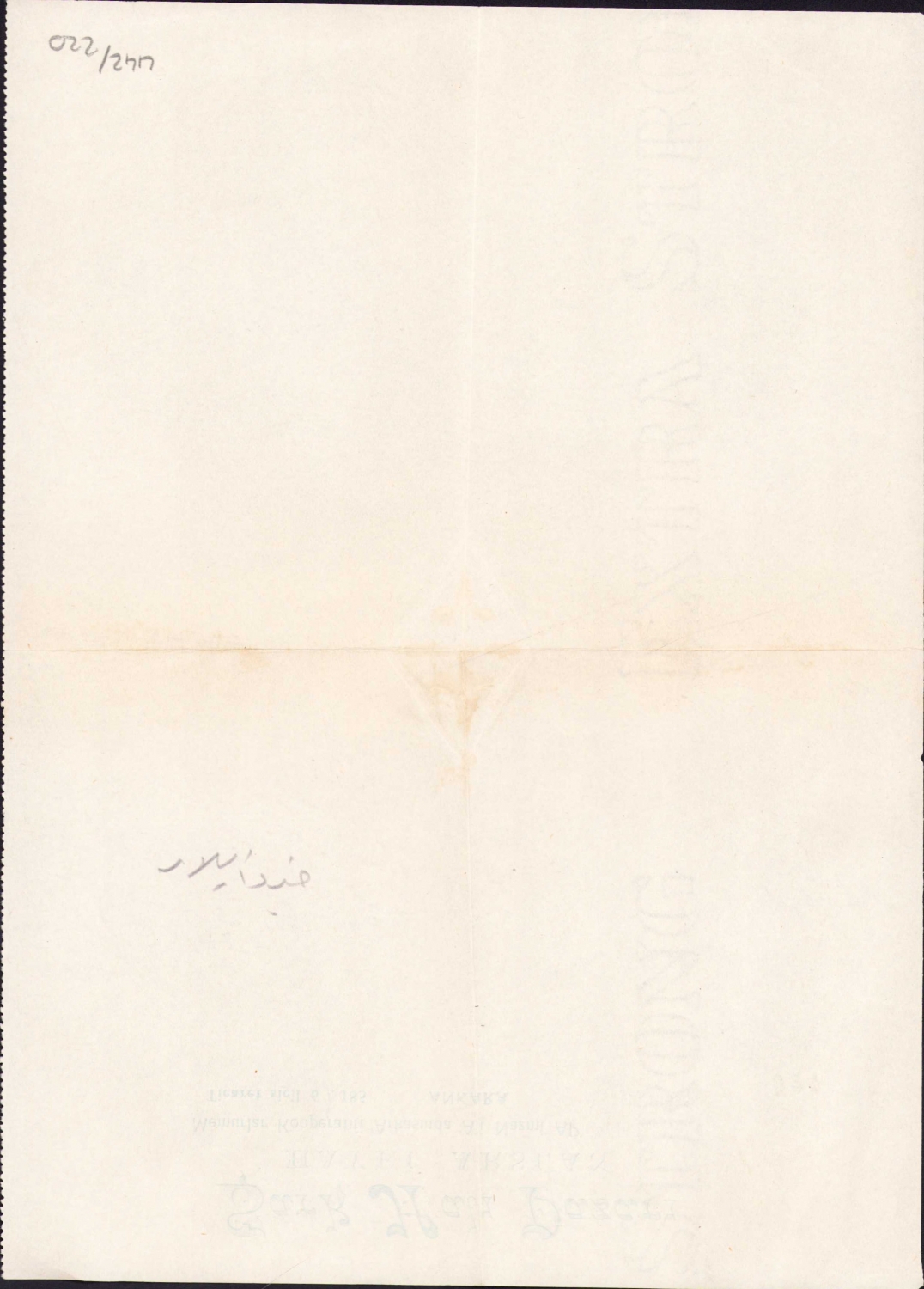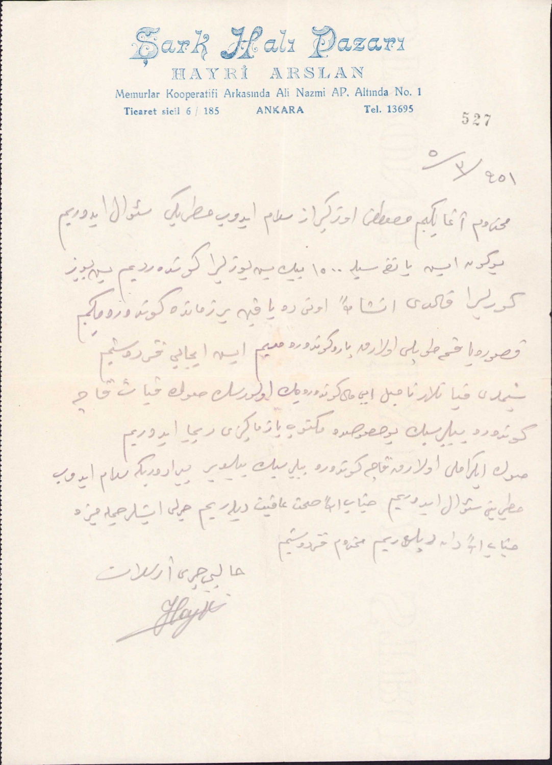 Hayri Aslan Şark Halı Pazarı antetli doküman, Osmanlıca yazılı, 20x28 cm
