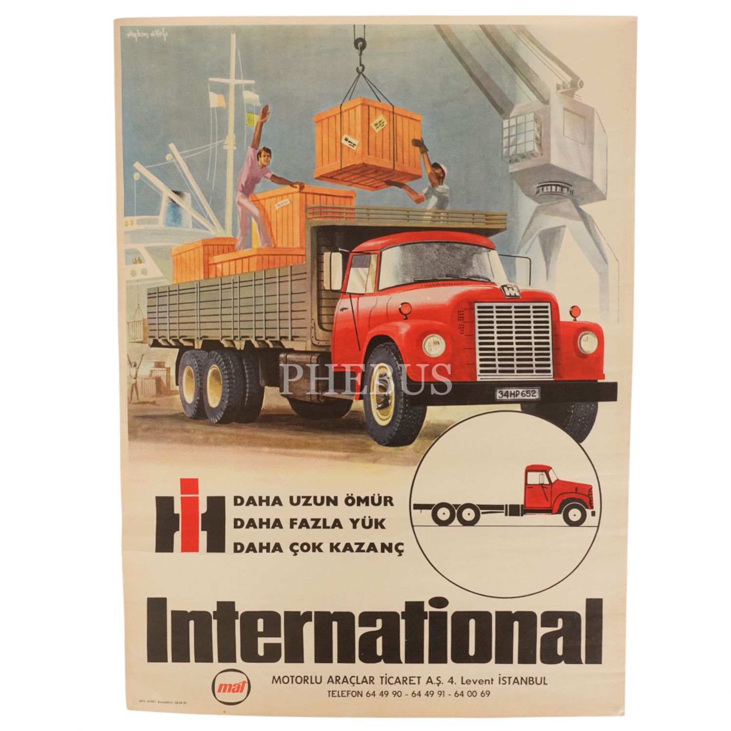 Ziraat Bankası´nın ambleminin de tasarımcısı Ayhan Akalp tarafından tasarlanan International marka kamyonların tanıtım afişi, 49x67 cm...