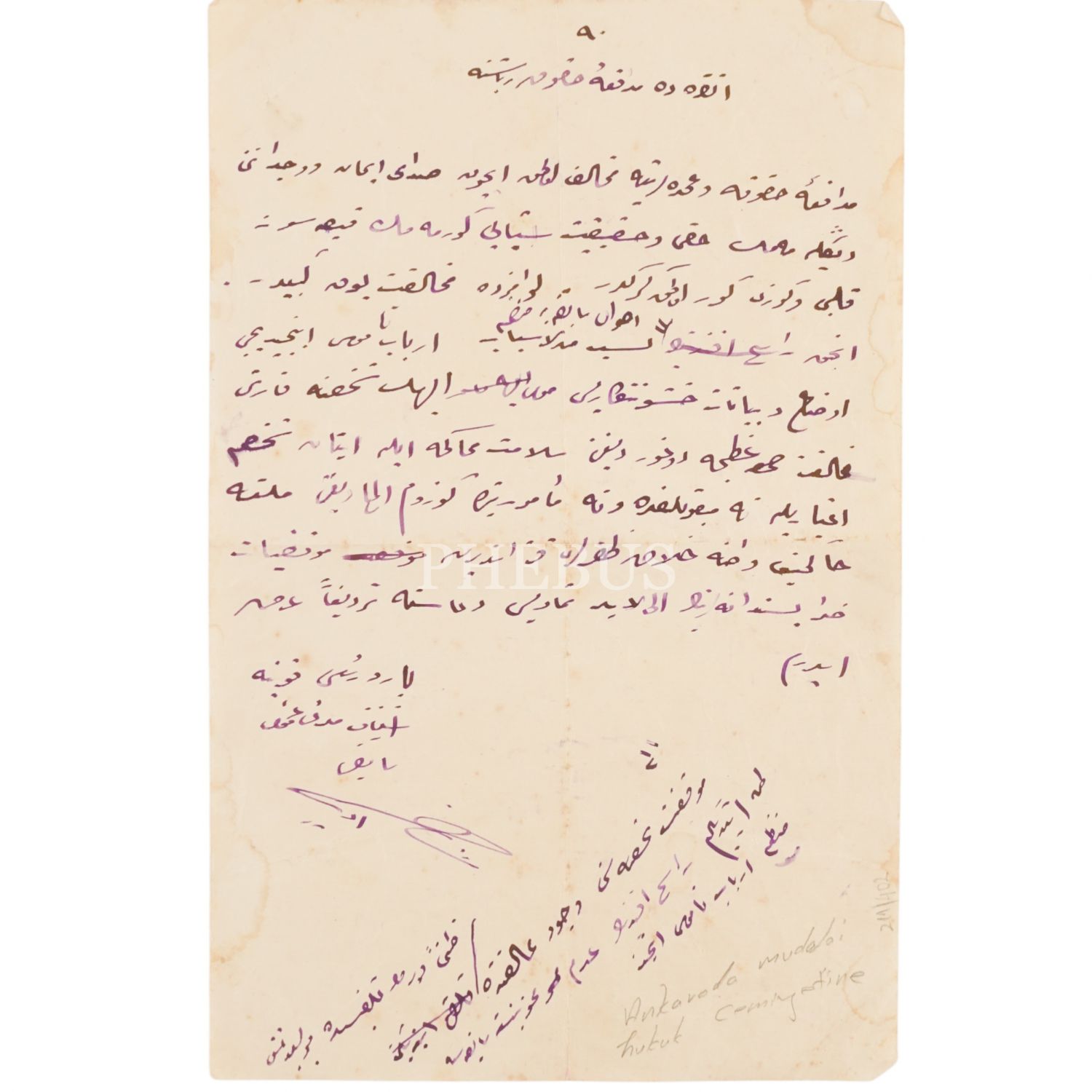 Konya´da görev yapmış bir savcının Ankara Müdafaa-i Hukuk Cemiyeti´ne hitaben, yargılanan Rasih Bey´in namuslu bir vatandaş olduğunu anlatmak için kaleme aldığı mektubu, 20x32 cm...