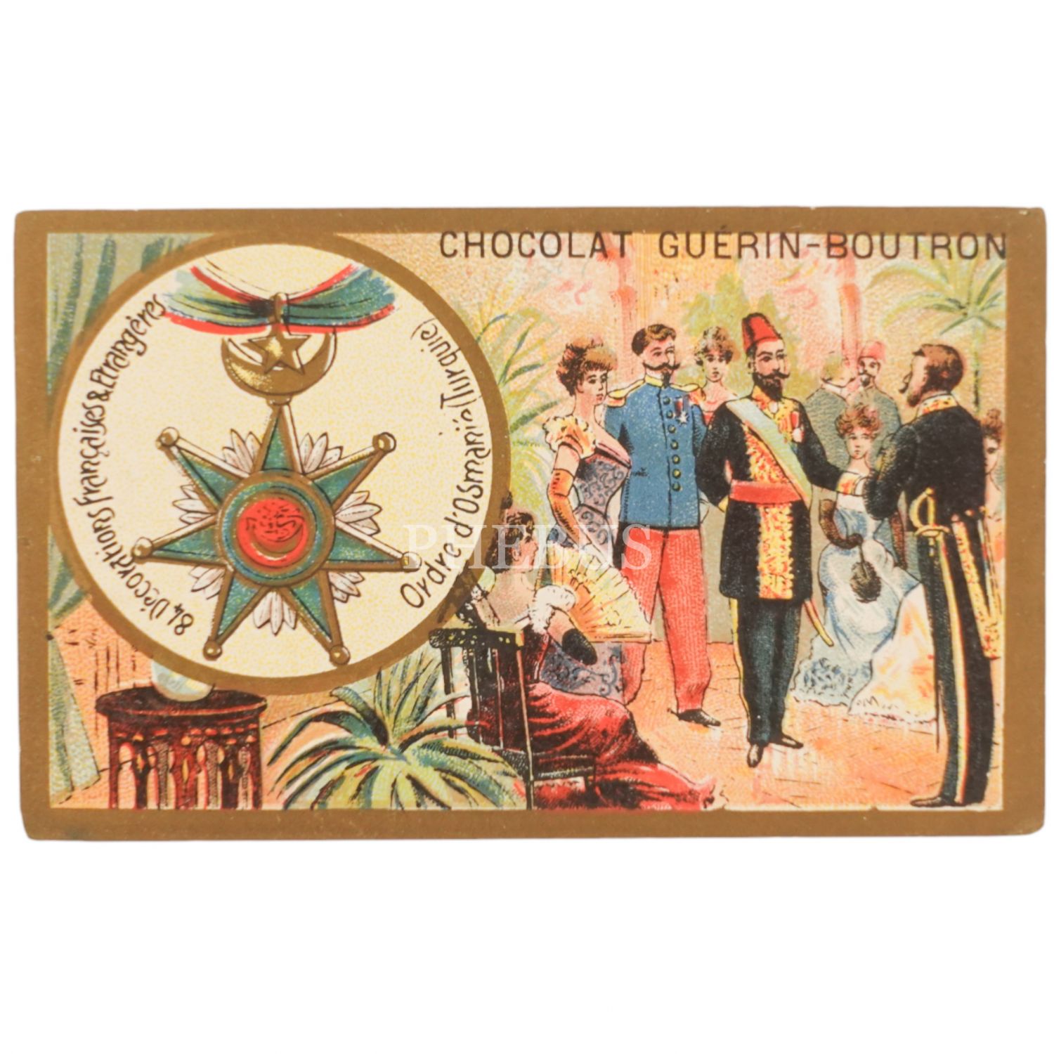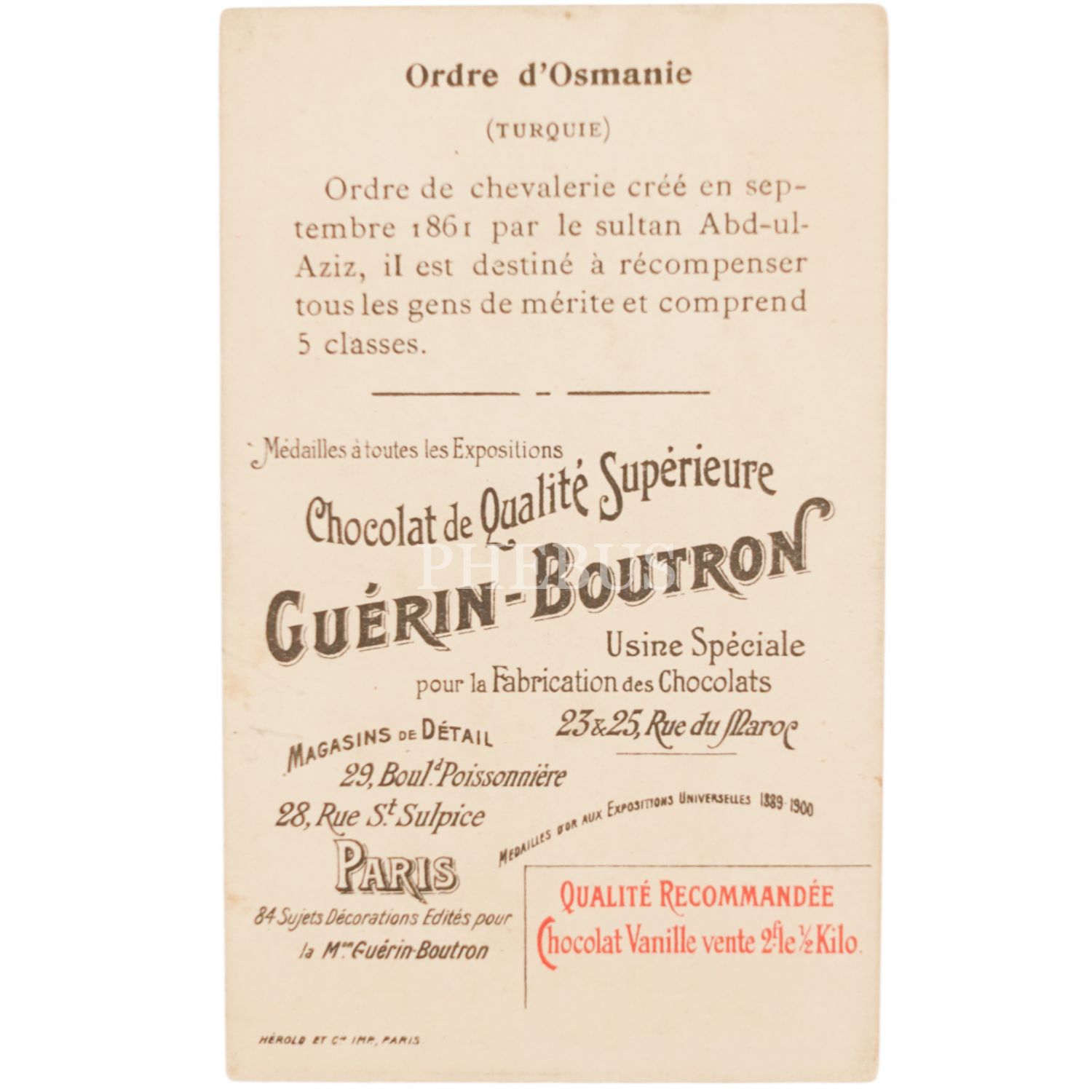 "Chocolat Guerin-Boutron" markasının Osmanlı pazarı için hazırladığı, Osmanlı padişahı çiziminin yer aldığı çikolata kartı, 11x7 cm...