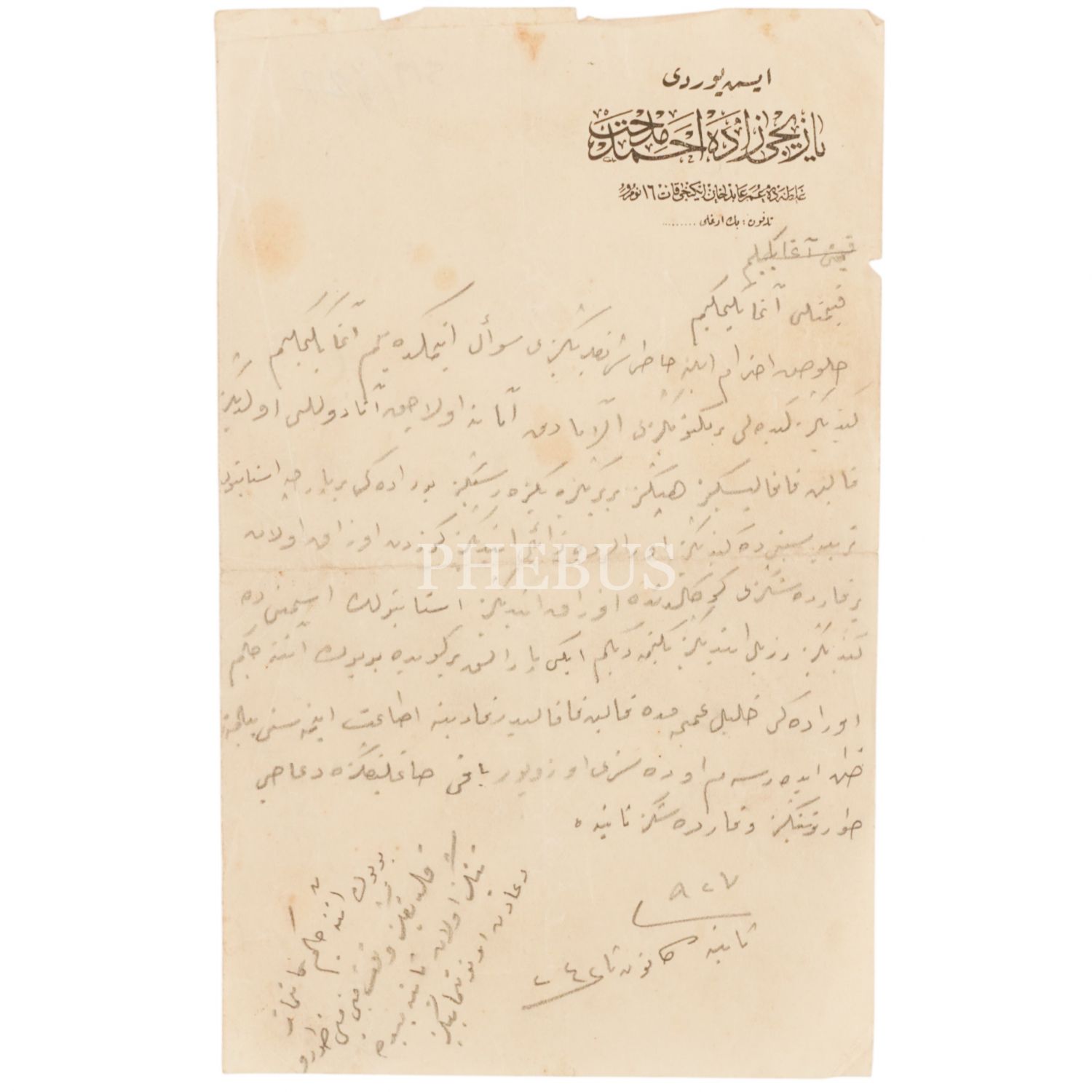 "Yazıcızade Ahmet Mithat Efendi - İş Yurdu" antetli kağıt üzerine kaleme alınmış, 1927 tarihli mektup 14x21 cm...